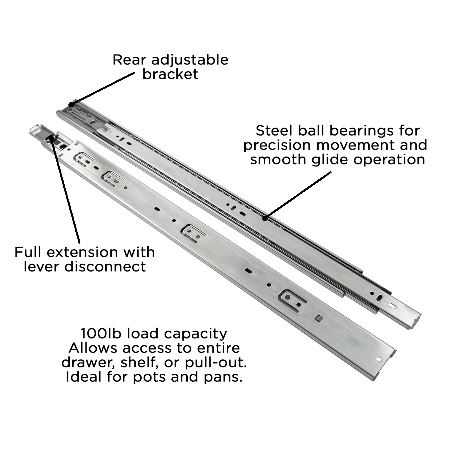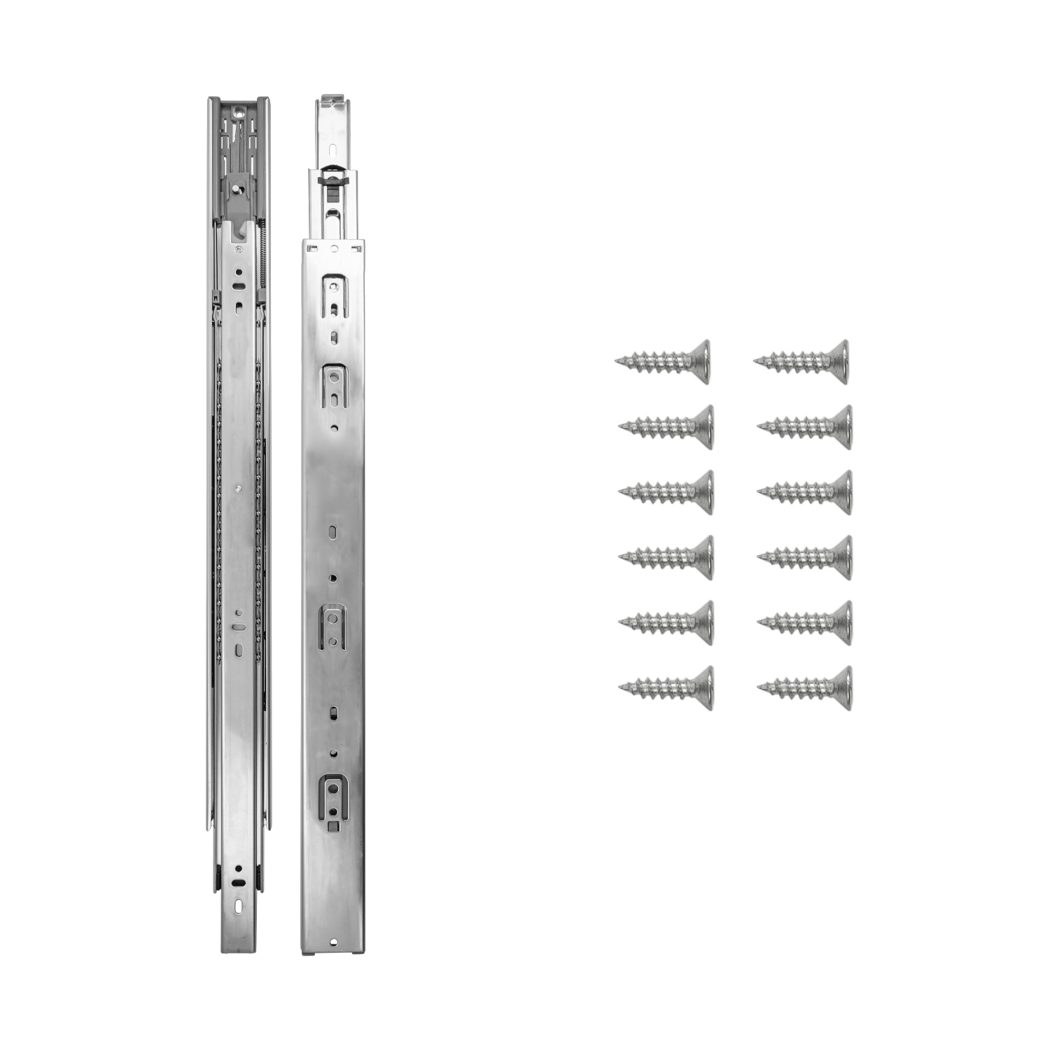 Hickory Hardware P1055/20-2C 20 Inch Drawer Slides offer a seamless blend of functionality and durability, making them an essential addition to any cabinetry project. These full extension ball bearing side mount drawer slides are designed for effortless operation, ensuring that your drawers glide smoothly without the noise of slamming or rattling contents. Featuring a soft close mechanism, the P1055 series gently pulls the drawer closed for the last few inches of travel, adding a touch of elegance to your kitchen or bathroom. With a robust load capacity of 100 lbs., these slides are engineered to handle everyday use while maintaining their reliability. The non-handed design allows for versatile installation, accommodating various drawer configurations with ease. Included in the package are two drawer slides, twelve #8 x 5/8 inch flat head screws, and clear installation instructions, making DIY installation straightforward and user-friendly. The lever disconnect and detent-in engagement feature ensure that your drawers stay securely closed without drifting open, providing peace of mind in busy household environments. Crafted from high-quality steel with a sleek cadmium finish, these drawer slides are not only functional but also visually appealing, coordinating well with most metallic silver finishes. Their satin sheen adds a refined touch to any cabinetry style. Backed by a limited lifetime warranty, Hickory Hardware stands by the quality and craftsmanship of its products, ensuring that your investment in these drawer slides will serve you well for years to come. Upgrade your cabinetry with the P1055/20-2C drawer slides and experience the perfect harmony of style and performance.