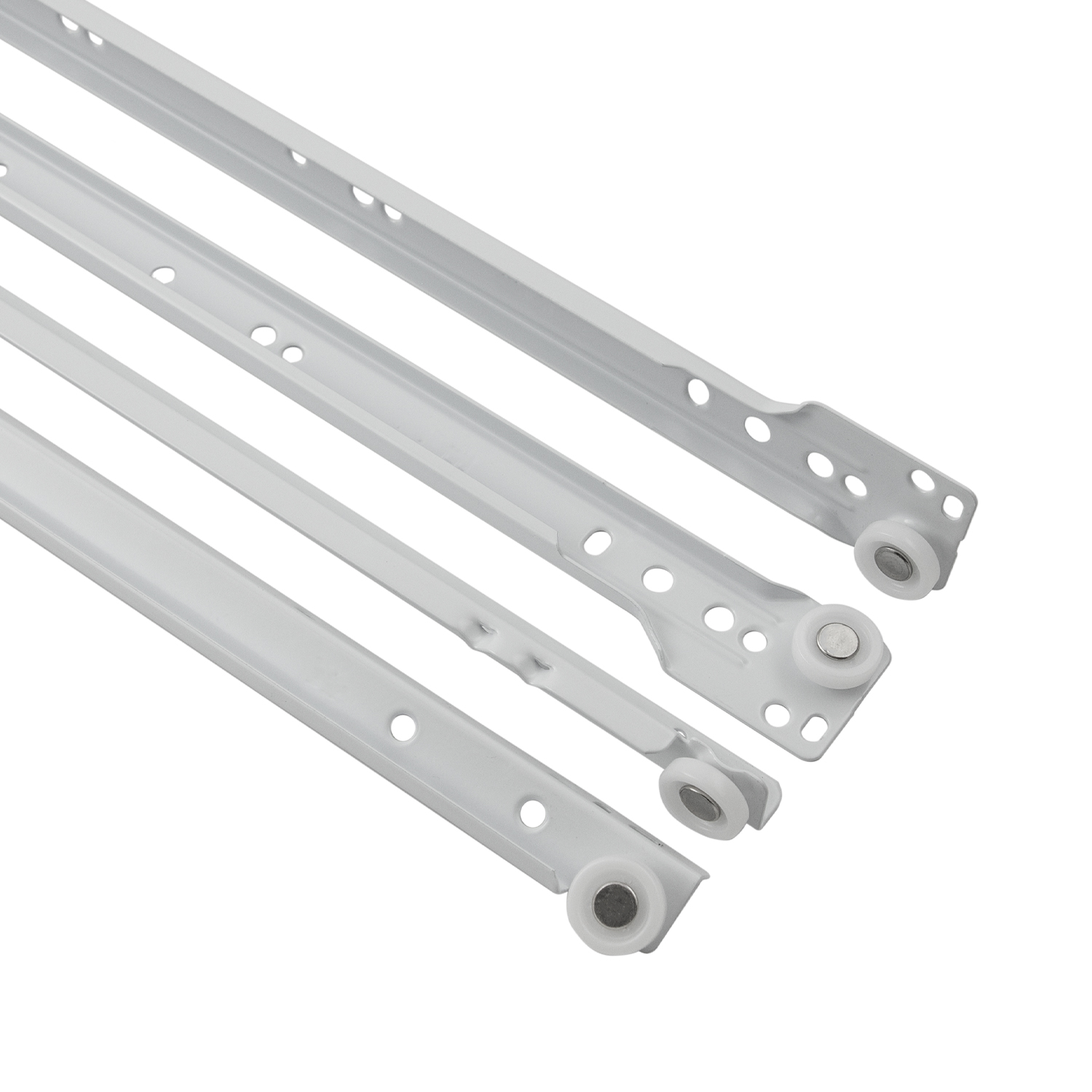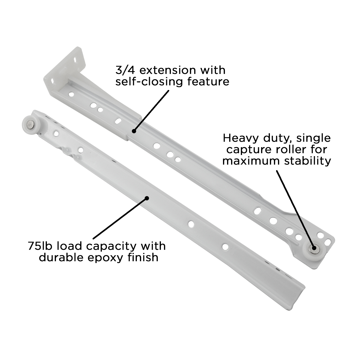 Hickory Hardware P1700/12-W 12 Inch Drawer Slides offer a reliable solution for those seeking both functionality and style in their cabinetry. Designed with a European style roller and a polyslide mechanism, these 3/4 extension bottom mount drawer slides can support a weight capacity of up to 75 lbs, making them ideal for a variety of storage needs. The durable white epoxy finish provides a sleek look while ensuring longevity without the need for additional protective coatings. This model wraps around the bottom edge of each side of the drawer, allowing for a secure installation either through the bottom or side, offering enhanced stability over traditional side mount slides. The self-closing feature allows the drawer to shut automatically during the last few inches of travel, while the built-in stop enables easy removal by simply lifting the drawer up and over the stop. Installation is made effortless with all essential mounting hardware included in the package, which features left and right slides, rear brackets, and screws, along with clear instructions for DIY projects. Additionally, this drawer slide can be adapted for face frame cabinet applications with the separately available rear brackets (model P1700/BKT-W). With Hickory Hardware’s commitment to quality since 1893, the P1700/12-W drawer slides blend timeless appeal with dependable performance, making them a preferred choice for homeowners, builders, and designers looking to enhance their kitchen, bathroom, or furniture projects. Enhance your cabinetry today with these efficient and stylish drawer slides.