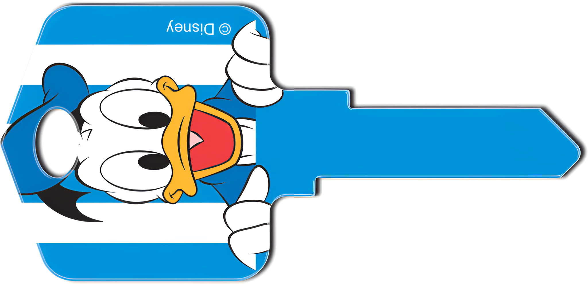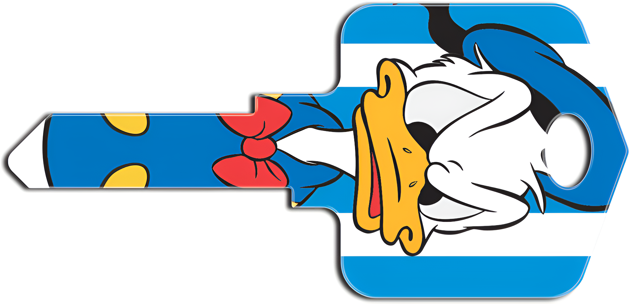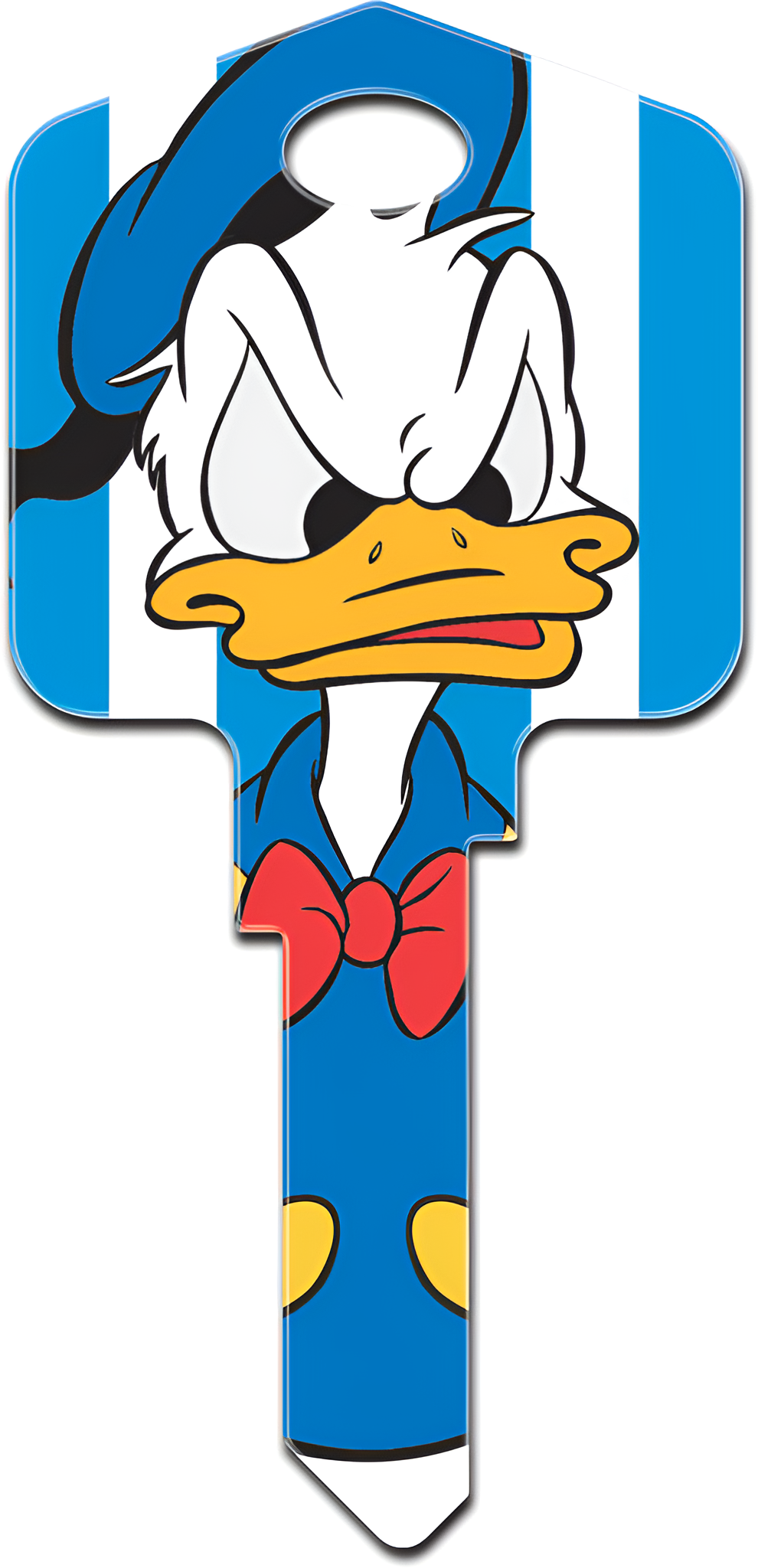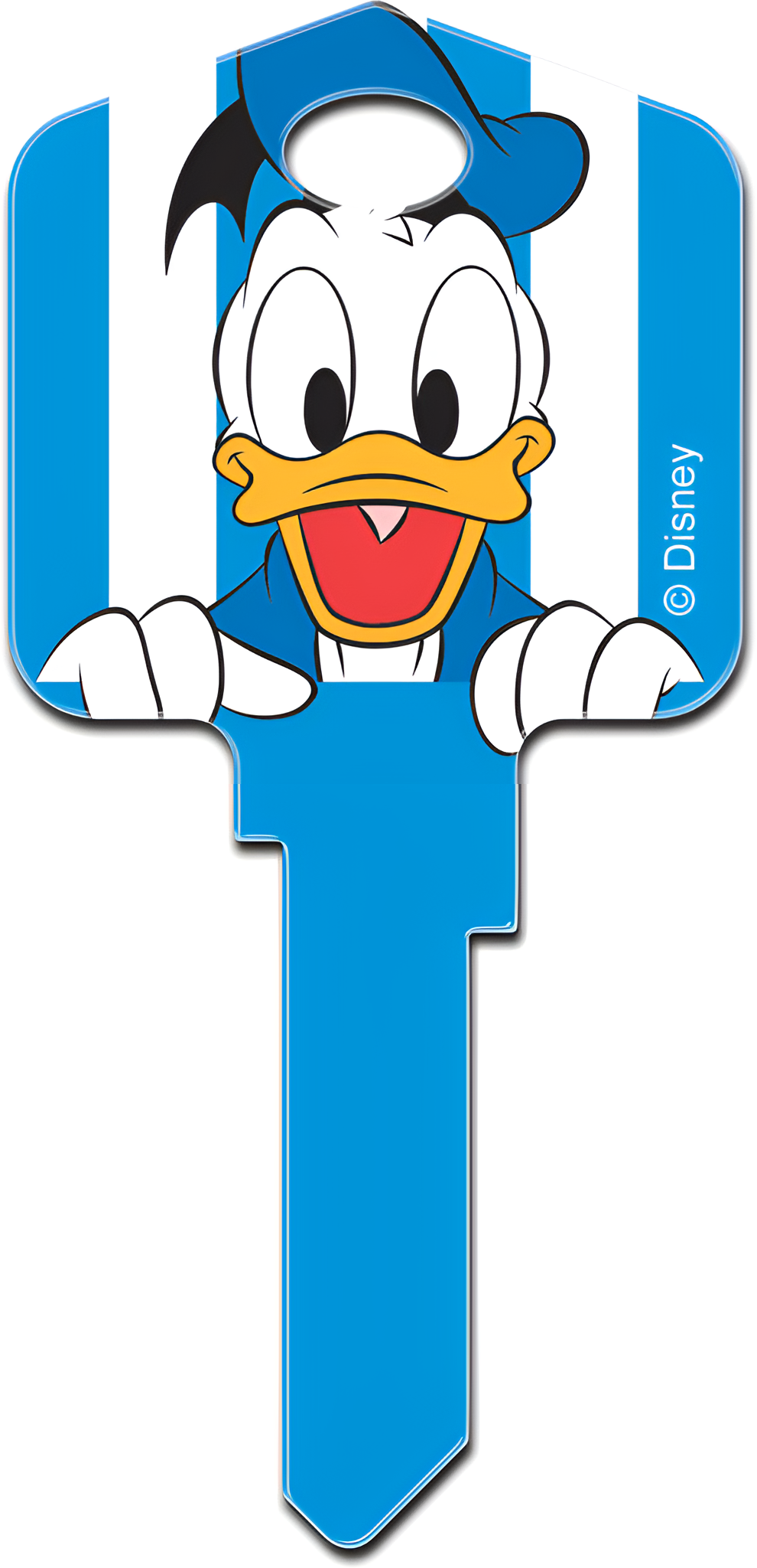 Howard Keys KW-D84 Disney Donald Duck brings a whimsical touch to your home security with this large-headed, painted house key blank. Perfect for Disney enthusiasts and families, this key is adorned with the beloved Donald Duck, making it a fun choice for both children and adults alike. Each key is individually carded, ensuring it remains protected and easy to find when needed; the card dimensions are approximately 2" W x 4-1/8" H. The KW-D84 is available in various keyways, including KW1/KW10, SC1, and WR3/WR5, ensuring compatibility with a wide range of locking systems. Crafted with attention to detail, the painted finish adds a vibrant touch while maintaining durability. This Disney-themed key blank not only serves a practical purpose but also adds a playful element to your keyring. This key is ideal for those looking to personalize their house keys or for parents wanting to encourage kids to take responsibility for their keys. Featuring a Kwikset key head design, it's straightforward to cut and fit to your existing locks. Add a bit of charm to your everyday routine with the Howard Keys KW-D84 Disney Donald Duck key blank, a delightful blend of functionality and fun.