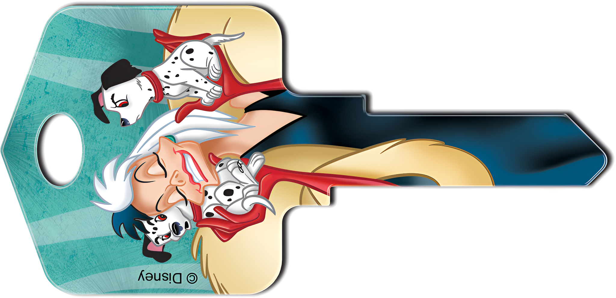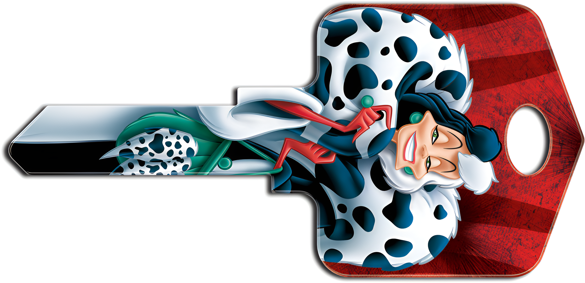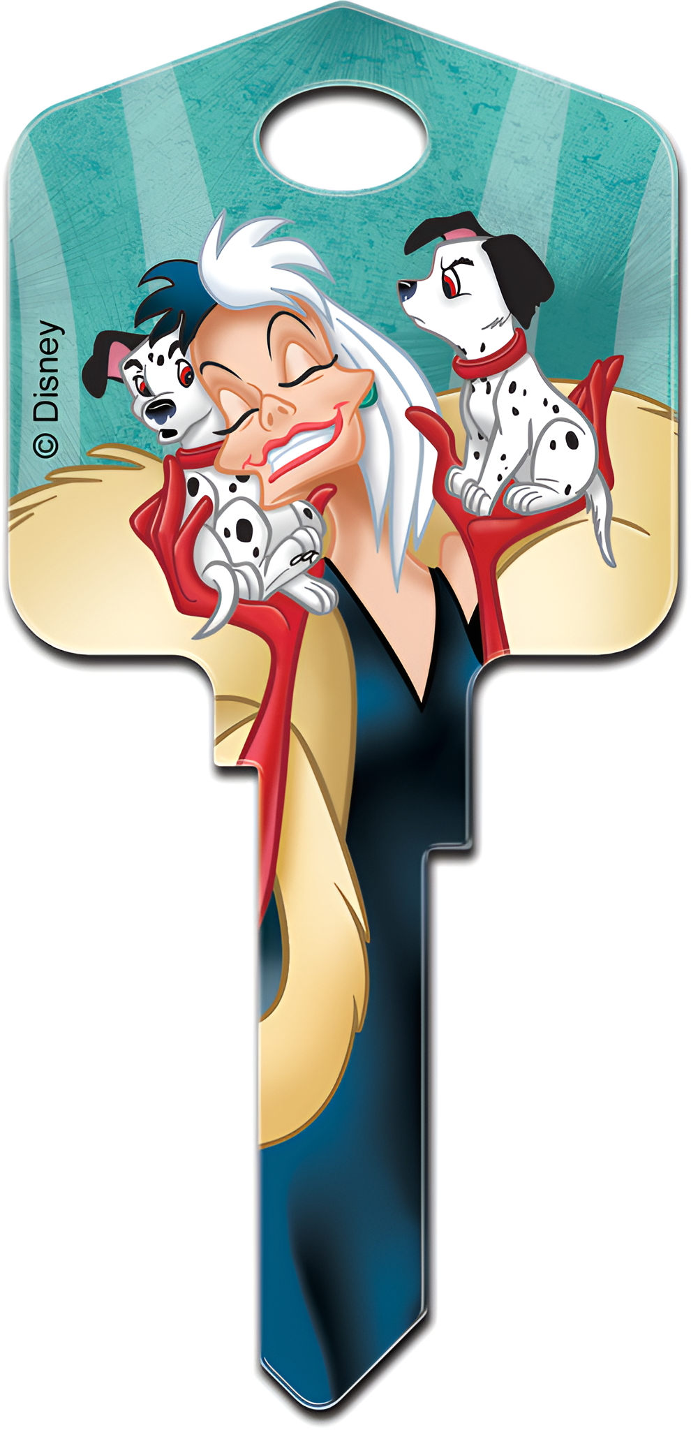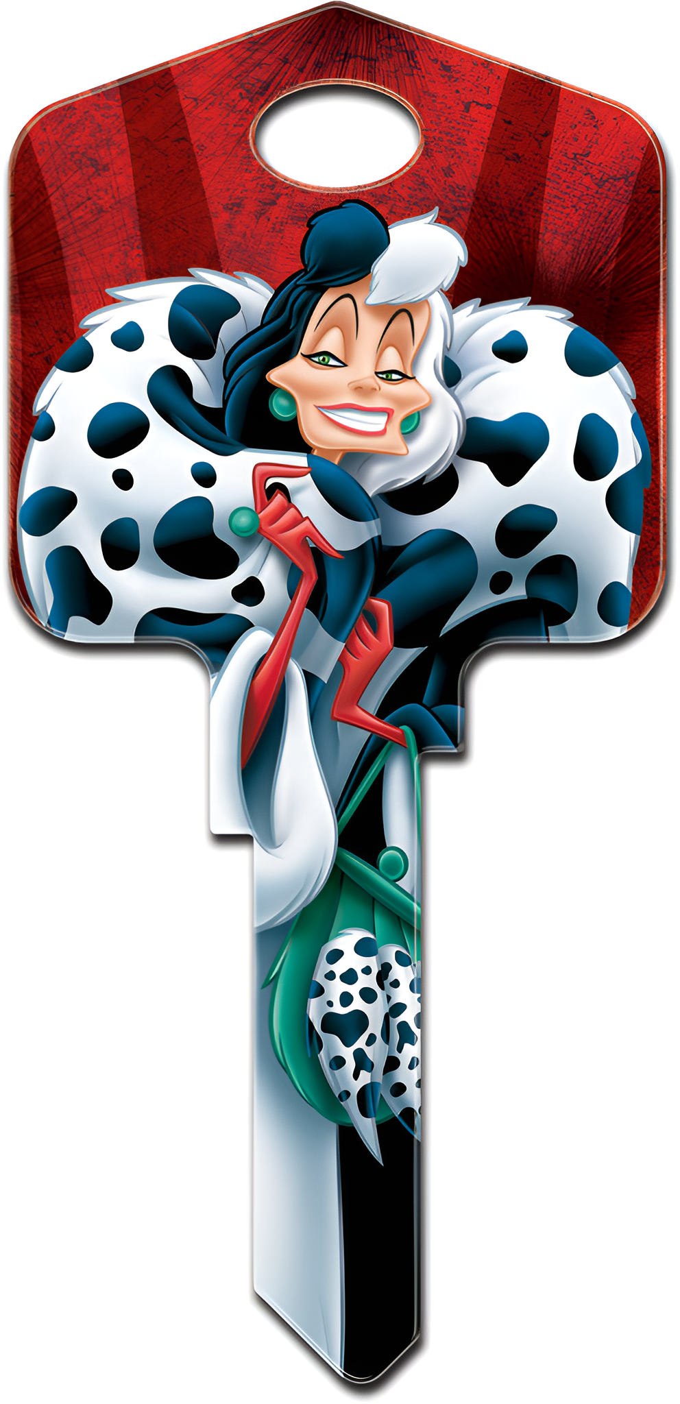 Howard Keys SC1-D98 Disney Cruella De Vil captures the whimsical charm of one of Disney's most iconic villains from '101 Dalmatians.' This large-headed painted house key blank is not just a functional item; it’s a fun and stylish accessory for any Disney enthusiast or collector. Each key is individually carded, measuring approximately 2" W x 4-1/8" H, making it perfect for gifting or personal use. The SC1-D98 is available in multiple keyways, including KW1/KW10, SC1, and WR3/WR5, ensuring compatibility with a wide range of locks. The key features a vibrant painted finish that showcases the unmistakable Cruella De Vil design, adding a unique touch to your keyring. Crafted with attention to detail, this Disney-themed key blank is a delightful way to express your personality while maintaining the practical function of a house key. The Schlage C keyway provides a reliable fit for many standard locking mechanisms, making this key not only a decorative piece but also a secure choice for your home. Add a dash of character to your everyday essentials with the Howard Keys SC1-D98 Disney Cruella De Vil key blank, and let your keys reflect your love for Disney storytelling.