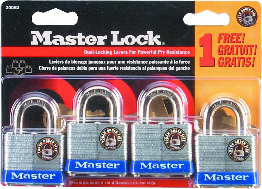Master Lock 3008D Carded Padlock Steel 1-9/16in 3 4-Pack offers a robust security solution designed to meet your outdoor and storage needs. Featuring a 1-9/16-inch (40mm) wide laminated steel body, this padlock ensures maximum strength and reliability. The hardened steel shackle, measuring 9/32-inch (7mm) in diameter and 3/4-inch (19mm) long, provides exceptional resistance against cutting and sawing, making it ideal for securing tools, job boxes, and lockers. The innovative design includes a 4-pin cylinder that effectively prevents picking, while dual locking levers enhance resistance to prying and hammering. With the added convenience of being keyed alike, one key opens all four locks in the pack, streamlining your security setup. This padlock is perfect for various applications, including outdoor storage, fences, and self-storage units. The silver finish not only looks professional but also provides durability against the elements. With a limited lifetime warranty, you can trust in the quality and performance of Master Lock. Choose the Master Lock 3008D for reliable, general security that keeps your belongings safe and secure.