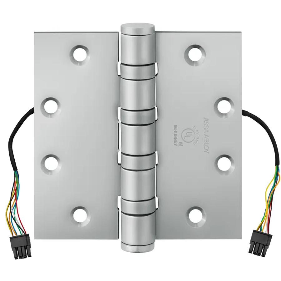 Mckinney Products Company T4A3786 4.5 x 4.5 US26D QC8 Quick Connect Electrified Hinge combines durability and advanced technology to meet the demands of high-traffic environments. This heavy-weight, full mortise, five-knuckle hinge is designed specifically for use on heavy wood or metal doors, making it ideal for public buildings where reliability is paramount. The T4A3786 features a robust steel base with a satin chrome finish (652/US26D), offering both aesthetic appeal and resilience. Its electrified design allows for secure powering of locking hardware and access control systems, with quick connect options that streamline installation. The hinge's non-removable pin option adds an extra layer of security, ensuring it remains firmly in place, while the safety stud feature interlocks the leaves together, preventing door removal even if the pin is taken out. Engineered to handle high frequency use, this hinge boasts oil-impregnated bearings for smooth operation. The decorative tips enhance the overall look, while the hospital tip option helps deter unauthorized hanging. With versatile applications and multiple bearing choices, the T4A3786 is an essential component for enhancing both security and functionality in any facility.
