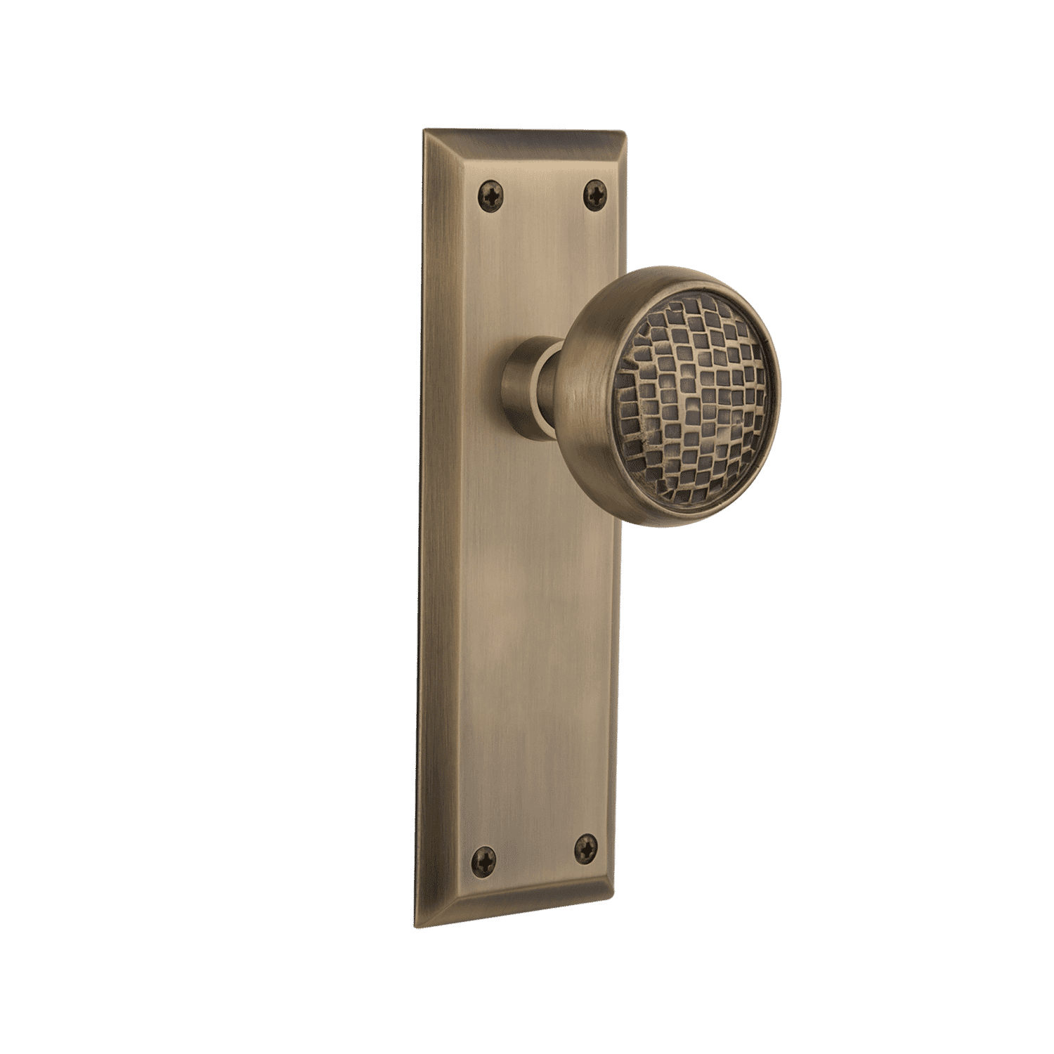 New York Long Plate with Craftsman Knob in Antique Brass. Double Dummy, Universal Door Handing