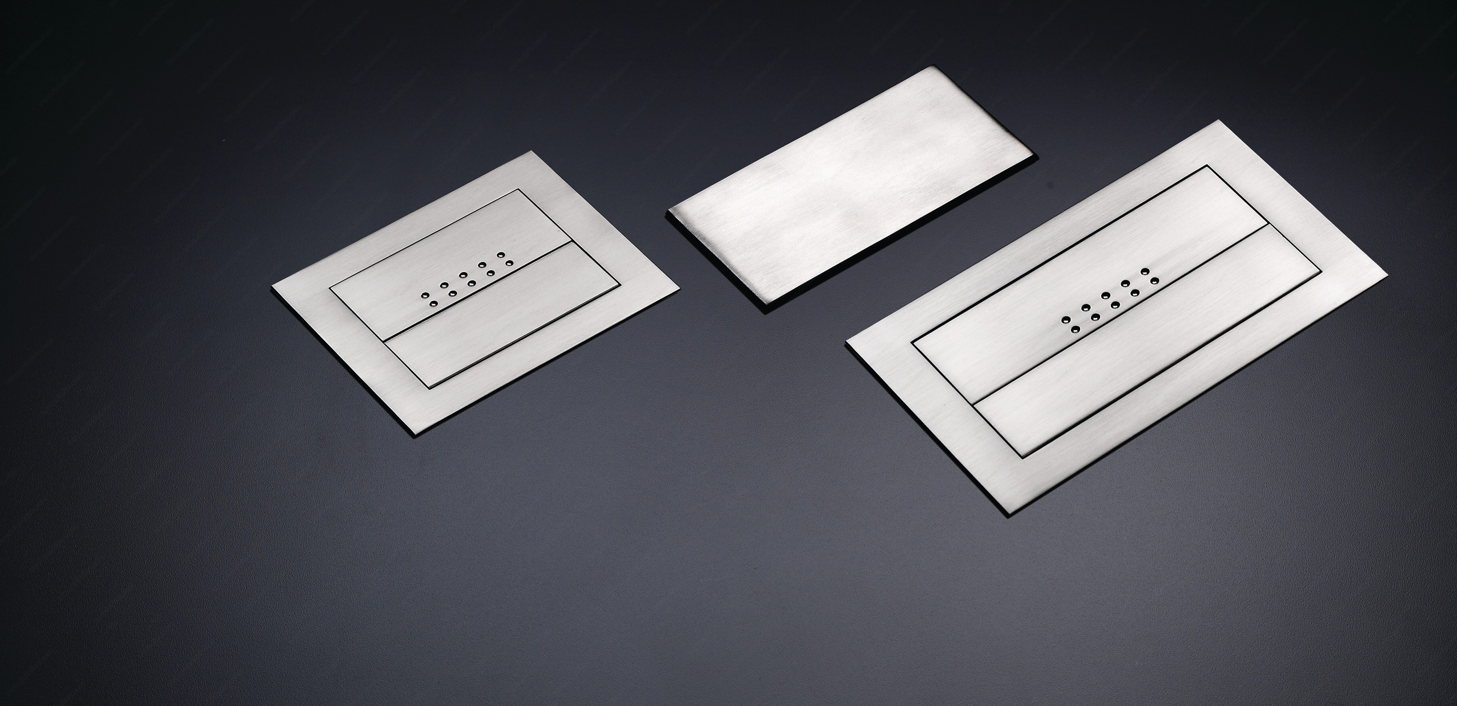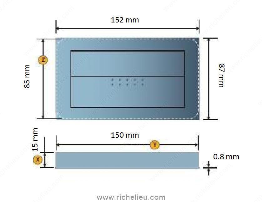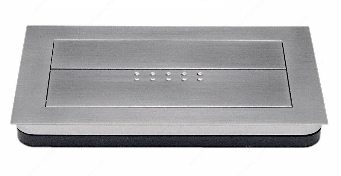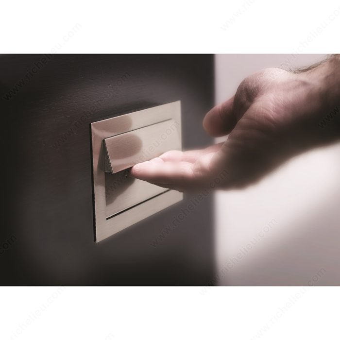 Richelieu 101191195 Modern Recessed Metal Pull - 1011 elevates your cabinetry with its sleek and understated design. This pull is part of the Eclipse Collection, characterized by its sophisticated, modern aesthetic that perfectly complements contemporary furniture. With an overall length of 5 31/32 inches and a width of 3 7/16 inches, this recessed pull fits seamlessly into drawers and cabinetry, making it both functional and stylish. The brushed nickel finish adds a touch of elegance, while the gray and chrome color scheme ensures versatility across various design palettes. The unique dimpled texture on the flap allows for easy operation; simply apply pressure to open, and both flaps return to a flush position when not in use, maintaining a streamlined look. Designed for durability, this metal pull includes wood screws for hassle-free installation, making it a practical choice for building professionals and knowledgeable homeowners alike. With a center-to-center measurement of 3 19/32 inches and a projection of 19/32 inches, it provides a comfortable grip while enhancing the overall appearance of your furniture. Choose the Richelieu Modern Recessed Metal Pull to add a refined touch to your spaces.
