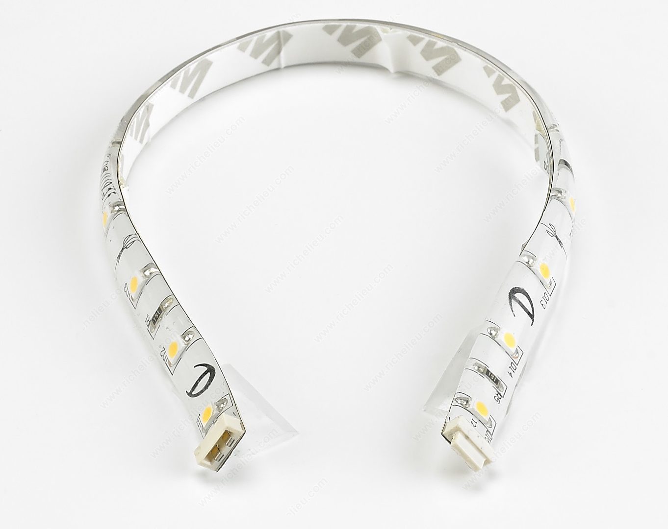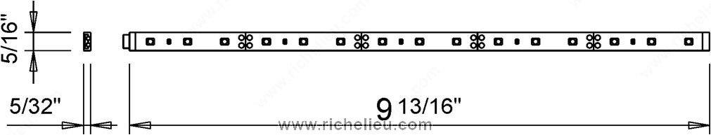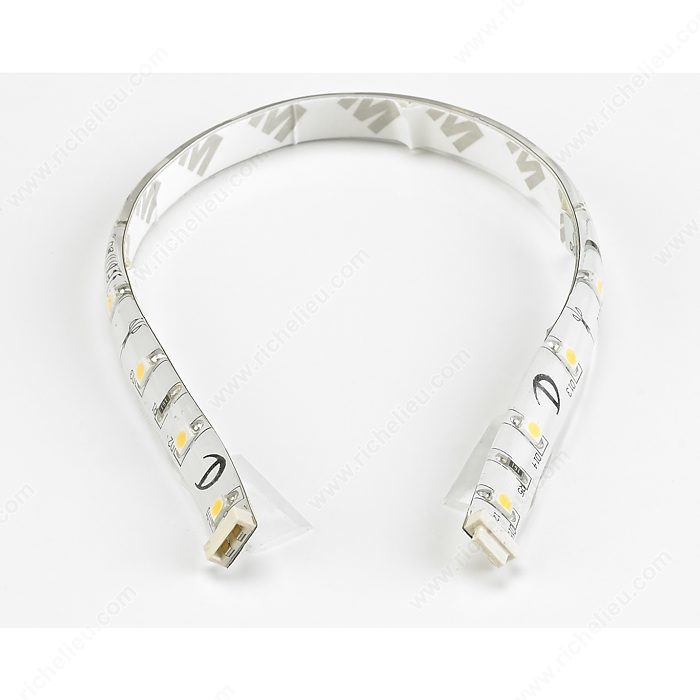Richelieu 107122010 FlexyLED CR - LED Tape Light offers an innovative quick-plug system that allows for seamless connections between modules of various lengths, ensuring a continuous and uniform light distribution. Ideal for kitchens, bathrooms, commercial spaces, and closets, this flexible linear luminaire delivers warm white illumination with a Kelvin color temperature ranging from 3000 K to 3500 K. With a Color Rendering Index (CRI) of 90, the FlexyLED CR enhances the appearance of colors in any setting while providing accent and task lighting. Its energy-efficient design consumes only 1.2 watts and boasts a luminous efficiency of 85 lumens per watt, producing a luminous flux of 104 lumens. This dimmable tape light is suitable for surface mounting and features a contemporary style that blends well with various decors. Designed with durability in mind, the FlexyLED CR is rated IP44, making it suitable for areas exposed to moisture. The product is certified by cULus, ensuring compliance with safety standards. Measuring 9 27/32 inches in length and 5/16 inches in width, this lighting solution is not only functional but also an elegant addition to any space.