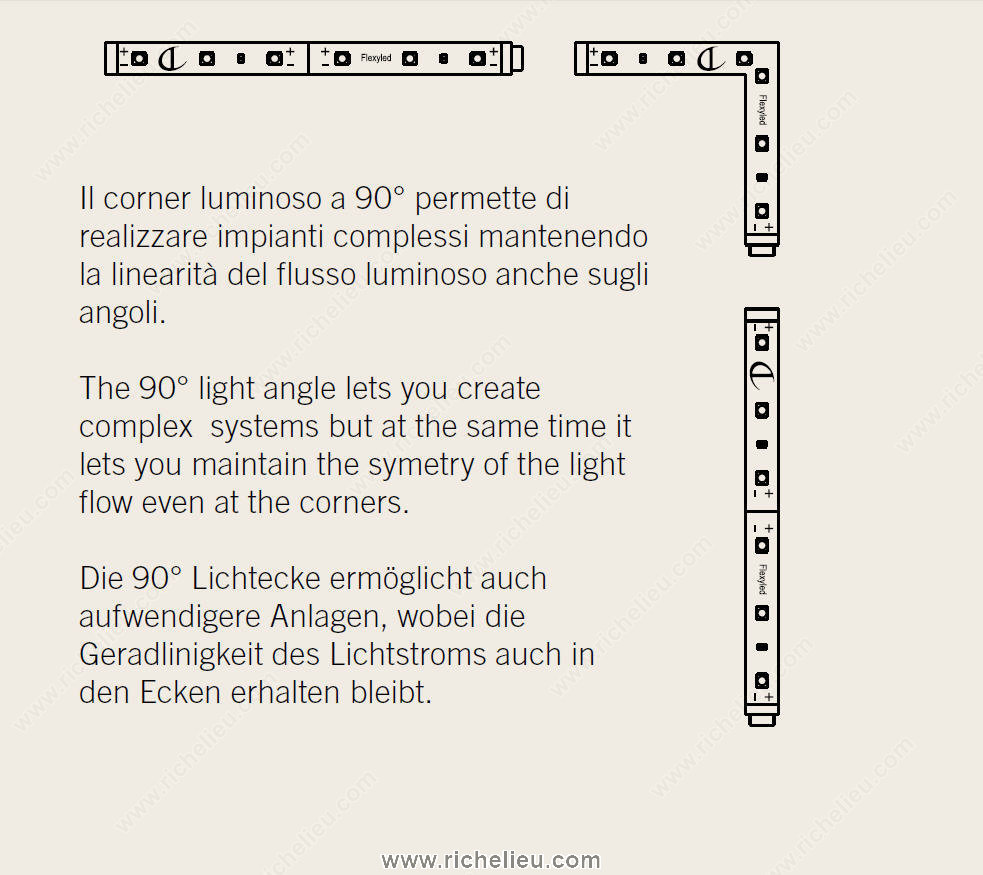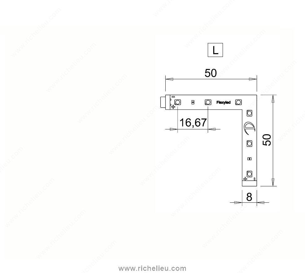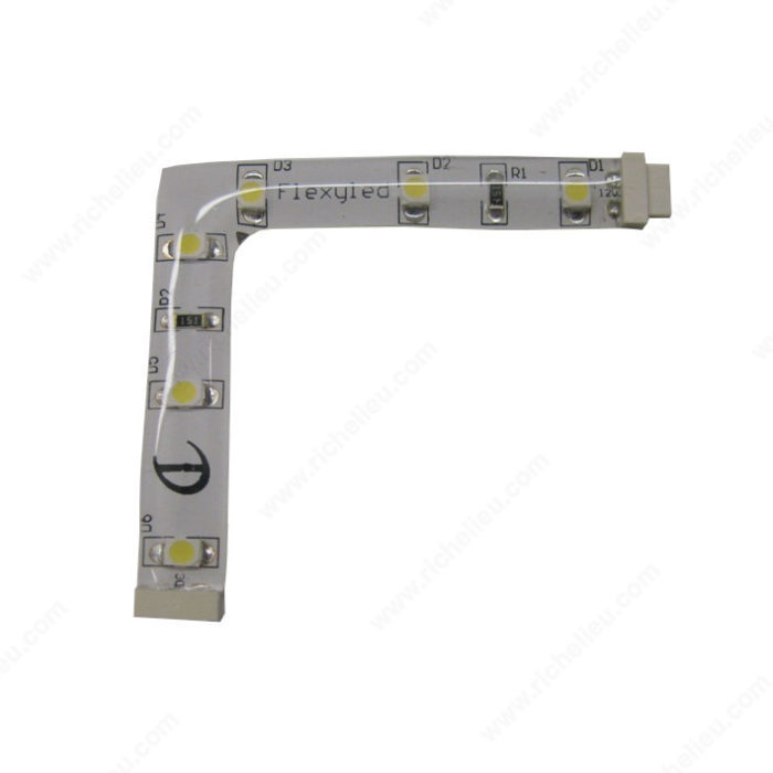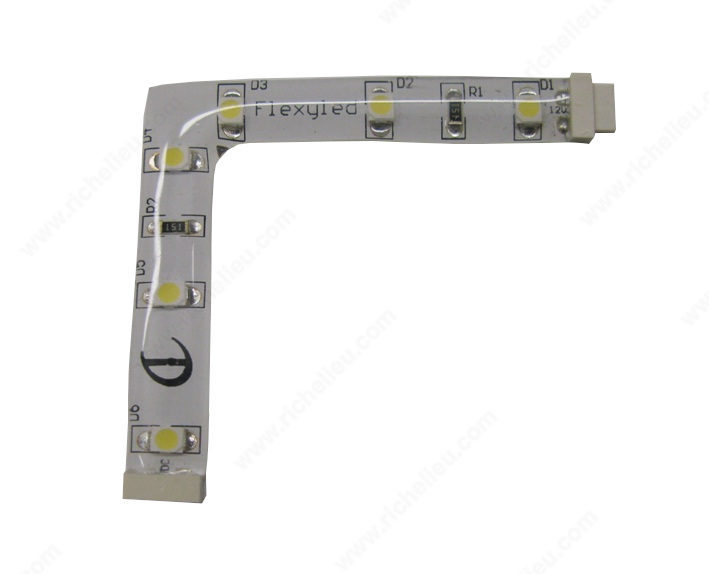 Richelieu 107L122 LED FlexyLed Corners enhance your lighting solutions with functionality and style. Designed specifically for use in kitchens, living rooms, and bedrooms, these left and right corners seamlessly integrate into your existing FlexyLed system, providing a polished finish to any space. With a Color Rendering Index (CRI) of 90, this lighting fixture ensures that colors appear vibrant and true, making it an excellent choice for accent lighting. The warm white light emitted by the 107L122 operates within a Kelvin color temperature range of 3000 K to 3500 K, creating an inviting atmosphere ideal for both relaxation and productivity. Measuring 1 31/32 inches in length and width, these corners fit perfectly in tight spaces, while their LED technology ensures energy efficiency, drawing only 0.48 watts at 12 volts. Designed for installation inside cabinets, closets, or other areas, the rigid linear luminaire offers versatility and convenience. Packaged in a sturdy box, the Richelieu 107L122 LED FlexyLed Corners are easy to ship via UPS, making them a practical addition to your lighting project. Elevate your interior design with this elegant and effective lighting solution.