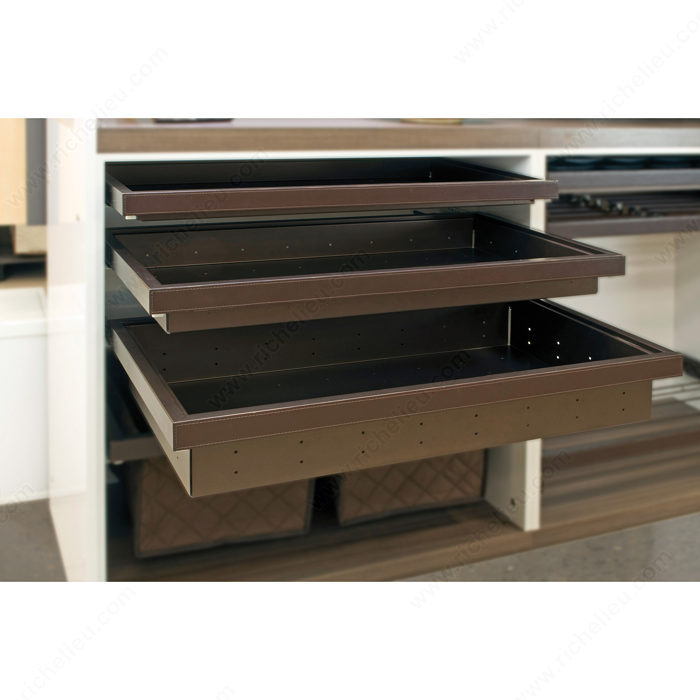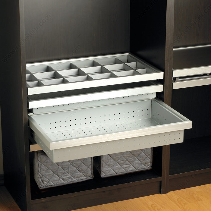 Richelieu 130536010 Metal Drawer for an Interior Cabinet Width of 36" (914 mm) is designed to enhance organization and accessibility within your cabinets. Constructed from durable aluminum, this drawer combines strength and functionality, making it an excellent choice for storing a variety of items, including sweaters, t-shirts, socks, underwear, gloves, and hats. With a height of 4 inches and a required depth of at least 21 3/4 inches, this sliding basket fits seamlessly into your existing cabinetry. The 36-inch width ensures ample space for your essentials, while the option to add an additional divider allows for customized organization of smaller items like scarves, ties, and belts. Part of the Milano collection, this drawer not only provides practical storage solutions but also complements modern interior aesthetics. Its sleek aluminum finish adds a touch of elegance to any space. The product is designed for easy shipping via UPS, making it convenient to acquire and install. Elevate your storage experience with Richelieu's Metal Drawer, combining quality materials and thoughtful design to bring order to your home.