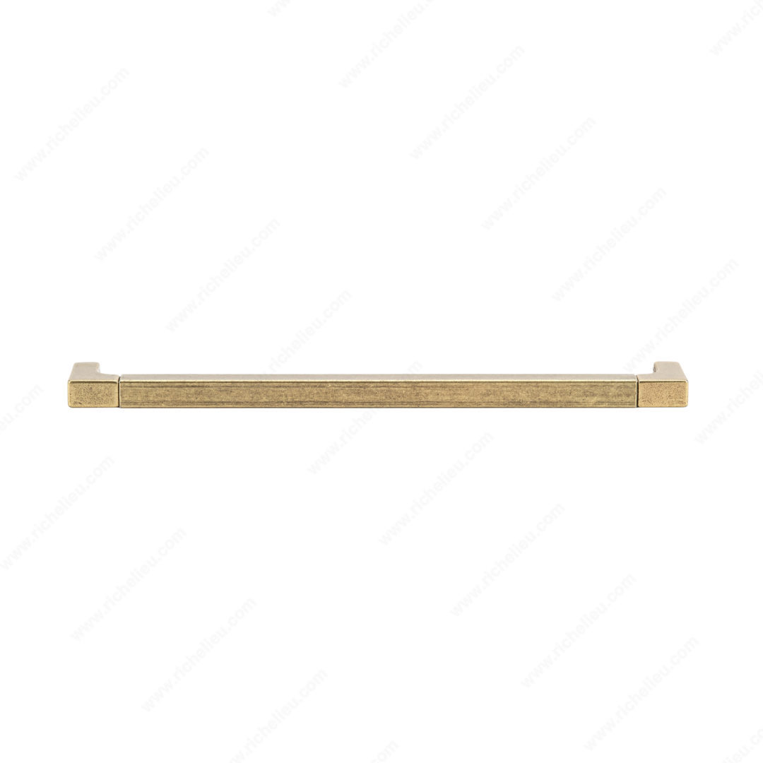 Richelieu 1414288BB Modern Metal Pull - 1414 showcases a striking rectangular design that exudes an industrial aesthetic, making it a perfect addition to contemporary spaces. Crafted from durable steel, this pull features visible assembly joints that enhance its modern look while ensuring robust functionality. With a center-to-center measurement of 11 3/8 inches, the pull is designed to fit a variety of cabinet and drawer applications seamlessly. The burnished brass finish, complemented by the vibrant yellow accents, adds a touch of sophistication and warmth to any decor. Measuring an overall length of 11 7/8 inches, a projection of 1 17/32 inches, and a width of 9/16 inches, this pull strikes the ideal balance between form and function. Included with the pull are M4 screws, making installation straightforward and hassle-free. The 1414 model is part of a complete collection, allowing for cohesive design throughout your project. Designed for professionals and discerning homeowners alike, the Richelieu 1414288BB Modern Metal Pull is not just a functional hardware piece but a statement of style, perfect for enhancing both residential and commercial environments.