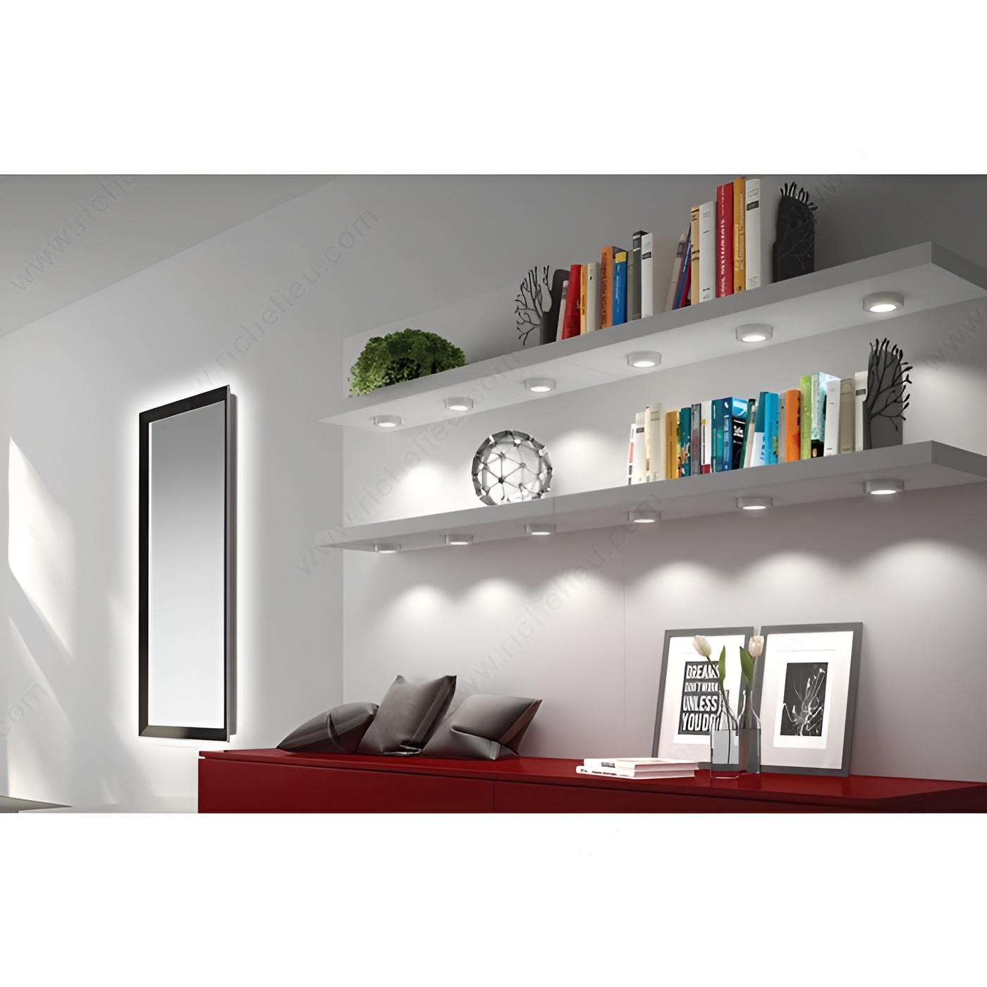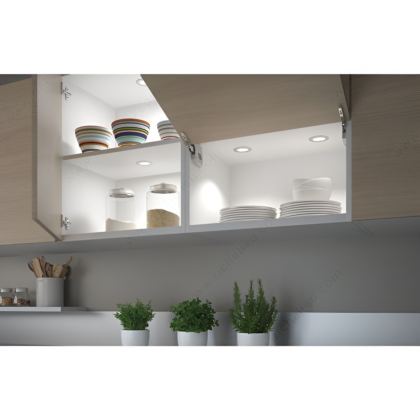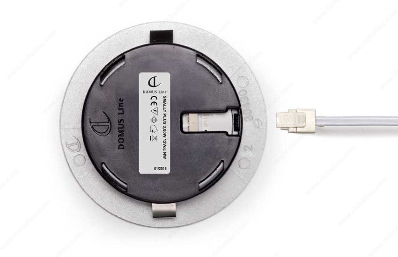 Richelieu 153124010 SMALLY 3W LED Puck Light, 12VRichelieu 153124010 SMALLY - LED Puck Light 3 W 12 V offers an innovative lighting solution that combines functionality with style. This 3 W LED spotlight is engineered for a wide light beam, ensuring uniform illumination without the common dotted effect of traditional LED spotlights. Designed for easy installation, it fits seamlessly into a recessed 57 mm hole with a minimal depth of just 12 mm, making it ideal for various applications, including kitchens, living rooms, commercial spaces, and furniture. With its sleek aluminum finish and contemporary design, the SMALLY puck light can be mounted either recessed or on the surface, providing versatility in your lighting scheme. It operates at a color temperature of 4300 K, producing a neutral white light that enhances the visual appeal of your space. The light boasts a CRI of 80, ensuring accurate color representation. Dimmable functionality allows for customized lighting levels, while its impressive luminous efficiency of 130 lm/W and a total luminous flux of 390 lumens make it an energy-efficient choice. Rated IP20 and certified cULus, the Richelieu SMALLY is perfect for under-cabinet, furniture, or countertop applications, ensuring both beauty and practicality in your design.
