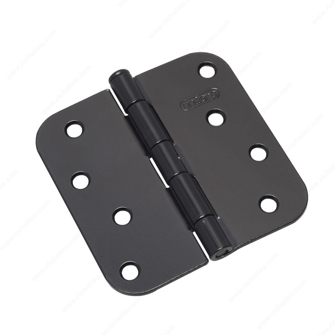 Richelieu 1822FBNRPB 4" Full Mortise Butt Hinge - 5/8" Radius enhances any doorway with its blend of style and functionality. Crafted from durable steel, this hinge is designed to support a standard door with a load capacity of up to 60 lbs when using three hinges. Its polished black finish offers a sleek appearance that complements various design aesthetics, making it an ideal choice for modern and traditional spaces alike. This versatile hinge features a 5/8" radius corner and has overall dimensions of 4" in height and width, ensuring a perfect fit for most applications. The non-removable pin adds an extra layer of security, while the included screws ensure a hassle-free installation process. With an assembly thickness of 3/32", it maintains a seamless look and a gap of only 1/16", contributing to a refined finish. Packaged in a box of two, the Richelieu 1822FBNRPB is not only practical but also a stylish addition to your home improvement projects. Suitable for a range of standard doors, this hinge is the finishing touch that combines reliable performance with aesthetic appeal, allowing you to elevate the look of your interiors effortlessly.