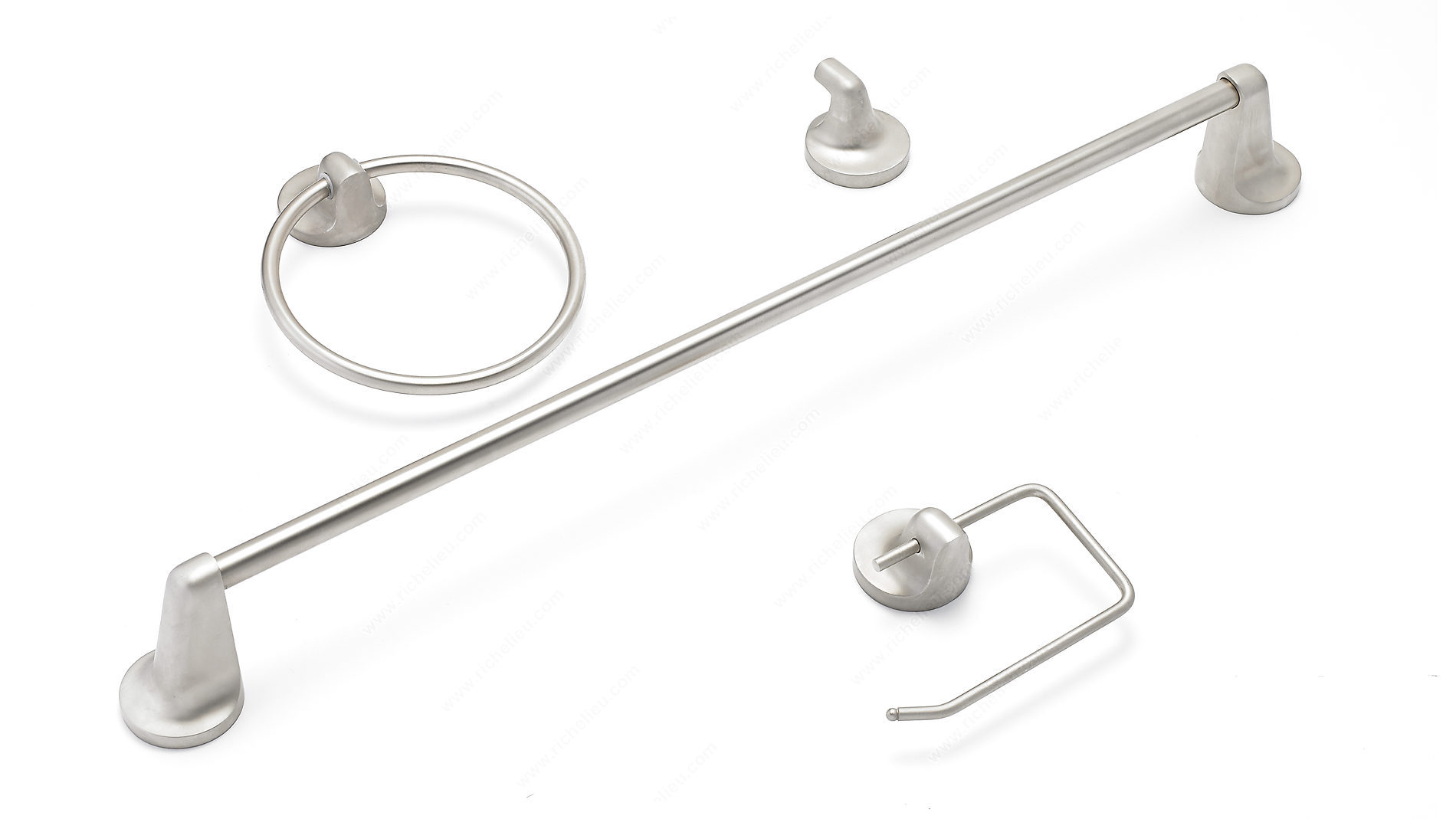Richelieu 19434 Value Pack - Soho Collection offers a seamless blend of style and functionality, perfect for achieving a transitional bathroom design. This value pack includes four meticulously crafted pieces that embody the essence of the Soho collection, featuring classic elements reimagined with simpler shapes and a sleeker aesthetic. Constructed from durable metal, each piece showcases a sophisticated satin nickel finish that enhances any décor while providing long-lasting performance. The transitional style makes it a versatile choice, complementing a range of design themes from contemporary to traditional. Ideal for professionals and discerning homeowners alike, this collection is designed to elevate your space with its understated elegance. The Soho Value Pack not only simplifies the selection process but also ensures a cohesive look throughout your bathroom. Additionally, with the convenience of shipping via UPS, you can easily incorporate this stylish hardware into your renovation or new construction projects. Explore the full range of items in the Soho collection to maximize your design possibilities and create a bathroom that is both functional and visually appealing.