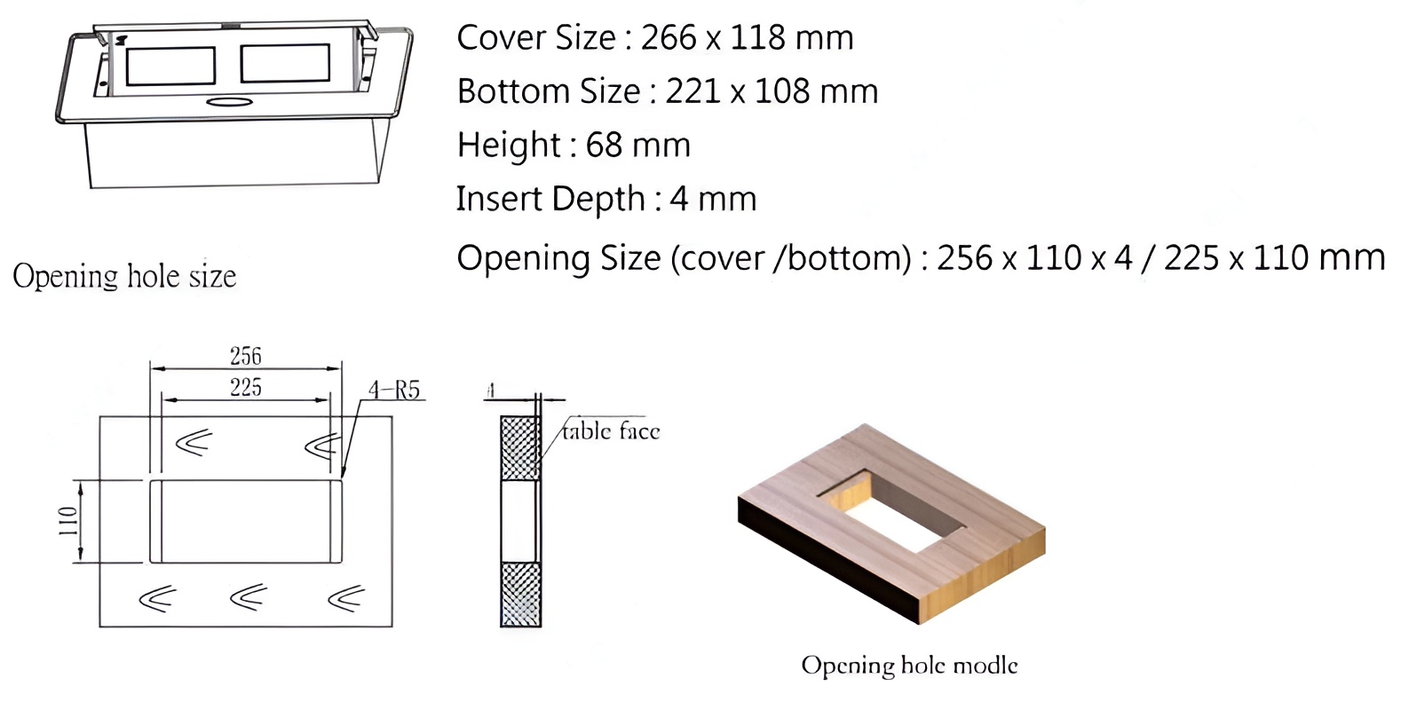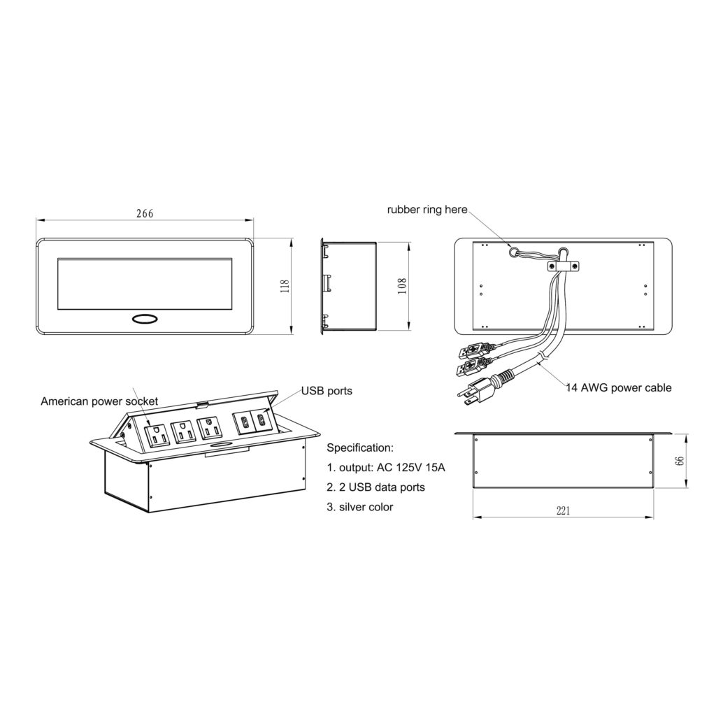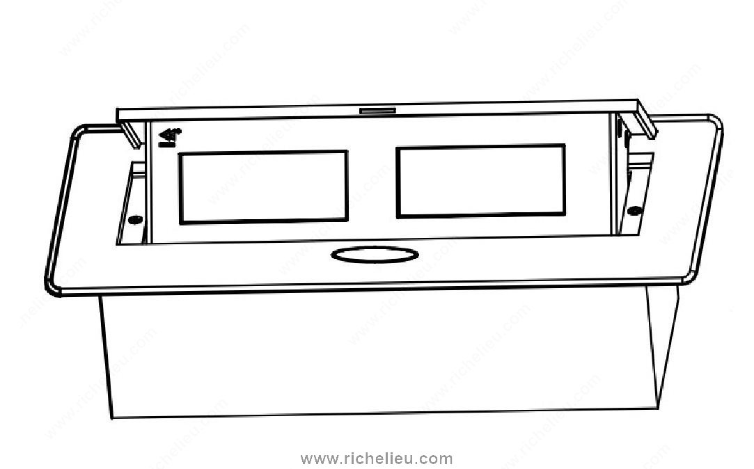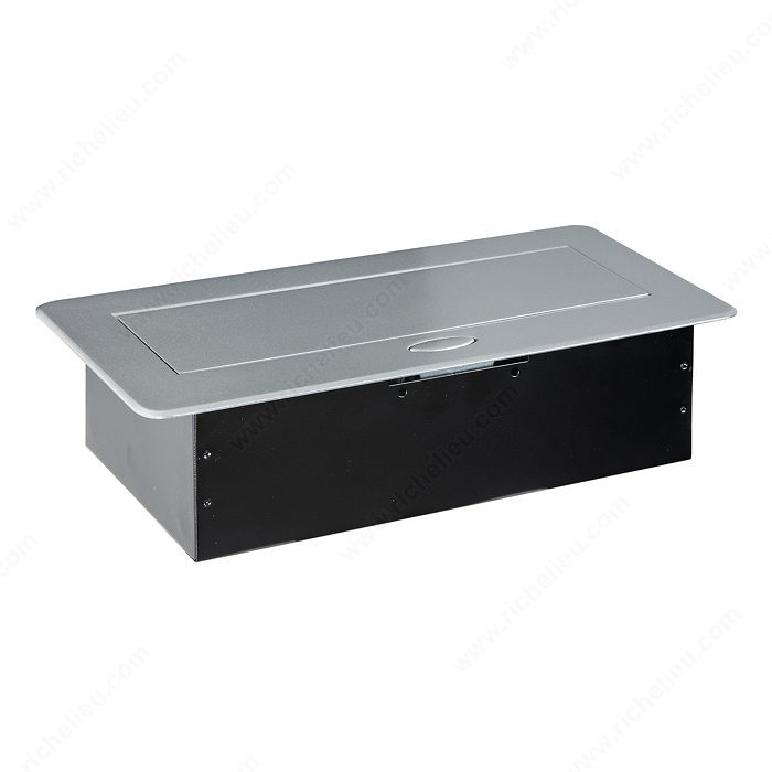 Richelieu 201314100 Power Station with 3 Outlets and 2 USB is an essential addition for modern workspaces, providing convenience and functionality at your fingertips. Designed for recessed mounting, this sleek power station integrates seamlessly into desks, workstations, or conference tables, ensuring a tidy and organized environment. Equipped with three 120V outlets, it allows multiple devices to be connected simultaneously, making it ideal for busy professionals. Additionally, the two USB-A ports offer quick charging capabilities for smartphones, tablets, and other devices, enhancing efficiency during meetings or collaborative sessions. The cover measures 266x118 mm, with a bottom size of 221x108 mm and a height of 68 mm, fitting comfortably into various setups. The unit is available in elegant black and silver finishes, complementing contemporary decor. With a recess depth of 2 5/8 inches and a width of 4 21/32 inches, it provides a compact solution without sacrificing power. Certified by ETL, this power station ensures safety and reliability, making it a trusted choice for professionals. Elevate your workspace with the Richelieu Power Station, where style meets functionality, and stay connected effortlessly.