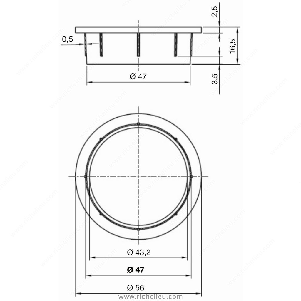 Richelieu 20692170 Round Metal Grommet enhances your workspace by providing a sleek solution for managing cords and devices. Crafted from durable Zamak and finished in stainless steel, this grommet combines functionality with a modern aesthetic, ensuring that your office remains organized and visually appealing. With an overall diameter of 2 7/32 inches and a recessed depth of 9/16 inches, the grommet is designed to fit a bore hole of 1 27/32 inches, making it compatible with a variety of surfaces. Its round shape and polished finish not only streamline cord management but also add a touch of elegance to desks or workstations. The grommet’s thoughtful design allows for easy cord access while maintaining a clean look, effectively minimizing clutter. Additionally, it ships conveniently via UPS, making it an excellent choice for professionals seeking quick and reliable solutions. Whether you’re outfitting a new office or upgrading an existing setup, the Richelieu 20692170 Round Metal Grommet is an essential accessory that balances style with practicality. Keep your workspace tidy and sophisticated with this versatile and durable grommet that meets the demands of any professional environment.