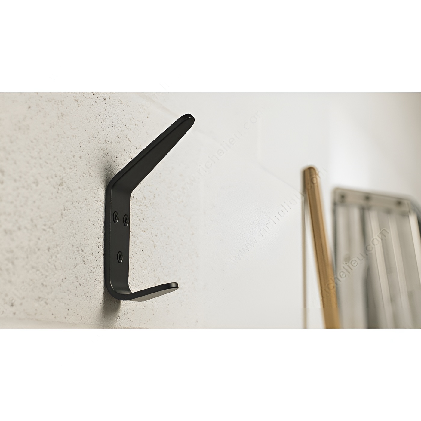 Richelieu 2375FBV 5-1/2 in Heavy Duty Coat Hook exemplifies a perfect blend of style and functionality. Designed with a sleek matte black finish, this coat hook enhances the aesthetic of any space while providing robust support for your belongings. The dual arm design significantly increases your storage capabilities, making it an ideal solution for bedrooms, bathrooms, entryways, mudrooms, and closets. With a load capacity of up to 22 lbs, this versatile hook is crafted from durable metal, ensuring long-lasting reliability. Its unique shape accommodates accessories of various sizes, offering flexibility in organization. The overall dimensions of 5 1/4 inches in height, 1 3/8 inches in width, and a projection of 2 17/32 inches make it suitable for both wall and door installations. Installation is straightforward, as the necessary wood screws are included, allowing you to set it up quickly in any desired location. Whether you need a stylish option for your home or a practical choice for a commercial setting, the Richelieu 2375FBV coat hook stands out as an exceptional addition to your space. Elevate your organization game with this attractive and sturdy coat hook.