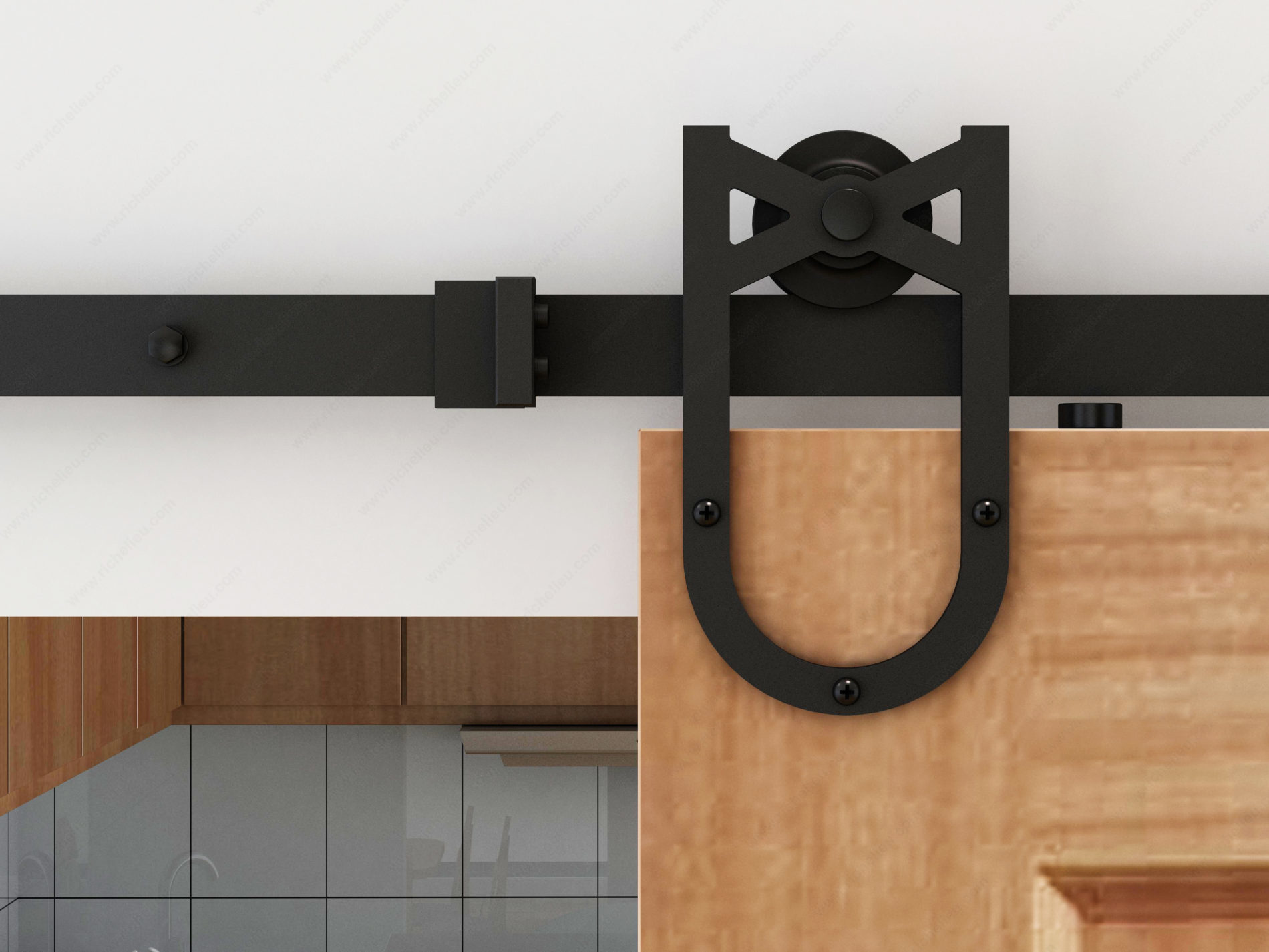 Richelieu 2460211MATBC Black Knight Decorative Sliding Hardware KitRichelieu 2460211MATBC BLACK KNIGHT Decorative Sliding Hardware Kit offers a stylish and practical solution for wall-mounted wood doors, supporting weights of up to 220 lb (100 kg). This barn door U-shape bar-style system is designed for easy installation, featuring a direct surface mount U-shape flat bar that simplifies the setup process. The kit includes everything needed for one door, with a sturdy 78-inch (2 m) track and a two-part floor guide that eliminates the need for grooves at the bottom of the door. The BLACK KNIGHT kit accommodates doors ranging from 24 to 40 inches in width and 1 3/8 to 1 3/4 inches in thickness. For added convenience, a soft-close mechanism is available separately for doors weighing up to 176 lb (80 kg). Packaging options include a clear PVC box for retail showrooms or a white cardboard box with a photo label, making it ideal for various sales environments. This decorative sliding hardware kit not only enhances the rustic charm of any space but also provides a functional and durable solution for closet doors, standard access doors, or barn doors. Upgrade your residential applications with the reliability and elegance of the BLACK KNIGHT system.