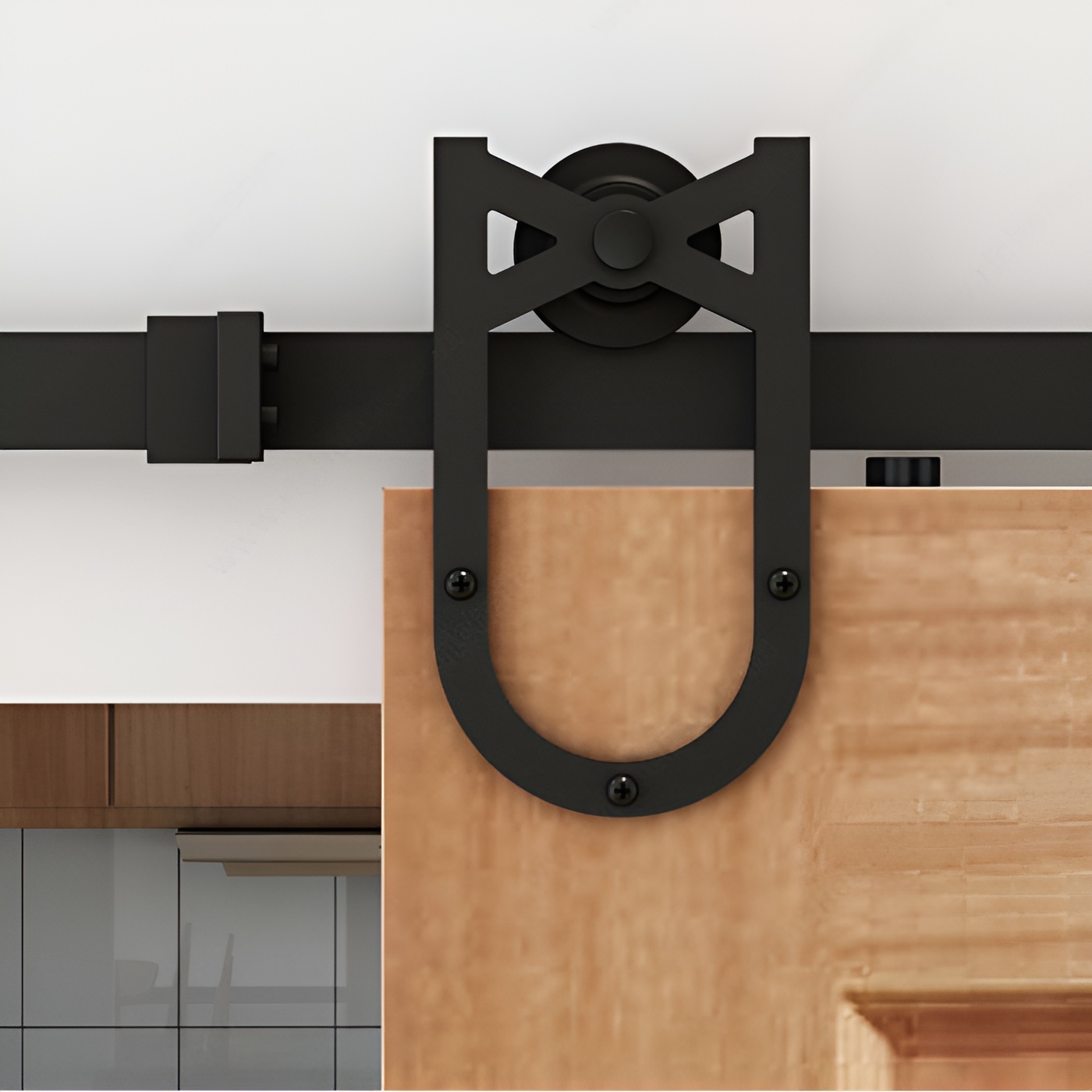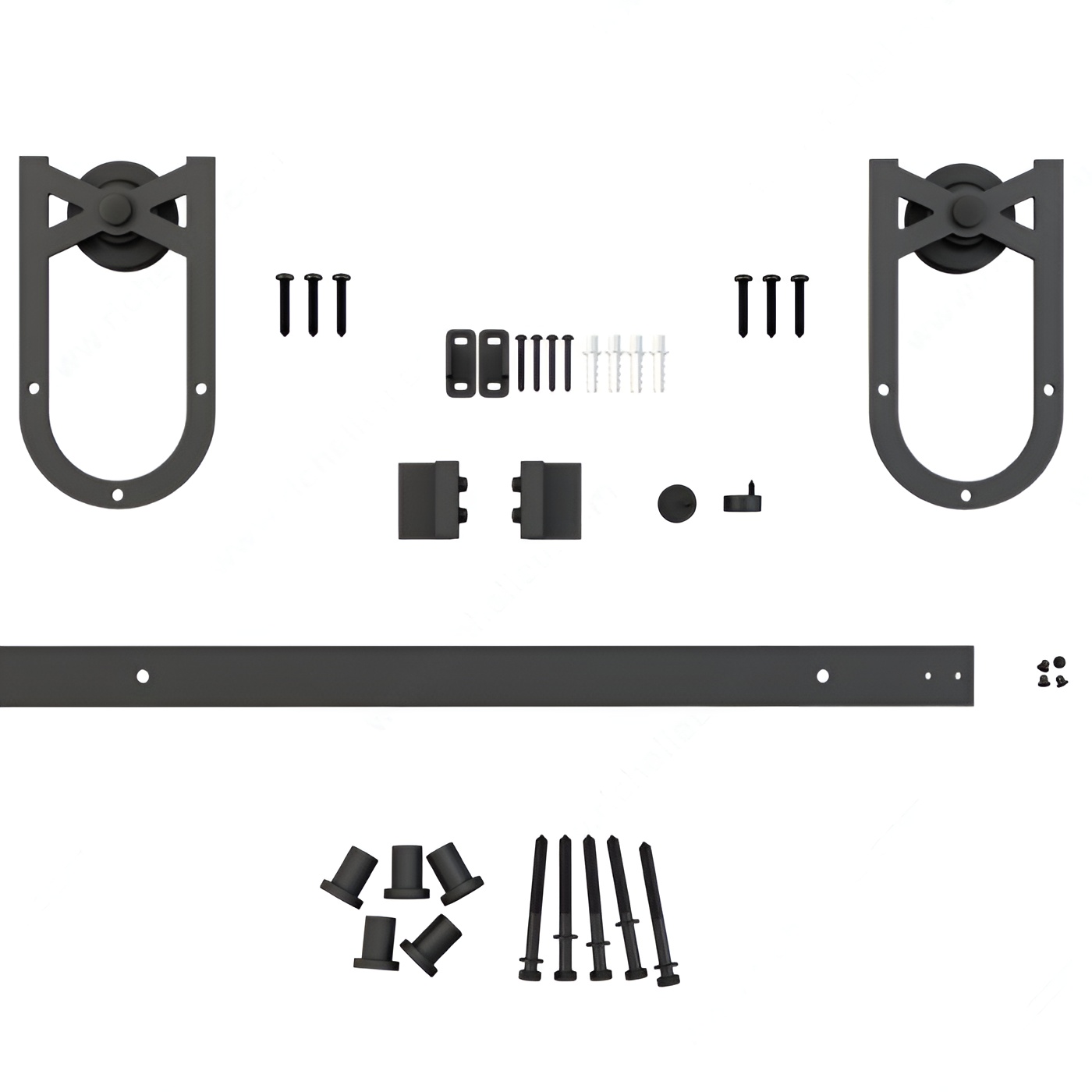 The BLACK KNIGHT Decorative Sliding Hardware Kit is a barn door U-shape bar-style system for wall mount wood doors weighing up to 220 lb (100 kg).