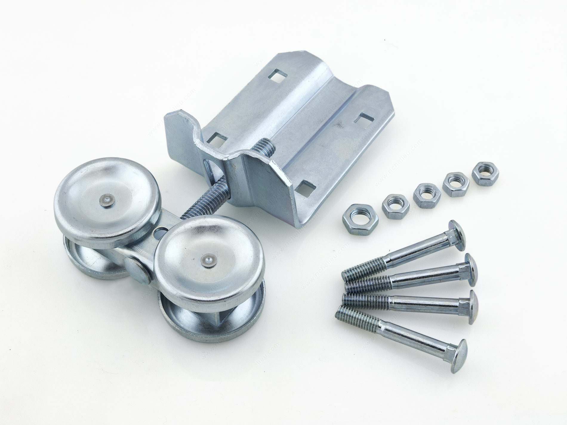 Richelieu 24651388XV Dual Axis Box Rail Hanger with Ball Bearings and Fixed Mounting Apron is the ideal choice for wood frame sliding barn doors, offering both functionality and reliability. This product is designed for straightforward installation, ensuring that you can set it up with ease. The hanger features laterally and vertically adjustable components, allowing for precise alignment and smooth operation. It supports a maximum door thickness of 2 inches and can accommodate a robust load capacity of up to 450 pounds, making it suitable for a variety of door styles and weights. Crafted from durable steel and finished in zinc plating, this hanger is built to withstand wear while maintaining a sleek appearance. With an overall length of 4 3/4 inches and a width of 2 15/32 inches, the compact design ensures it fits seamlessly into your barn door setup. Its ball bearing roller type guarantees a smooth and quiet sliding motion, enhancing the overall user experience. Suitable for a single door application, the Richelieu Dual Axis Box Rail Hanger is a top choice for both building professionals and discerning homeowners looking to elevate their interior or exterior spaces.