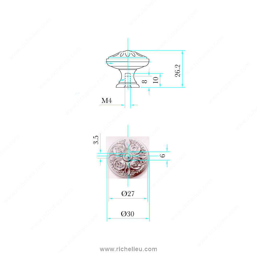 Richelieu 24850030222 Traditional Brass Knob - 2485 embodies elegance with its intricately engraved flower design, channeling the charm of the Louis XV style. This stunning brass knob offers a sophisticated European touch, making it an ideal enhancement for various furniture pieces or cabinetry, providing both functionality and aesthetic appeal. With an overall diameter of 1 3/16 inches and a projection of 1 1/32 inches, this knob is perfectly sized for easy handling while maintaining a refined presence. The Old America finish (Finish Number: 222) adds a timeless quality that complements a wide array of interior designs, from classic to contemporary. Crafted from durable brass, this knob not only assures longevity but also resists wear, ensuring it remains a focal point in your decor for years to come. It comes equipped with an M4 screw, which is included for your convenience, making installation straightforward. Whether you are a building professional or a knowledgeable homeowner, the Richelieu Traditional Brass Knob is an exceptional choice for those looking to elevate their space with a touch of classic elegance. Transform your furniture and cabinetry with this exquisite piece that seamlessly marries tradition with functionality.