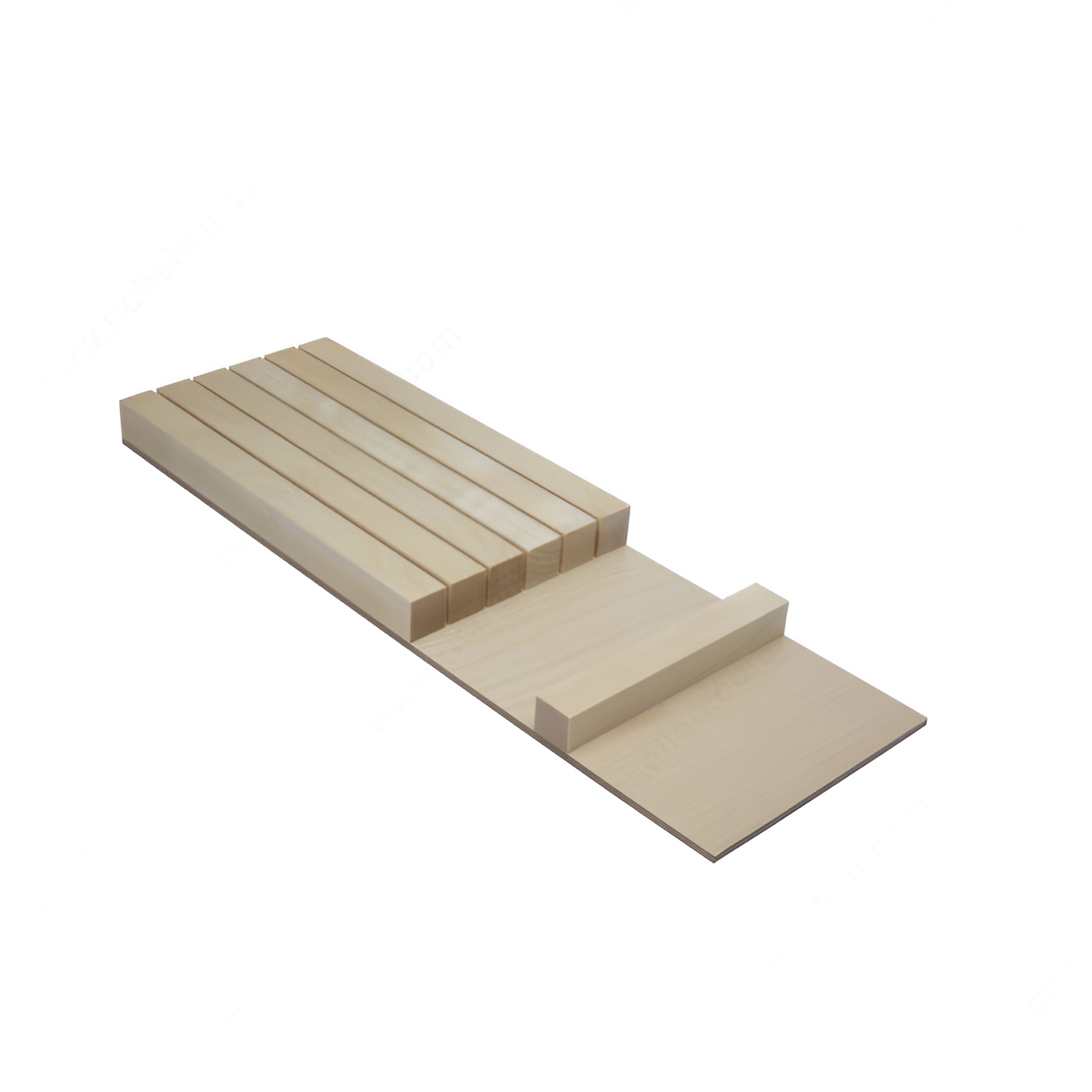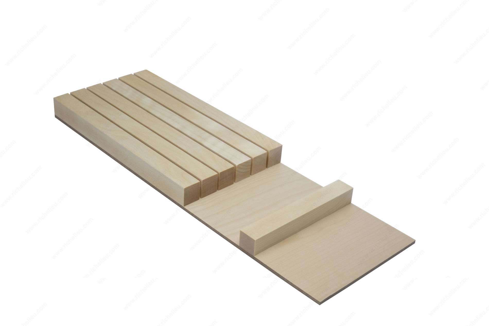 Richelieu 250534031 Knife Block Insert offers an elegant solution for knife storage, designed to accommodate up to five customized knives. This innovative insert is perfect for professionals and home chefs alike, providing a safe and organized way to keep kitchen knives accessible and protected. Available in two stylish finishes-birch and walnut-this knife block insert seamlessly integrates into any kitchen decor, enhancing both functionality and aesthetics. Measuring 16 3/4 inches in depth, 5 13/32 inches in width, and 1 1/32 inches in height, it is expertly crafted to fit snugly within your drawers, optimizing space without compromising on style. This product serves as an effective drawer organization solution, keeping your knives organized and easily reachable during food preparation. The dividers to insert design ensures that each knife is held securely in place, preventing movement that could dull blades or cause accidents. For convenience, the Richelieu 250534031 Knife Block Insert ships via UPS, making it accessible for quick delivery to your kitchen. Elevate your culinary space with this essential storage solution that combines practicality with a touch of elegance.
