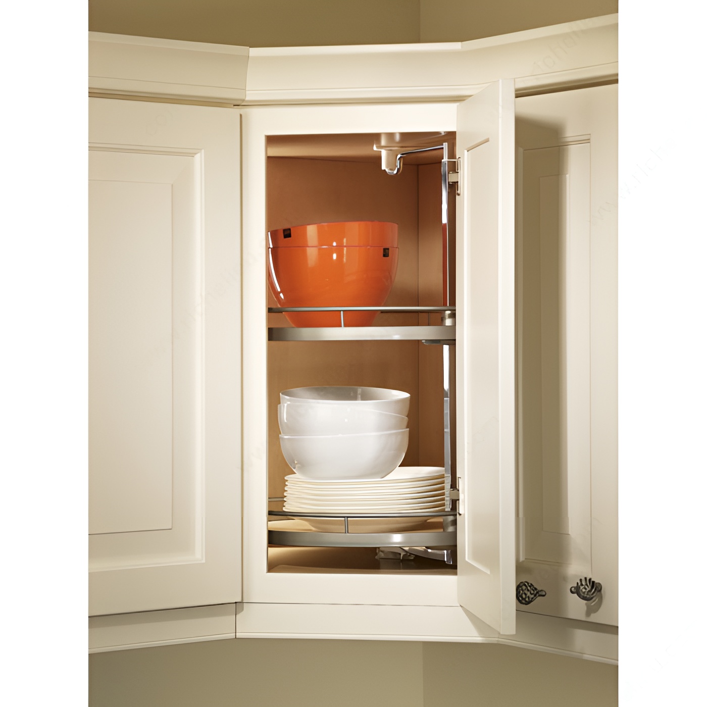 Richelieu 2561155150 Twister Arena US Shelf Kit is an innovative solution designed to maximize storage efficiency in corner cabinets. With a generous diameter of 19 11/16 inches, this kit includes two durable shelves that can each support up to 18 pounds, making it perfect for food storage, preparation, and general organizational needs. Crafted in a stylish Maple/Champagne finish, the Twister Arena seamlessly combines functionality and aesthetics, ensuring it enhances the look of any kitchen. The design requires a minimum interior depth of 22 1/8 inches and accommodates heights between 25 15/16 to 30 1/2 inches, making it versatile enough for various cabinet configurations. Whether you're a building professional or a knowledgeable homeowner, this shelf kit is an ideal choice for optimizing corner spaces, allowing easy access to items stored away. Each unit is packaged individually for straightforward installation, and it ships conveniently via UPS, ensuring you receive it promptly. Elevate your kitchen’s organization with the Richelieu Twister Arena US Shelf Kit, a smart addition that combines practical storage solutions with contemporary design.