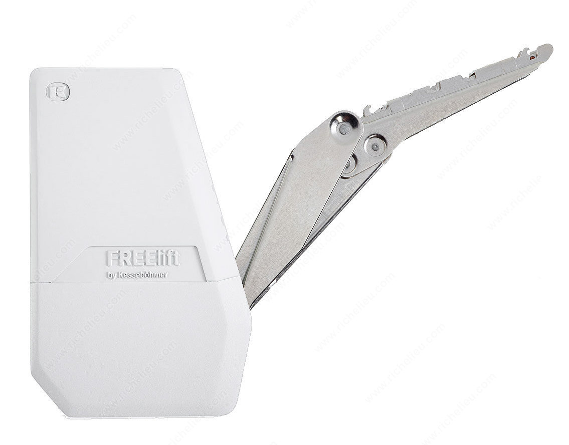 Richelieu 271662930 FREEflap Mini Lift System offers a practical and compact solution for modern cabinetry. Designed for wood doors, this system is engineered to provide reliable performance with a balanced lift mechanism that supports door heights ranging from 9 27/32 to 15 3/4 inches. The standout feature of the FREEflap Mini is its integrated multi-position stop, which allows the door to rest securely in any position, enhancing both convenience and functionality. With a hinge opening angle of +107°, this lift system facilitates smooth access and operation, making it an excellent choice for kitchens and other spaces where efficient design is essential. The crisp white finish complements a variety of decor styles, ensuring seamless integration into your cabinetry. The FREEflap Mini is designed for lift-up opening types, making it ideal for upper cabinets that require a reliable and easy-to-use solution. With a power factor ranging from 784 to 1,388, this system provides the necessary strength for smooth operation. Shipping is hassle-free via UPS, making it easy to incorporate this essential component into your next project. Upgrade your cabinetry with the innovative and sturdy Richelieu FREEflap Mini Lift System.