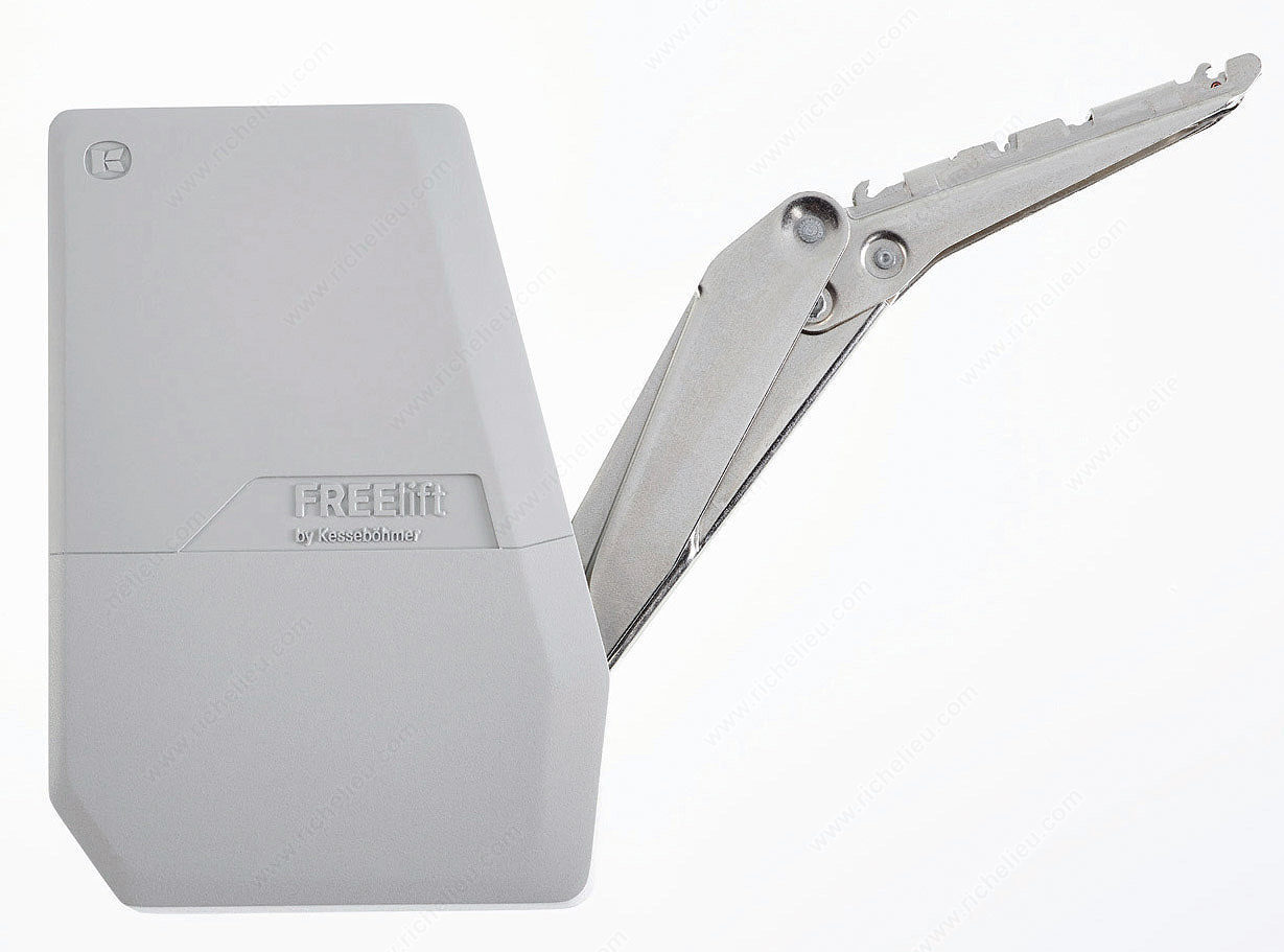 Richelieu 2716677100 FREEflap Forte Lift System offers a practical, balanced, and compact solution for your cabinetry needs. This robust lift system, known as the "little toughie" in the lifter family, is designed to provide exceptional performance with an integrated multi-position stop feature. This ensures that the front remains securely in any desired position, enhancing convenience and usability. Accommodating door heights ranging from 15 3/4 to 23 5/8 inches, this system is versatile enough to fit various cabinetry styles and sizes. The light gray finish adds a modern touch, seamlessly blending with contemporary kitchen aesthetics. With a hinge opening angle of +107°, the FREEflap system allows for easy access to your cabinet contents, making it an ideal choice for both residential and commercial applications. The lift-up opening mechanism is not only user-friendly but also engineered for durability, with a power factor that ranges from 5,962 to 9,000, ensuring reliable operation over time. Designed for efficient shipping via UPS, the Richelieu FREEflap Forte Lift System is the perfect addition to elevate your cabinetry functionality while maintaining a sleek, modern appearance. Upgrade your kitchen or workspace with this dependable solution from Richelieu.
