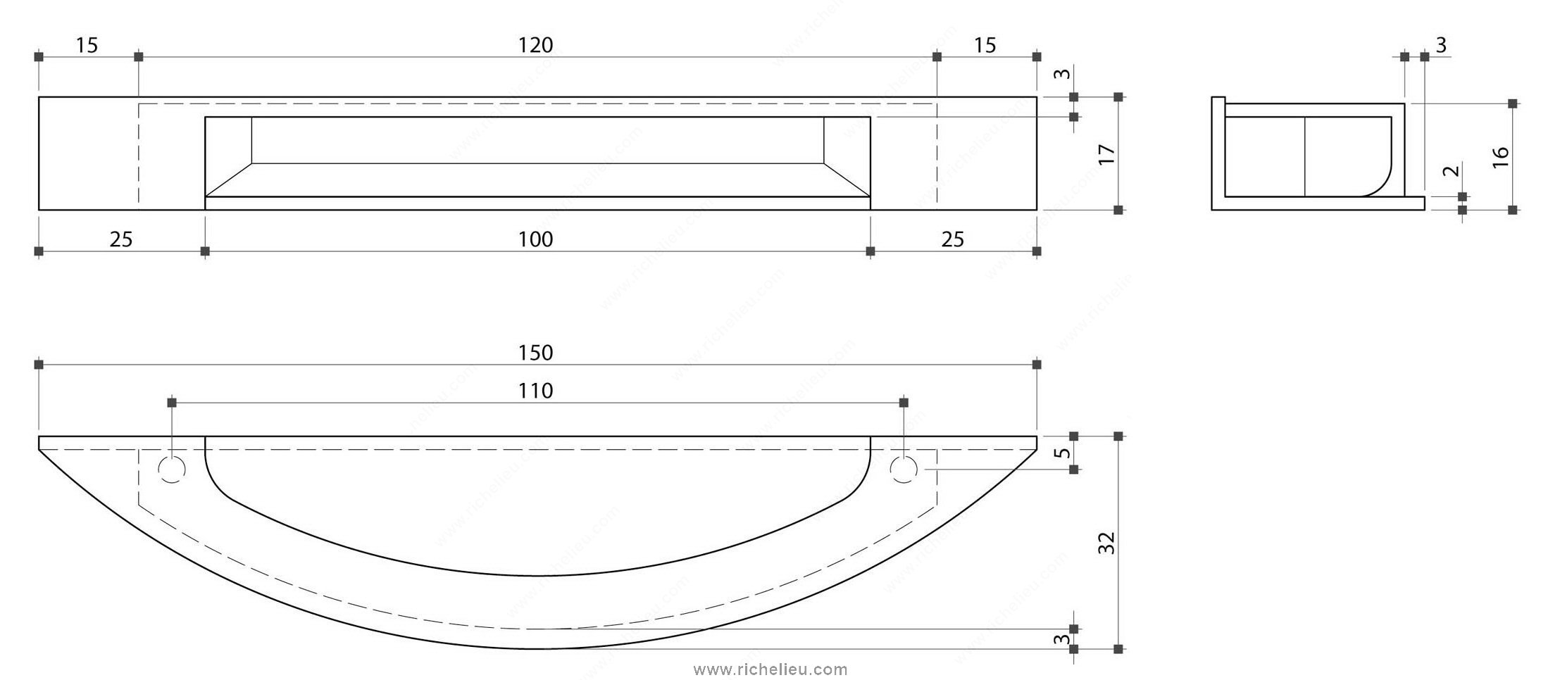 Richelieu 3110150195 Modern Recessed Metal Pull - 3110 features a sleek half oval design that seamlessly integrates into contemporary spaces. Crafted from durable metal, this pull boasts a brushed nickel finish that not only enhances its modern aesthetic but also ensures longevity and resistance to wear. The stylish gray and chrome color combination adds a refined touch, making it an ideal choice for both residential and commercial applications. With an overall length of 5 29/32 inches and a center-to-center measurement of 4 11/32 inches, this recessed pull is perfectly sized for various cabinetry and furniture projects. Its overall height measures 5/8 inches, with a projection of just 3/32 inches, allowing for a streamlined appearance without sacrificing functionality. The milling depth of 9/16 inches ensures a secure fit within your installation. Designed for easy installation, the Richelieu 3110150195 requires recessed screws (not included) for a clean finish. Whether you're updating kitchen cabinets or enhancing furniture pieces, this modern recessed pull adds a sophisticated touch to any design. Elevate your space with the perfect blend of form and function that this product delivers.