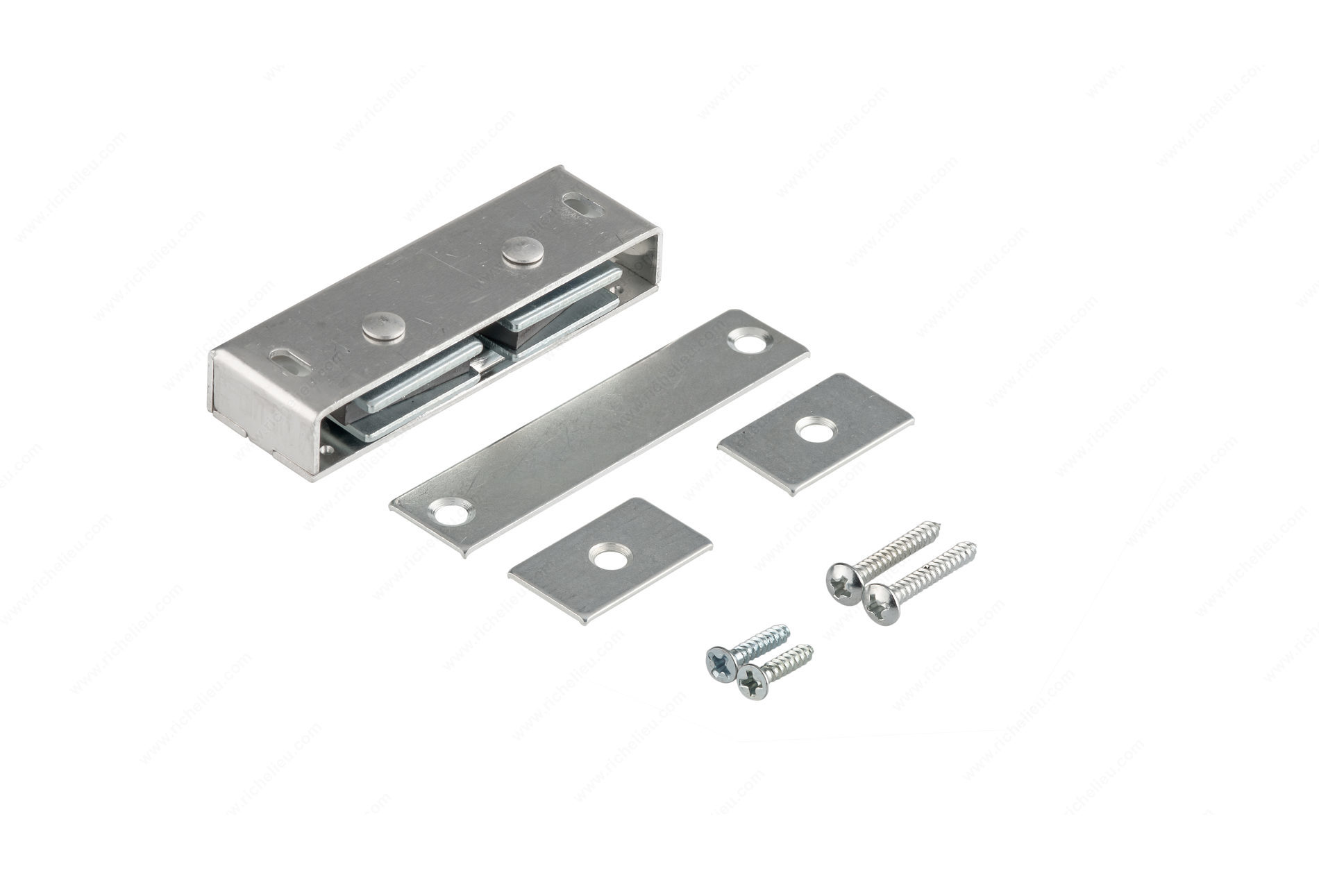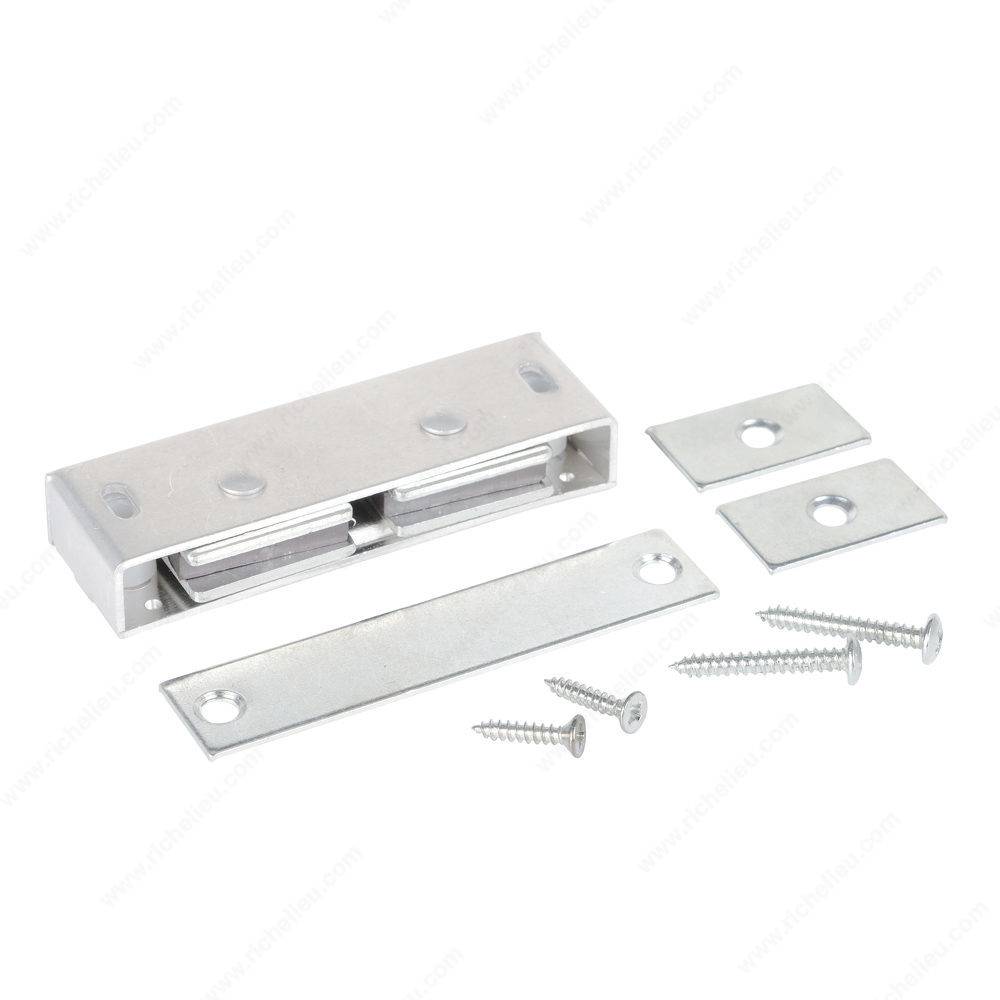 Richelieu 326A92 Double Pole Magnetic Catch - Heavy Duty offers a robust solution for securing double door cabinets and closet doors. Designed with strong self-aligning magnets, this catch ensures an optimal pull force, providing reliability and ease of use. With a holding power of 9.92 lbs, it effectively keeps doors firmly closed while maintaining a sleek appearance. This versatile catch can be either surface-mounted or mortised, allowing for flexibility in installation depending on your specific project requirements. Crafted from durable aluminum and finished in satin aluminum, it seamlessly integrates into various cabinetry styles, enhancing both functionality and aesthetics. Measuring 3 5/32 inches in width, 1 1/16 inches in depth, and 9/16 inches in height, the Richelieu 326A92 is designed to fit perfectly in tight spaces without compromising performance. Its center-to-center distance of 2 5/8 inches makes it compatible with a wide range of applications. Each catch comes complete with a plate and screws for straightforward installation. Whether you’re a building professional or a knowledgeable homeowner, the Richelieu 326A92 Double Pole Magnetic Catch - Heavy Duty combines strength and elegance, making it an essential addition to your cabinetry projects.