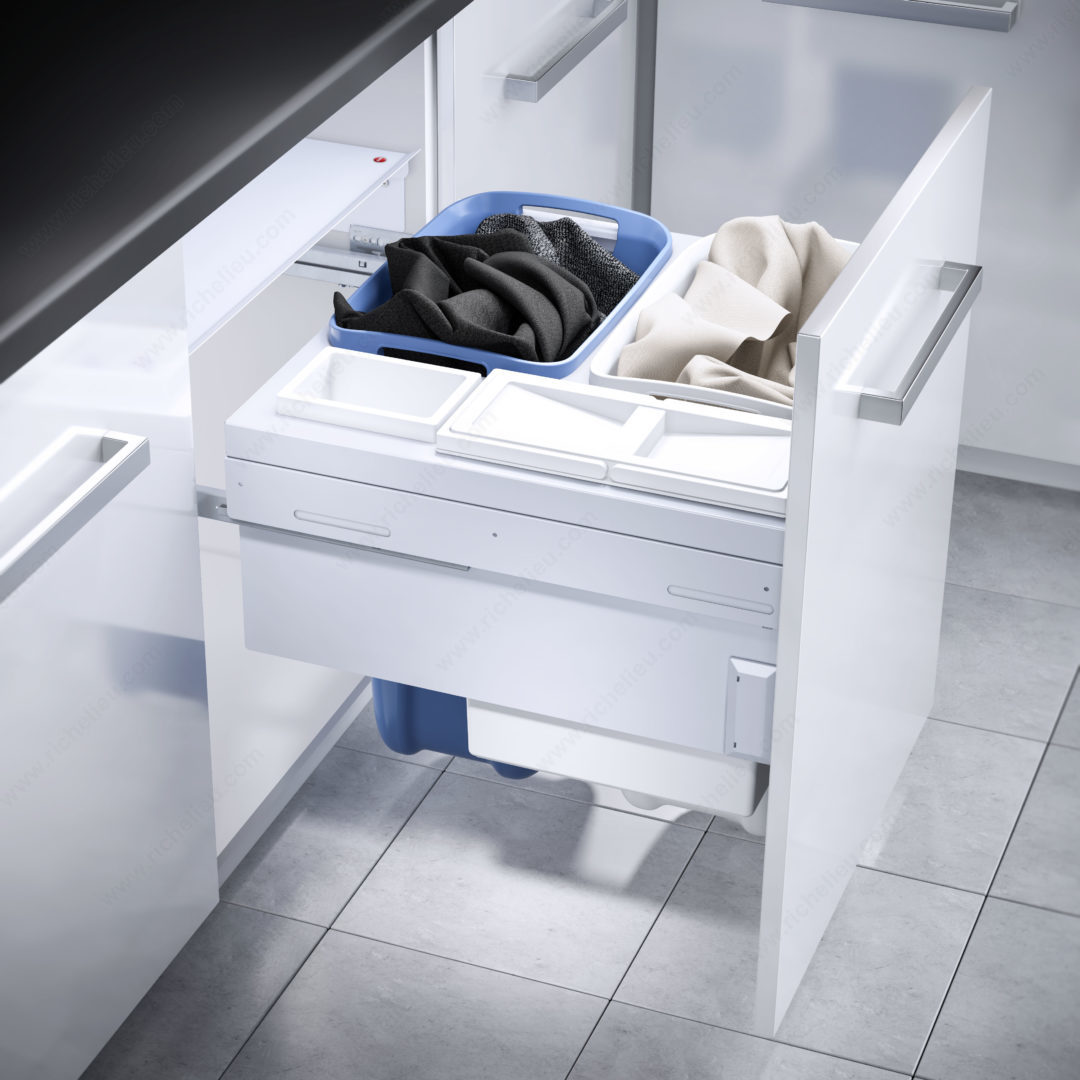 Richelieu 32716030 Hamper Basket with Synchronized Slides offers a practical and stylish solution for managing dirty laundry. Designed to maximize efficiency, this hamper features synchronized slides that ensure smooth operation when accessing your laundry items. With a sleek white finish, it complements various cabinetry styles while adding a touch of elegance to your space. This product is designed for cabinets with a minimum width of 23 5/8 inches and requires specific interior dimensions: a minimum depth of 20 7/8 inches and a height of at least 21 5/8 inches. The hamper can hold up to 110 pounds, making it ideal for busy households. It includes four bins, allowing for organized sorting of laundry, and the soft-closing mechanism ensures a quiet and gentle closure every time. The durable metal construction guarantees longevity and reliability, making it a perfect addition to any laundry room or bathroom. With easy UPS shipping, the Richelieu hamper is both a functional and stylish choice for those looking to streamline their laundry process. Elevate your laundry management with the Richelieu 32716030 Hamper Basket and enjoy a tidier, more organized home environment.