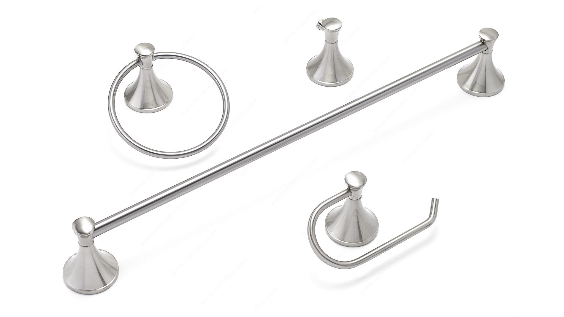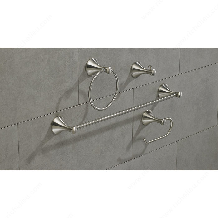 Richelieu 35449 Value Pack - Palermo Collection offers a stylish upgrade for your bathroom with its thoughtfully curated 4-piece set. This collection includes a bathroom hook, a towel ring, a tissue holder, and a generous 24'' towel bar, all designed to provide functionality without sacrificing aesthetics. Finished in brushed nickel, the Palermo Collection embodies contemporary elegance, making it a perfect fit for modern bathroom designs. Crafted from durable metal, each piece in this collection promises lasting quality and resilience against daily use. The sleek lines and minimalist design not only enhance your space but also create a cohesive look that complements various decor styles. Whether you’re renovating or simply looking to refresh your bathroom, this set brings both practicality and sophistication. Richelieu’s commitment to quality is evident in the craftsmanship of the Palermo Collection, ensuring that each item not only meets but exceeds your expectations. With easy UPS shipping, transforming your bathroom has never been more convenient. Elevate your space with the Richelieu Palermo Collection-where style meets functionality in every detail.