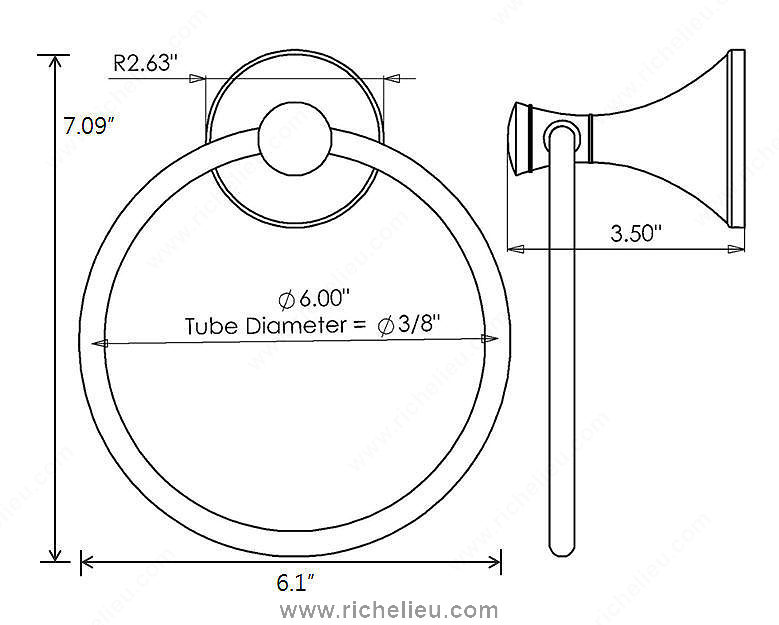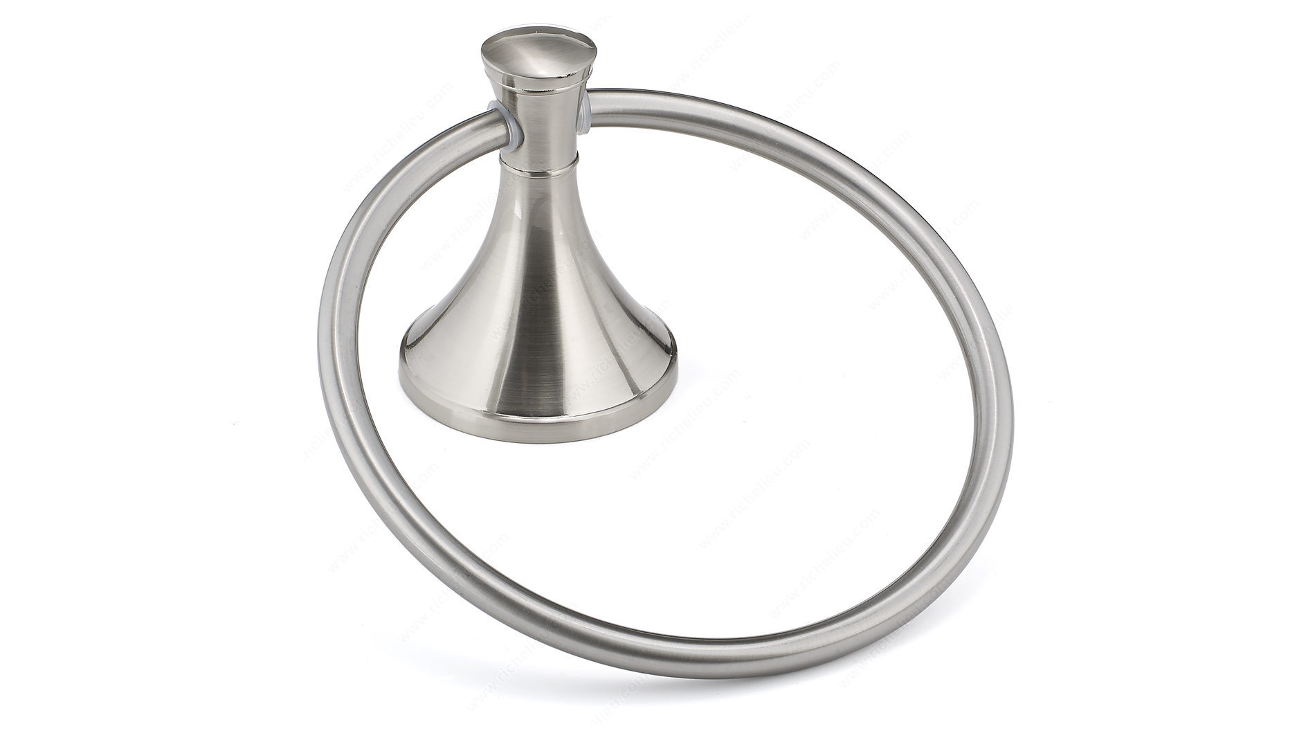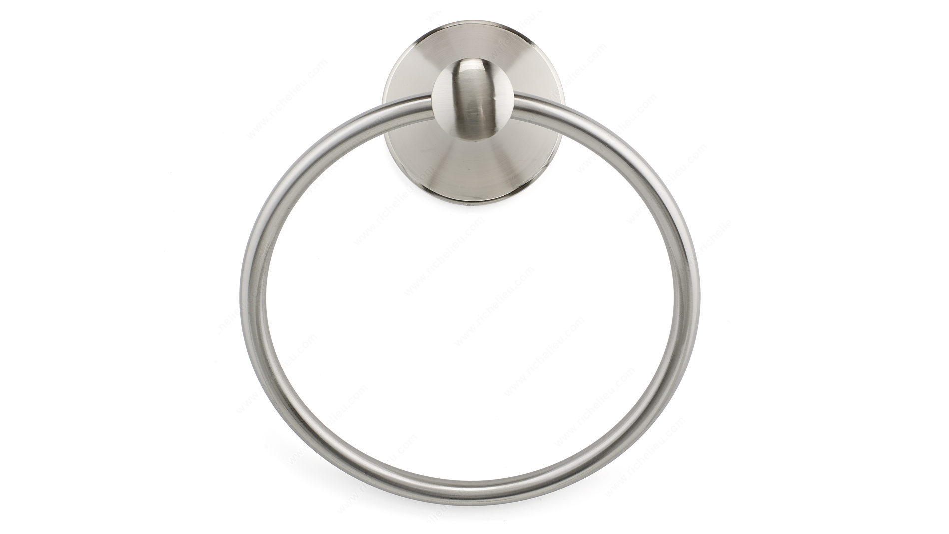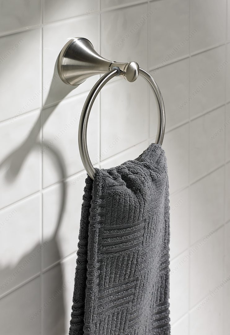 Richelieu 35649 Towel Ring - Palermo Collection enhances your bathroom's aesthetic with a modern touch that seamlessly integrates into any décor. Crafted from durable metal, this towel ring features a brushed nickel finish that not only adds a contemporary flair but also ensures lasting durability and resistance to tarnishing. With overall dimensions of 7 3/32 inches in height, 6 3/32 inches in width, and a projection of 3 1/2 inches, it provides ample space for hanging towels, making it a practical choice for daily use. The design reflects a streamlined elegance that elevates the overall ambiance of your bathroom. Installation is a breeze, as the mounting hardware is included and features concealing screws for a polished look. Whether you’re renovating or building a new space, the Palermo Collection offers a cohesive style that complements various design themes. Richelieu's commitment to quality is evident in every detail of this towel ring, making it a perfect addition for both building professionals and discerning homeowners. Experience the blend of functionality and sophistication with the Palermo Towel Ring, a stylish solution for your bathroom organization needs.