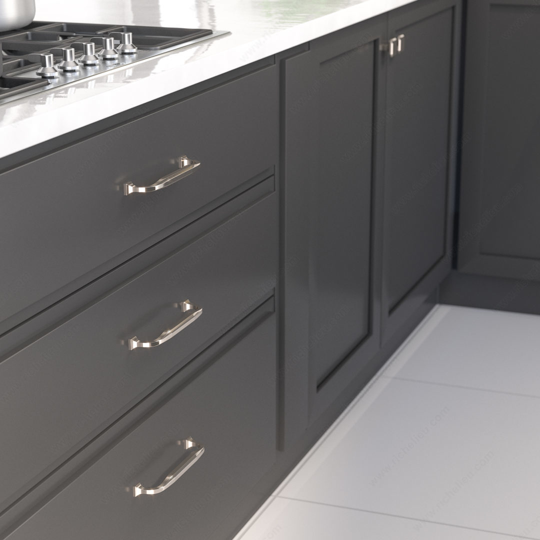 Richelieu 3921160180 Transitional Metal Pull – 3921 offers a sophisticated blend of design and functionality, perfect for enhancing the visual appeal of your furniture and cabinetry. This pull features an elegant design characterized by subtle curves and flared square feet, seamlessly integrating into both modern and traditional interiors. Crafted from durable zamak, this pull is finished in polished nickel, providing a sleek gray and chrome appearance that adds a refined touch to your space. With an overall length of 6 27/32 inches and a center-to-center measurement of 6 5/16 inches, it is well-suited for various cabinetry applications. The projection of 1 11/32 inches ensures a comfortable grip, making it easy to open drawers and doors. Installation is straightforward, thanks to the included M4 screws, making it a practical choice for both professionals and DIY enthusiasts. The pull's dimensions of 9/16 inches in width provide a balanced and unobtrusive look, while its transitional style complements a wide range of design aesthetics. Part of the 3921 collection, the Richelieu 3921160180 Transitional Metal Pull is a smart addition to any renovation or new build, delivering both style and substance.