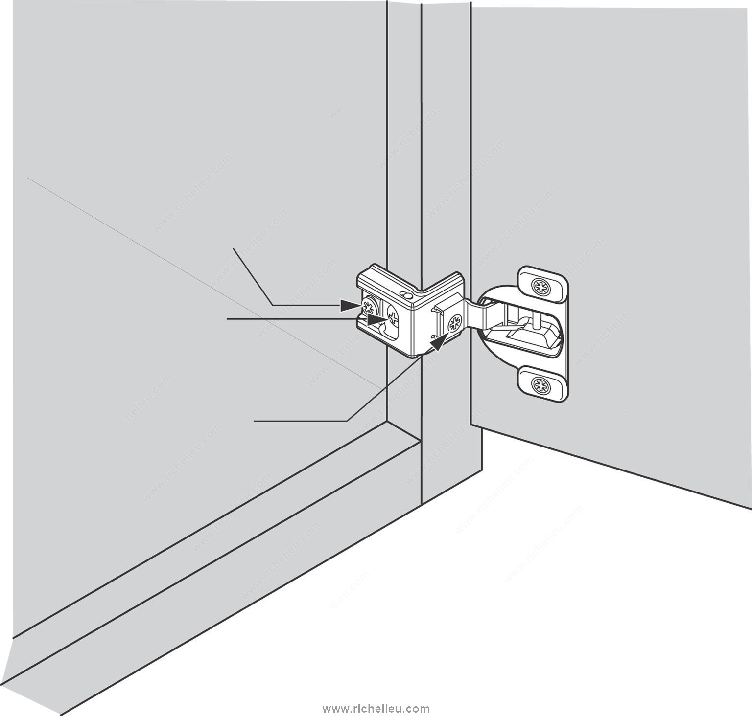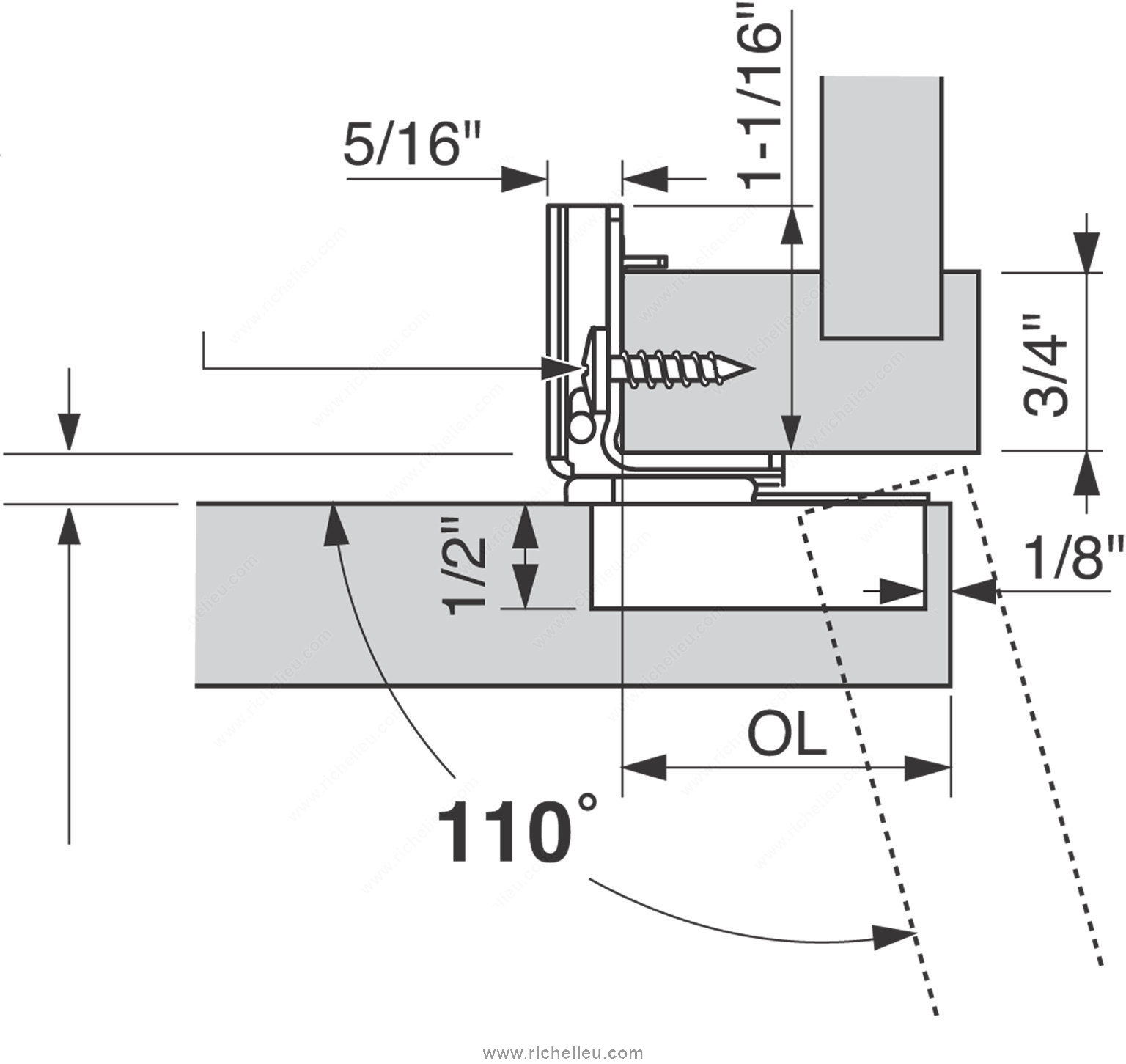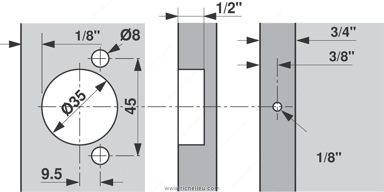 Richelieu 39C35822180 COMPACT 39C Hinge 110 offers a reliable solution for face frame cabinets, combining versatility with ease of use. These concealed hinges are designed for both small and large overlays, making them an excellent choice for various cabinet applications. With adjustable dimensions in side, height, and depth, users can achieve precise alignment and optimal functionality. Constructed from durable steel and finished in sleek nickel, this hinge supports a maximum cabinet and door thickness of 3/4 inch, ensuring compatibility with a wide range of cabinetry. The hinge opening angle of +110° facilitates effortless access, enhancing user experience. Featuring a spring-closing mechanism, the hinge ensures doors close smoothly and securely, providing peace of mind. Installation is simple with a wraparound type mounting and knock-in fixing method, although screws or nails are not included. The required milling depth is 1/2 inch with a milling diameter of 1 3/8 inches, allowing for seamless integration into your cabinetry. Each hinge is sold per unit, making it easy to order the exact quantity needed for your project. Choose the Richelieu COMPACT hinge for an efficient and stylish addition to your cabinetry that meets both practical and aesthetic needs.