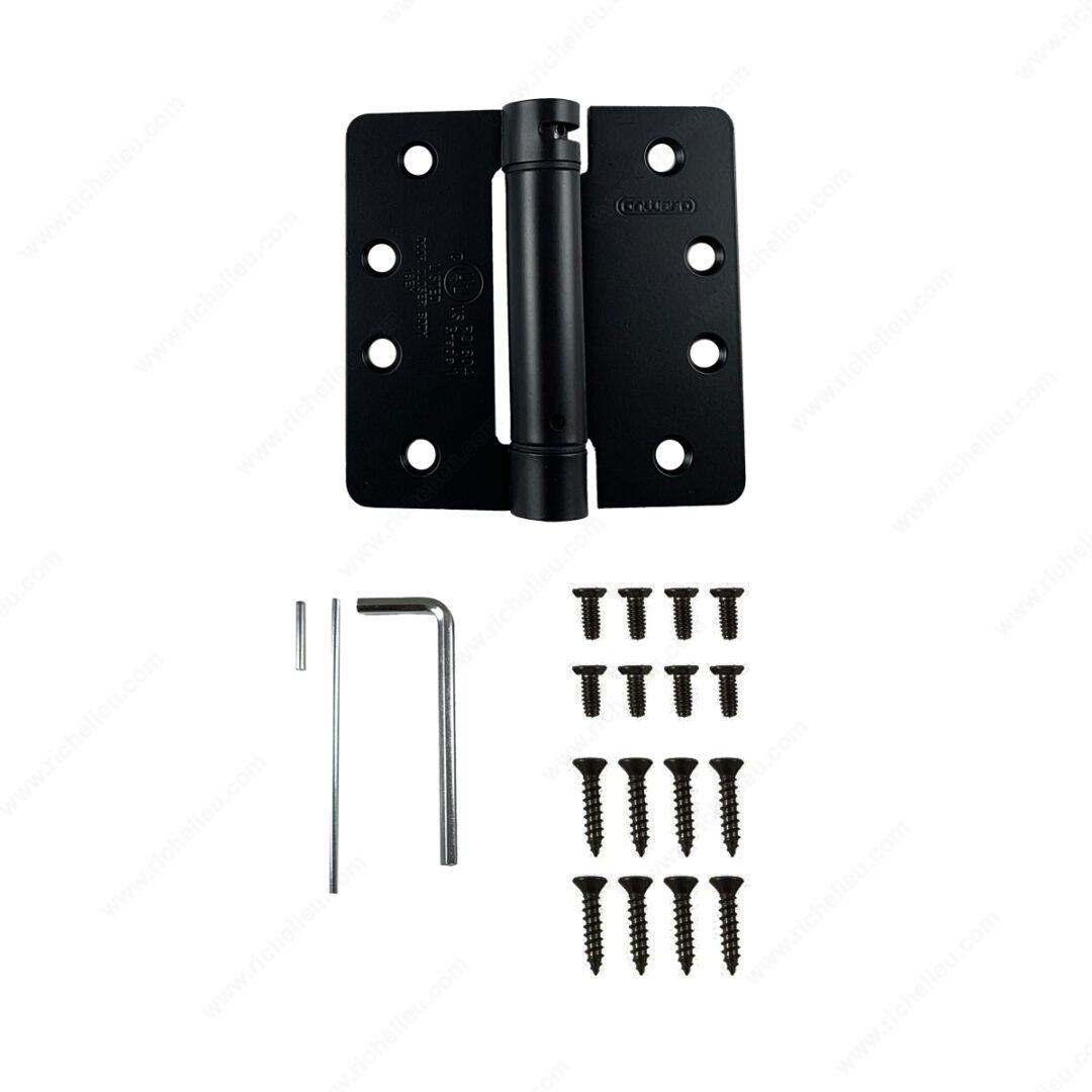 Richelieu 52822FBB1 4" Full Mortise Adjustable Spring Hinge offers a perfect blend of versatility and style, making it an essential addition to any home. Designed for modern aesthetics, this hinge allows you to adjust the spring tension, enabling you to customize it according to your preferences for optimal door operation. Constructed from durable steel with a sleek flat black finish, this hinge not only enhances functionality but also adds a contemporary touch to your interiors. Its robust design supports up to 110 lbs when used with three hinges, ensuring reliability and strength for your doors. The non-removable pin feature adds an extra layer of security, making it suitable for various applications. Included with the hinge are eight #10 x 1" wood screws and eight #10-24 x 1/2" machine screws, facilitating straightforward installation. With a height and width of 4 inches and a thickness of 3/32 inches, this hinge is designed to fit snugly into a 1/4" radius corner. Certified by UL for safety standards, the Richelieu 52822FBB1 is an ideal choice for adjustable spring applications, providing both functionality and a refined look to your spaces.