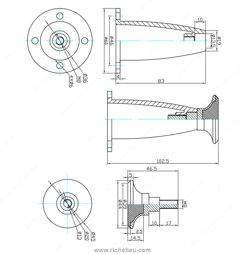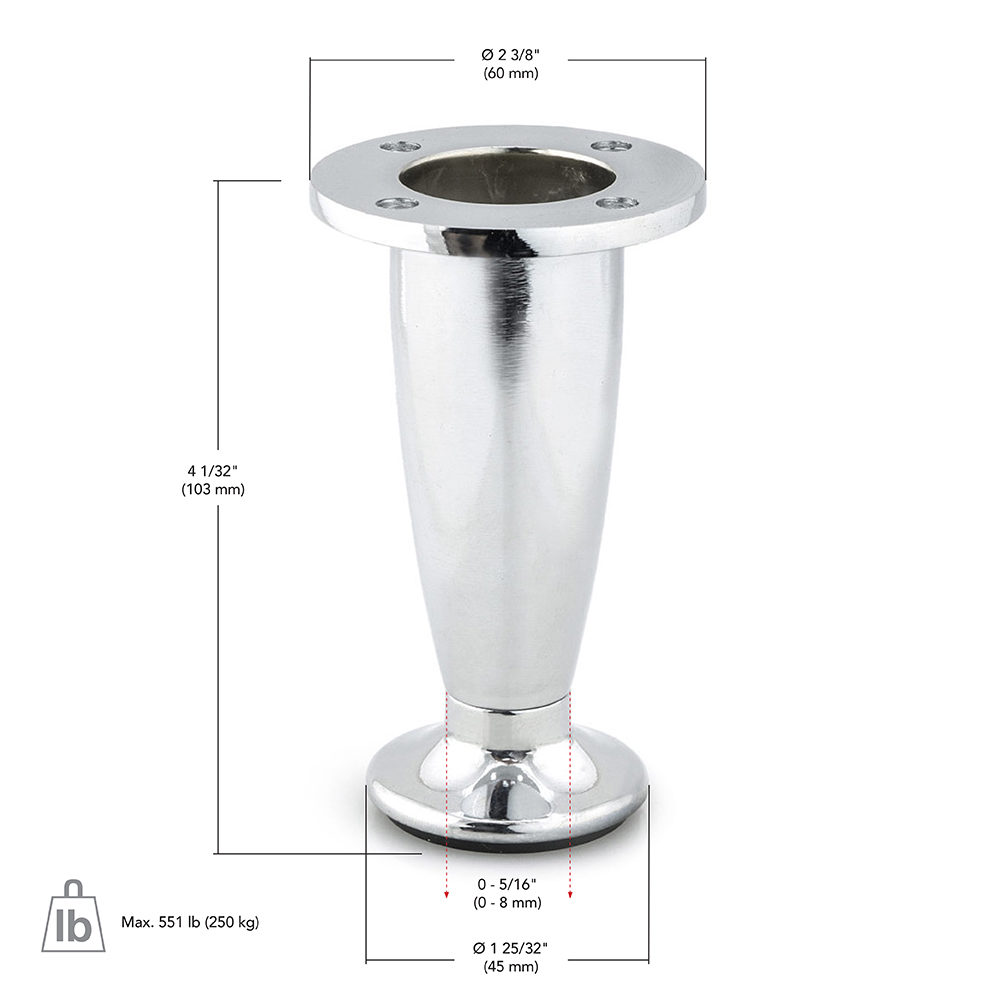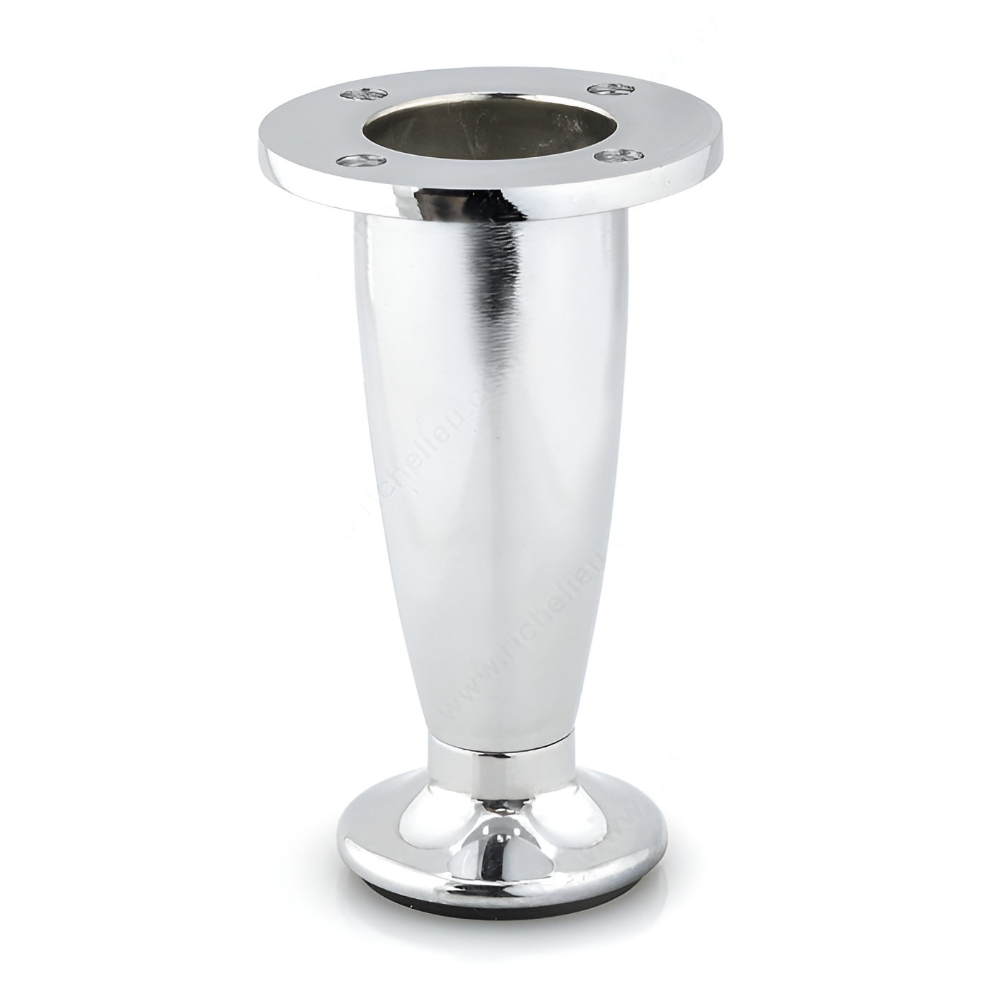 Richelieu 40740140 Contemporary Furniture Leg - 407 combines style and functionality, making it an ideal choice for both cabinets and upholstered furniture. Crafted from durable metal with a sleek chrome finish, this leg adds a modern touch to any décor while ensuring lasting performance. Standing at a height of 4 1/32 inches, the leg features a base diameter of 1 25/32 inches and a leg diameter of 2 3/8 inches, providing robust support for your furniture. With an impressive load capacity of 551 pounds per leg, it can easily handle the weight of heavy items without compromising stability. One of its standout features is the integrated glide, designed to protect your floors from scratches while ensuring smooth movement. The leg also offers adjustability of up to 5/16 inches, allowing you to achieve the perfect height for your furniture. Designed for easy shipping via UPS, the Richelieu 40740140 leg is not only practical but also enhances the overall aesthetic of your space. Whether you're upgrading existing furniture or creating something new, this contemporary furniture leg is a reliable and stylish choice for any project.