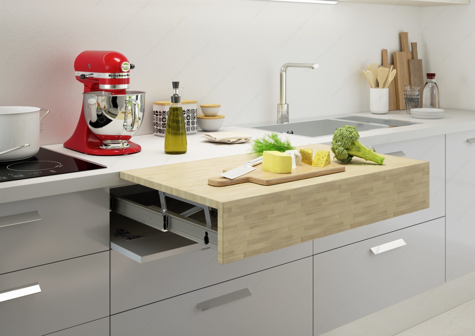 Richelieu 4117171010 OPLA-TOP Table Extension Mechanism enhances your workspace by providing an expandable countertop solution. Ideal for kitchen preparation and cooking, this side table effortlessly extends your work surface by an impressive 20 7/8 inches, allowing for increased efficiency and functionality in your culinary endeavors. Constructed from durable anodized aluminum, the OPLA-TOP mechanism not only offers a sleek finish but also supports a substantial capacity of up to 88.2 lbs, making it suitable for heavy-duty tasks. To ensure a seamless fit, the required interior dimensions are a minimum of 20 7/8 inches in depth and 4 23/32 inches in height, with a width range between 16 1/4 to 33 7/8 inches. This table extension mechanism is designed for versatility, making it an essential addition to any kitchen. It ships conveniently via UPS, allowing for easy delivery and installation. Whether you are preparing meals or hosting gatherings, the Richelieu OPLA-TOP provides the extra space you need without compromising style or durability. Upgrade your kitchen experience with this functional and elegant solution from Richelieu.