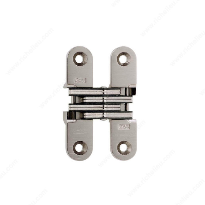 Richelieu 429208185 Concealed Steel Hinge - Model 208 offers an exceptional blend of aesthetic appeal and durability, making it an ideal choice for both wood and metal doors. Designed with a contemporary style, this hinge is perfect for various applications, ensuring a seamless installation process that meets your specific needs. This hinge features a +180° opening angle, providing maximum accessibility without compromising functionality. The satin nickel finish not only enhances its visual appeal but also ensures longevity in performance. With a minimum door thickness requirement of 1 inch, it can accommodate a range of door styles. The reversible handing allows for flexible installation options, making it versatile for different projects. With dimensions of 2 3/4 inches in length and 5/8 inch in width, the hinge is compact yet robust. The mortise mounting type ensures a clean and professional finish, while the included screws make installation straightforward. The hinge gap in the closed position measures 3/64 inch, and the door/jamb gap is 9/64 inch, maintaining precision in alignment. Richelieu's concealed hinge model is a perfect choice for building professionals and knowledgeable homeowners seeking reliable, stylish hardware solutions.