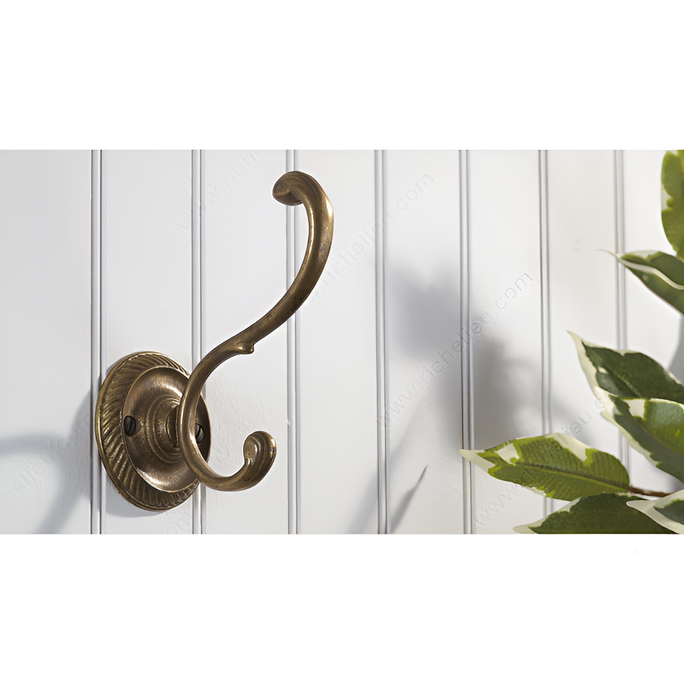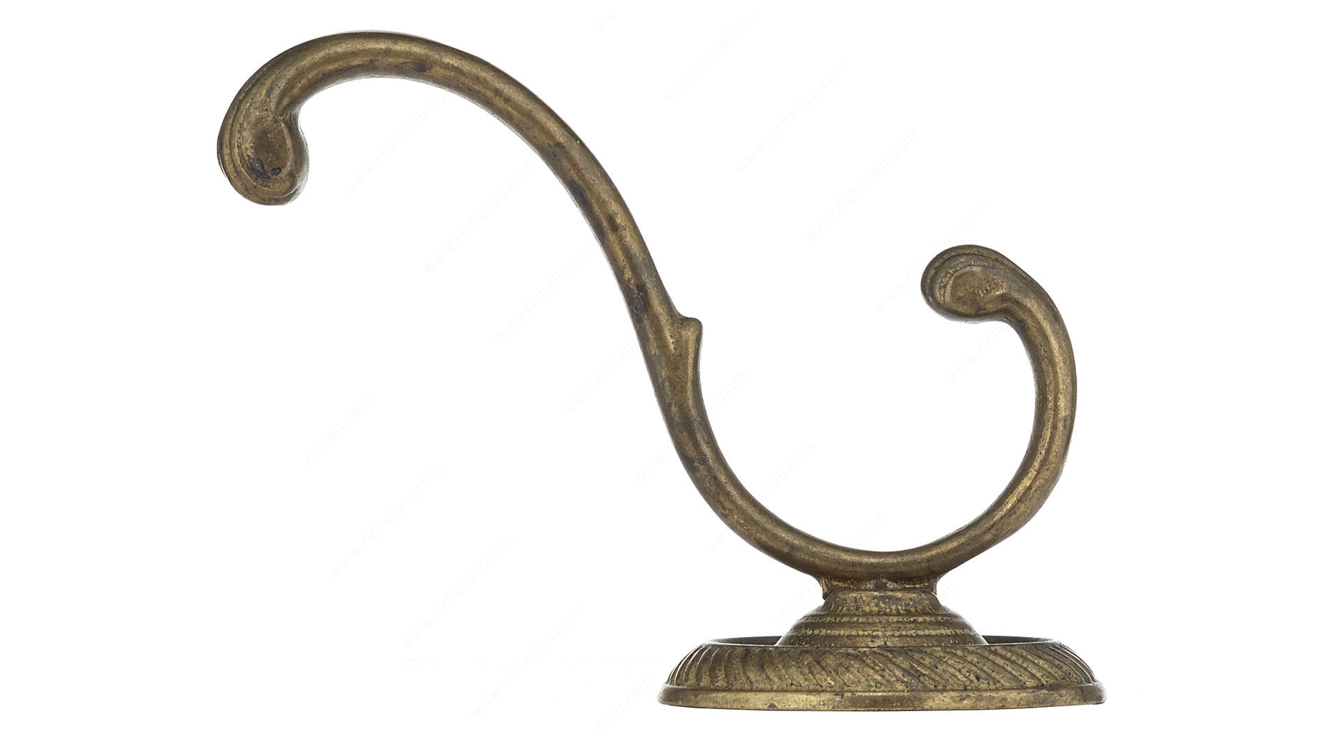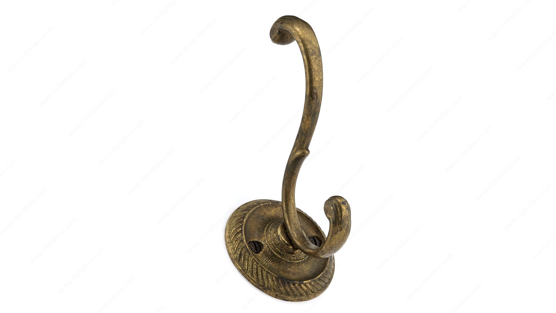 Richelieu 43113163 Classic Coat Hook - 4 in offers a blend of elegance and functionality that enhances any space. Crafted from durable metal, this double hook design not only provides ample storage but also introduces a sophisticated aesthetic, reminiscent of delicate plant tendrils. With an oxidized brass finish, the coat hook boasts a striking yellow and brass color that complements various decors, making it suitable for bedrooms, bathrooms, entryways, mudrooms, or closets. Measuring 3 27/32 inches in height and 3 5/8 inches in both width and projection, this hook is designed to fit seamlessly into any area where hooks are needed. The center-to-center measurement of 1 11/32 inches ensures easy installation, and the included wood screws simplify the mounting process on walls or doors. With a load capacity of 22 pounds, this classic coat hook is not only stylish but also sturdy enough to hold your essentials securely. Whether you’re looking to upgrade your home or add a decorative touch to a commercial space, the Richelieu Classic Coat Hook is the perfect choice for those seeking quality and style in one functional accessory.