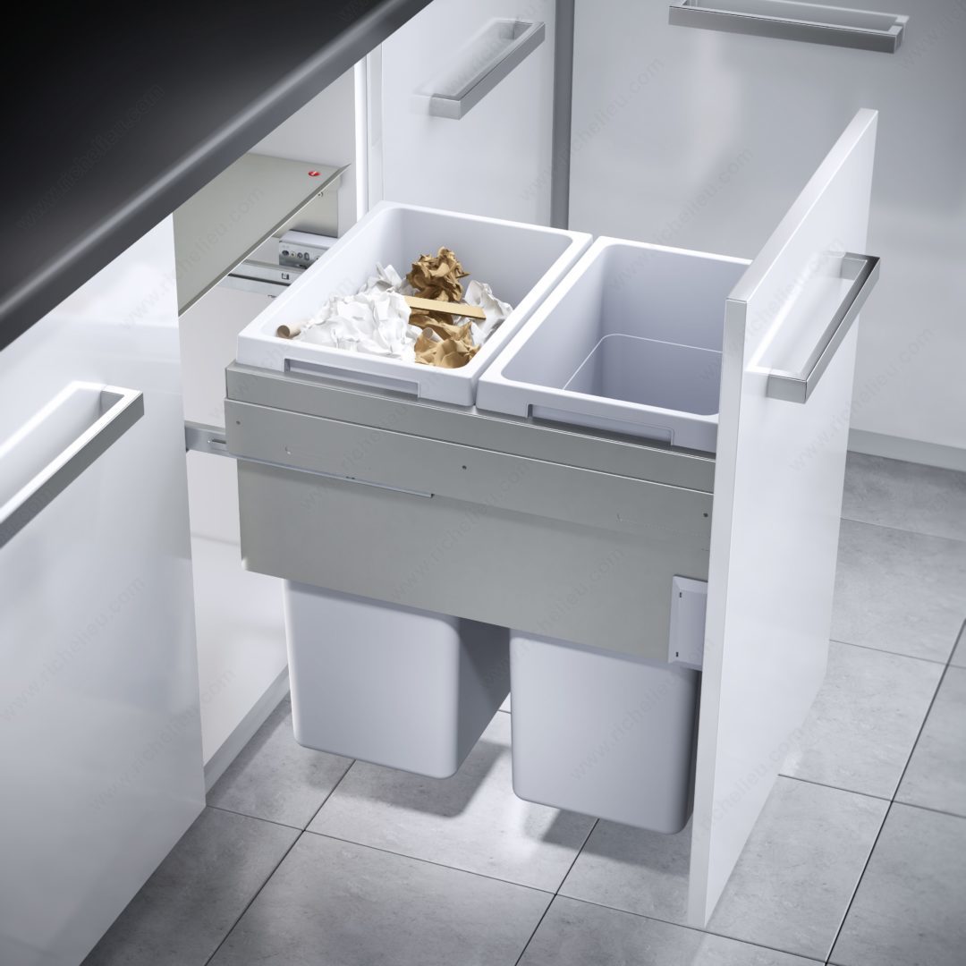 Richelieu 471950100 SE Cargo Recycling Center - Synchronized offers an efficient solution for waste management with its innovative design tailored for modern kitchens. This recycling center accommodates 2 to 4 bins, providing ample capacity to handle up to 80.3 quarts of waste. The system features over-travel synchronized slides that ensure smooth, effortless operation, while the soft-close mechanism minimizes noise and prevents slamming, enhancing user experience. Constructed from durable metal and polymer, this recycling center is built to withstand daily usage with a maximum load rating of 110 pounds. The unit requires specific interior dimensions for optimal installation: a minimum depth of 20 3/4 inches, a height of at least 21 5/8 inches, and a width of 18 1/4 to 18 3/8 inches. Its sleek silver gray finish adds a contemporary touch, allowing it to blend seamlessly into any kitchen decor. Designed for efficiency in cleaning and preparation areas, the Richelieu Cargo Recycling Center is a practical addition for both building professionals and discerning homeowners. With the ability to ship via UPS, it is easy to integrate this essential product into your next project. Experience the perfect balance of functionality and style with this exceptional recycling solution.