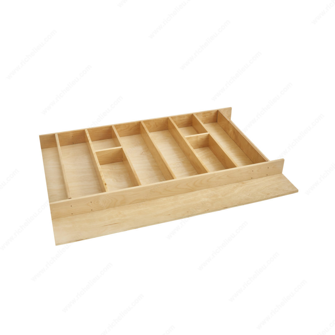 Richelieu 4WUT361 Rev-A-Shelf wood Insert for Large Drawer offers a sophisticated solution for organizing cutlery and utensils. Designed specifically for bottom drawer cabinets with a maximum exterior width of 3 feet (914.4 mm), this versatile insert is crafted from natural maple, ensuring durability and a timeless aesthetic. With dimensions of 22 inches in depth and 2 7/8 inches in height, the 4WUT361 provides ample space for your kitchen essentials. The insert can be cut to size, allowing for a customizable fit that meets your specific storage needs. Its design features a large area dedicated to utensils, complemented by multiple fixed and adjustable compartments, enabling efficient organization of knives, forks, spoons, and other cooking tools. Ideal for various areas of activity, including storage, preparation, and cooking, this wood insert not only enhances functionality but also adds a touch of elegance to your kitchen. The natural finish highlights the beauty of the wood while ensuring easy maintenance. Whether you're a building professional or a knowledgeable homeowner looking to optimize kitchen storage, the Richelieu 4WUT361 is a practical and stylish choice that combines form and function seamlessly.
