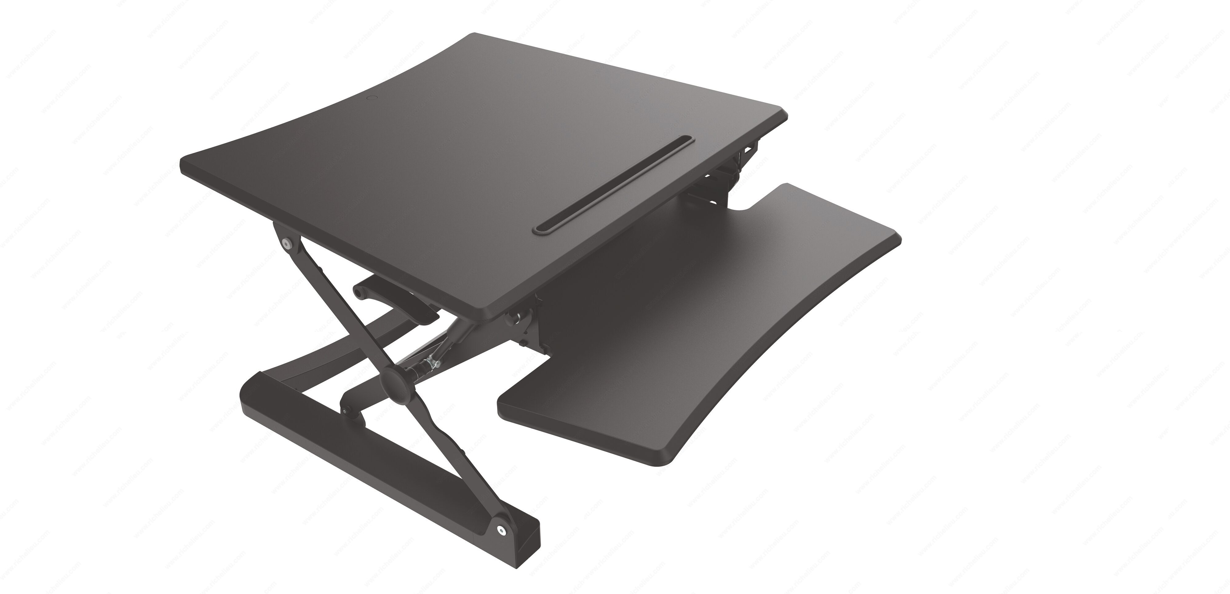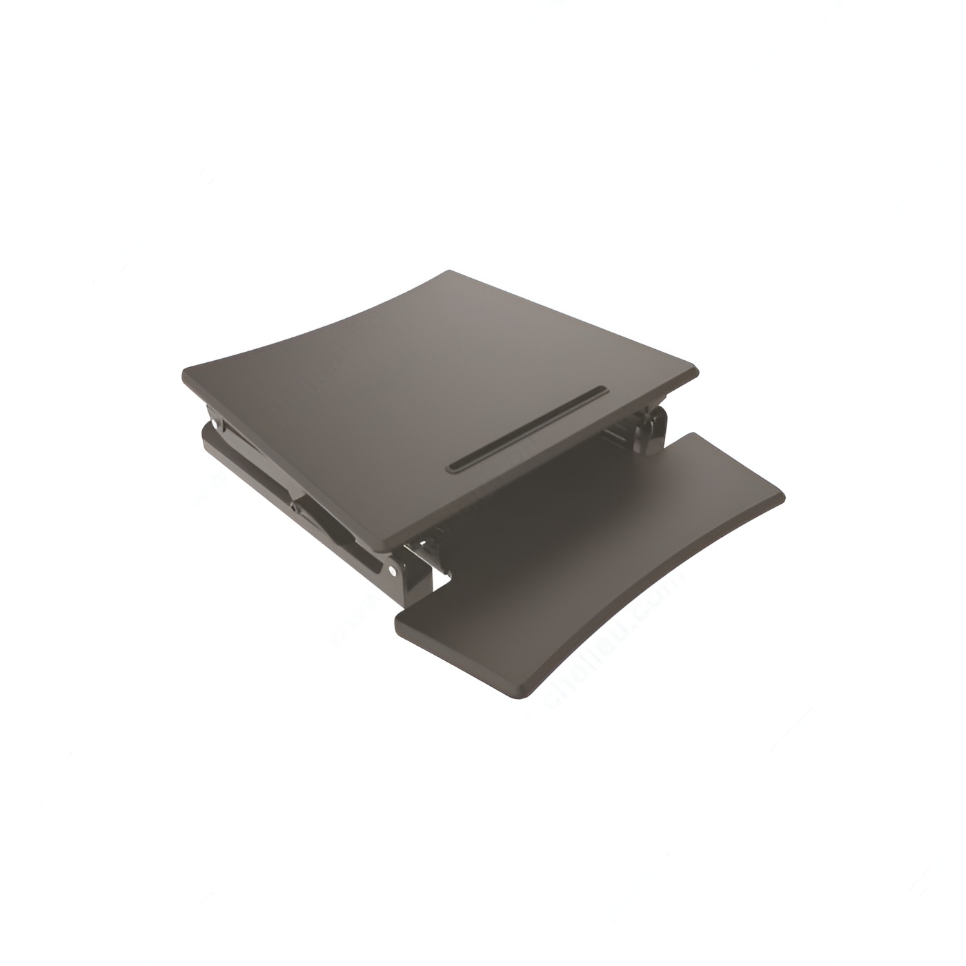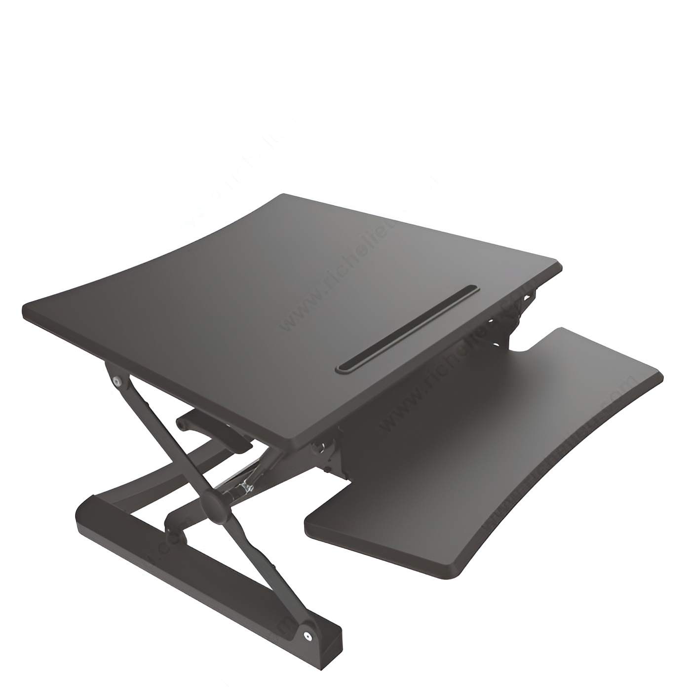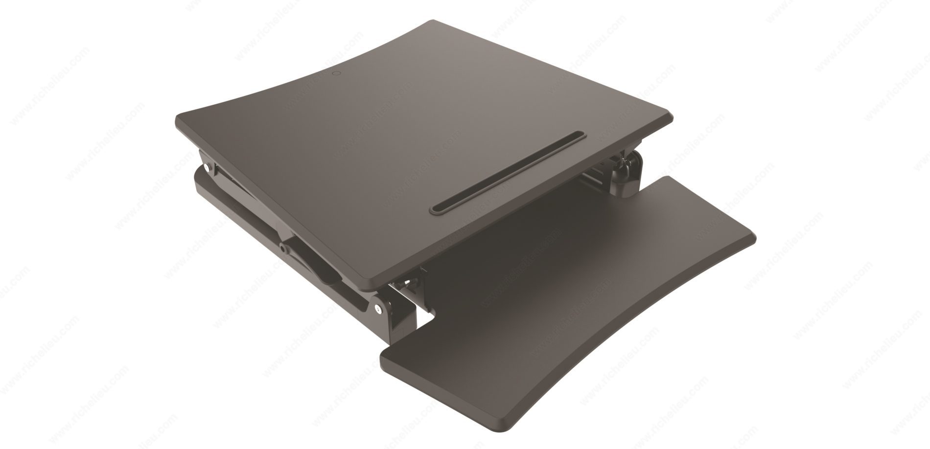 Richelieu 500S2S90 Topper 3 Series Desktop Sit-Stand Workstation offers an ergonomic solution for modern workspaces, enhancing productivity and comfort. This workstation features a gas spring mechanism that provides smooth support, allowing for effortless height adjustments. With two easy-to-use knobs on each side, users can choose from 15 different height positions, accommodating a range of preferences and promoting a healthier standing posture. The generous tabletop measures 26.77 inches by 22.83 inches, providing ample space for a single monitor setup, while the keyboard tray, sized at 12.8 inches by 26.77 inches, ensures a comfortable typing experience. Crafted from durable steel, this workstation not only boasts a sleek black finish but also supports a load capacity of up to 33 pounds, making it suitable for various equipment setups. Overall dimensions are a compact 31.7 inches in depth and adjustable between 5.9 inches to 19.7 inches in height, ensuring it fits seamlessly into any office space. With its thoughtful design and user-friendly adjustments, the Richelieu 500S2S90 enhances both functionality and aesthetic appeal, making it an ideal choice for building professionals and discerning homeowners alike.