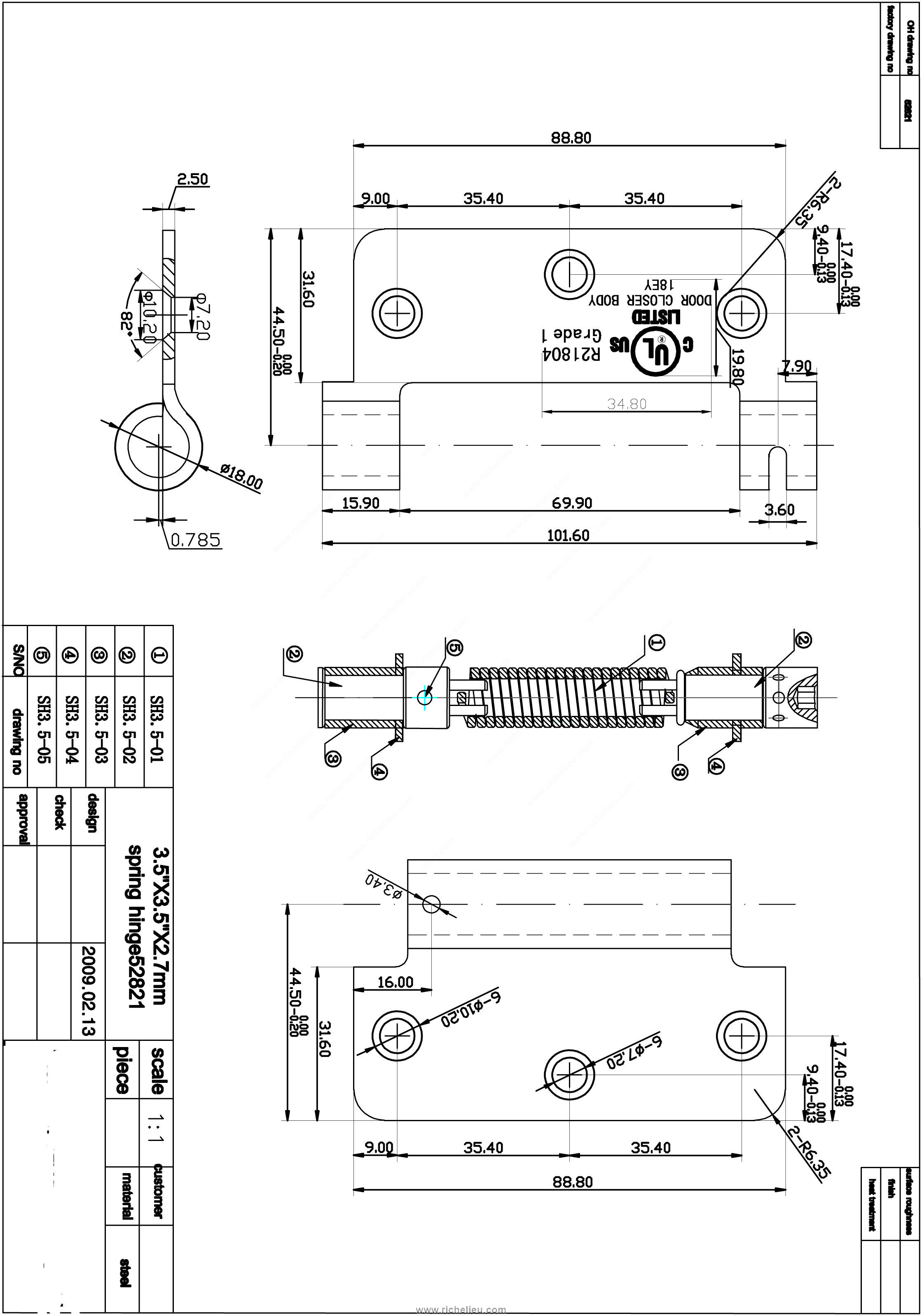 Richelieu 52821BCR 3 1/2" Full Mortise Adjustable Spring Hinge is the perfect choice for adding functionality and style to your projects. Designed for standard doors, this hinge features a brushed chrome finish, providing a sleek and modern look that complements various design aesthetics. Constructed from durable steel, it ensures long-lasting performance, while the non-removable pin adds an extra layer of security. One of the standout features of this hinge is its adjustable spring tension, allowing you to customize the closing speed of your door easily. With the included pin, you can achieve the desired tension, providing both convenience and versatility for your applications. The hinge has a load capacity of 88 lbs when using three hinges, making it suitable for a range of door sizes. Mounting is straightforward, as this full mortise hinge comes assembled and includes six wood screws (#10 x 1") and six machine screws (#10-24 x 1/2"). It adheres to UL standards, ensuring safety and reliability. With an overall height and width of 3 1/2", and a 1/4" radius corner, the Richelieu 52821BCR is an excellent choice for those looking to enhance their door hardware with both function and style.