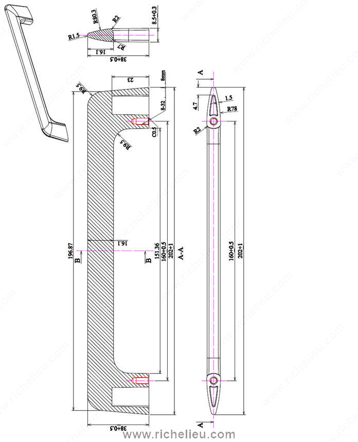 Richelieu 546160195 Modern Metal Pull - 5461 enhances furniture and cabinetry with its sleek design and refined aesthetics. This pull features a streamlined profile with rounded corners and tapered ends, making it an ideal choice for those seeking subtle sophistication in their spaces. With a center-to-center measurement of 6 5/16 inches, it fits perfectly in various applications, whether in kitchens, bathrooms, or living areas. The pull is crafted from durable Zamak, ensuring longevity while retaining its elegant appearance. The brushed nickel finish offers a contemporary touch, complemented by the stylish gray and chrome color scheme, making it versatile enough to pair with various styles and materials. Measuring an overall length of 7 15/16 inches and a projection of 1 1/2 inches, this pull is not only functional but also contributes to the overall design of your cabinetry. For installation, it requires 8/32 inch screws (not included), making it a straightforward addition to any project. Ship via UPS, the Richelieu 546160195 is a practical choice for building professionals and homeowners alike, merging functionality with modern design to elevate any space effortlessly.