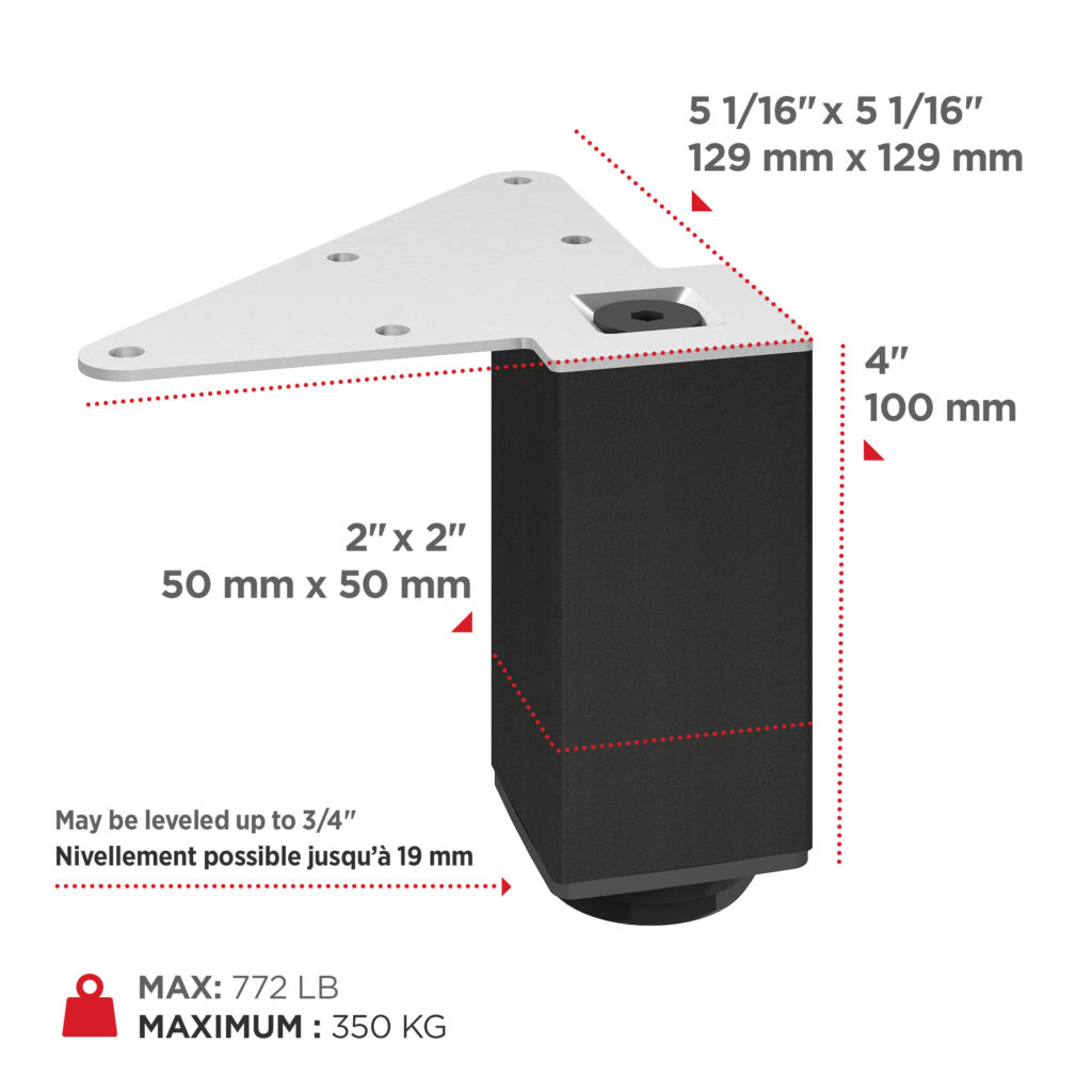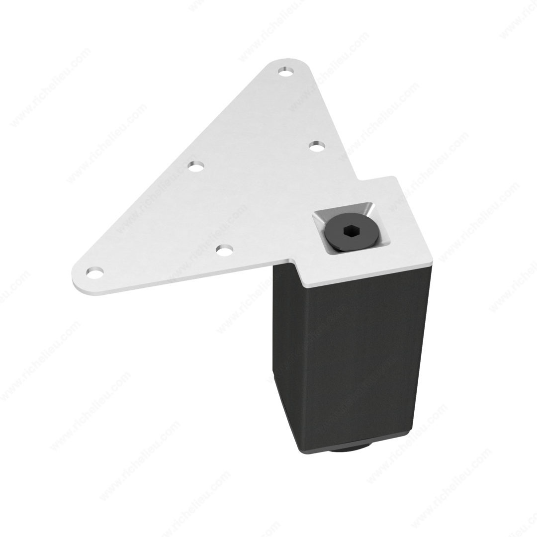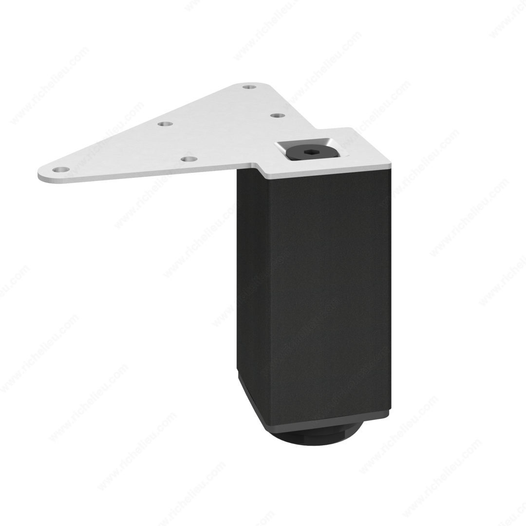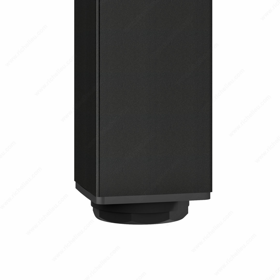 Richelieu 555100900 Adjustable Furniture Leg 555Richelieu 555100900 Adjustable Furniture Leg - 555 adds a touch of modern elegance to any space, enhancing the aesthetic of your kitchen, bathroom, living room, or bedroom. Constructed from durable metal, these heavy-duty legs offer robust support for various furniture pieces, including cabinets, sideboards, vanities, nightstands, and small tables, making them a versatile choice for your home. Available in a sleek matte black finish, the legs come in a square shape with a base dimension of 49 mm x 49 mm, providing a refined look when mounted flush with the corners of your furniture. Each leg boasts an impressive load capacity of 772 lb, ensuring stability and reliability for your belongings. Designed for practicality, the Richelieu adjustable furniture legs feature levelers that allow height adjustments of up to 3/4 inch, accommodating uneven floors with ease. The complete set includes four legs, along with essential mounting plates, bolts, and an Allen key for straightforward installation. Whether you are renovating or building from scratch, Richelieu's adjustable furniture legs are an ideal solution for combining functionality with style, making them a must-have for any building professional or discerning homeowner.