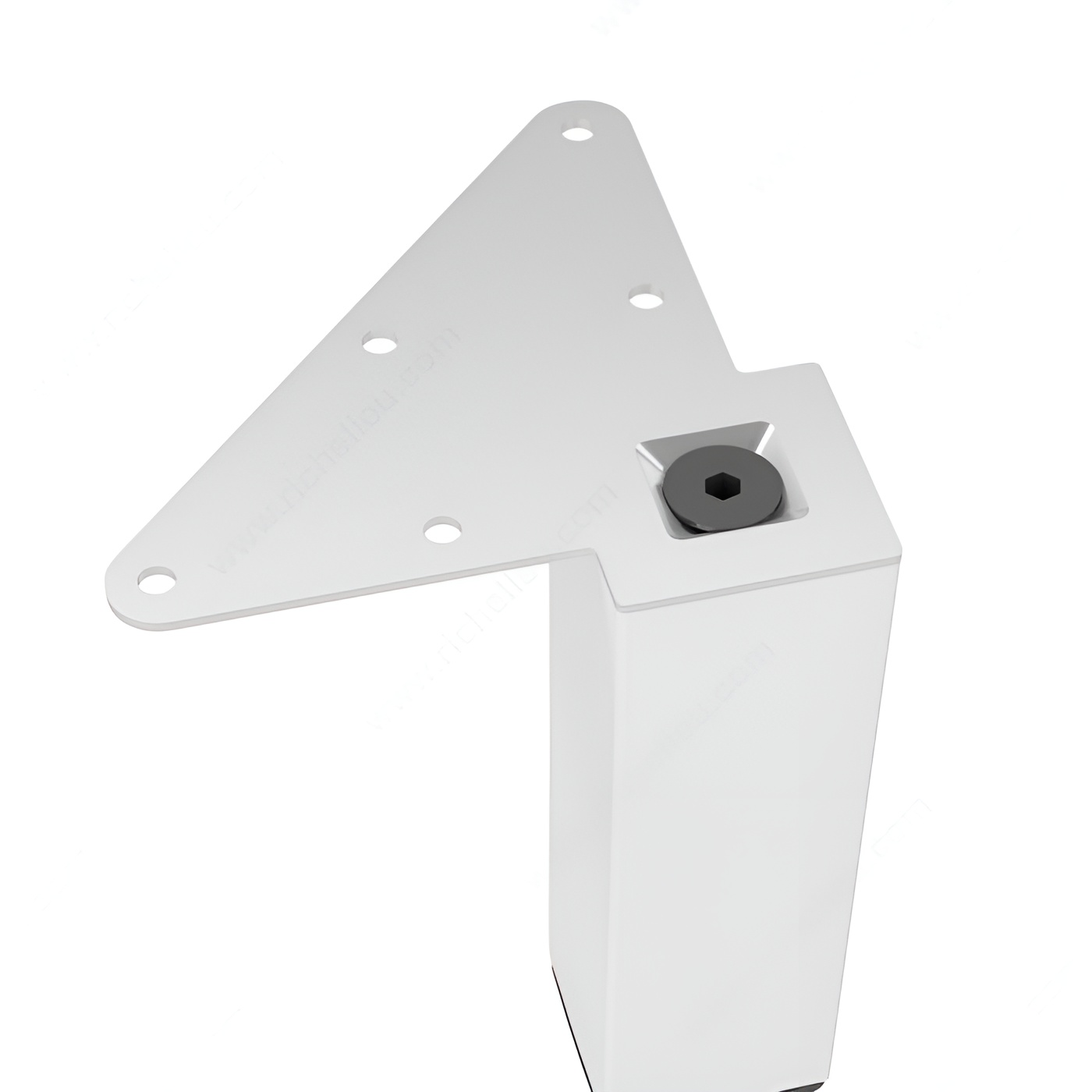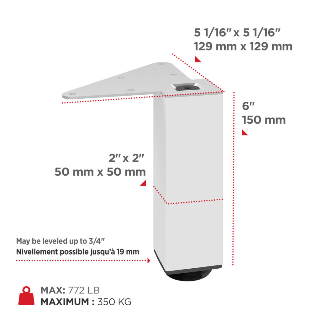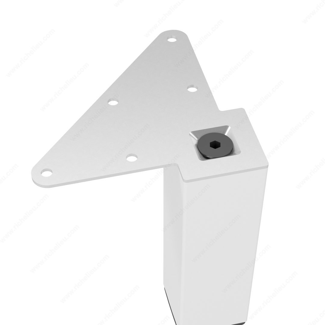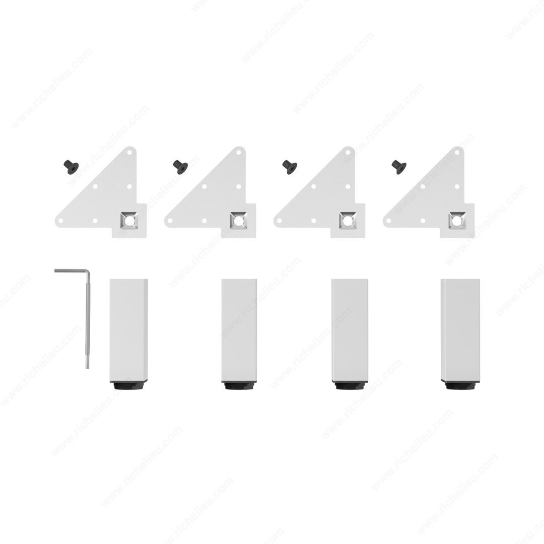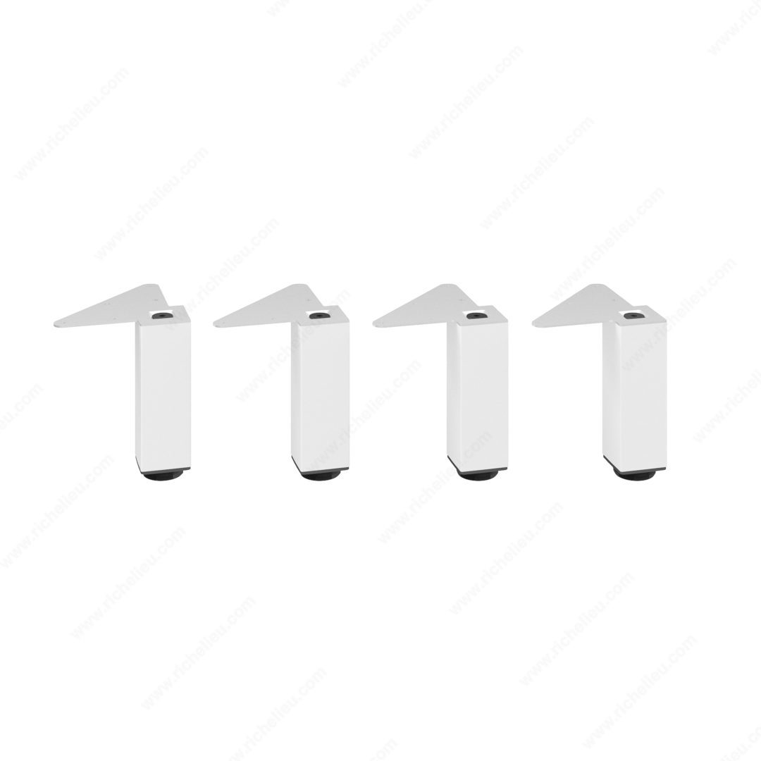 Richelieu 555150300 Adjustable Furniture Leg 555Richelieu 555150300 Adjustable Furniture Leg - 555 combines modern elegance with exceptional strength, making it a versatile addition to various living spaces, including kitchens, bathrooms, and bedrooms. Crafted from durable metal, each leg boasts a matte white finish that effortlessly complements any decor style. Designed for heavy-duty support, these legs can hold up to 772 lbs each, providing a sturdy foundation for cabinets, sideboards, vanities, nightstands, and small tables. Sold as a set of four, the legs can be mounted flush with the corners of your furniture, creating a refined and seamless appearance. Featuring an adjustable height capability of up to 3/4", the included levelers ensure stability on uneven floors, making installation a breeze. Each leg has a base dimension of 49 mm x 49 mm and a height of 5 29/32 inches, while the mounting plates measure 129 mm x 129 mm, allowing for straightforward attachment. Whether you're renovating or just looking to upgrade your furniture, Richelieu's Adjustable Furniture Legs offer both style and functionality, making them an ideal choice for building professionals and discerning homeowners alike. Transform your space with these stylish and durable legs that promise to enhance the aesthetics of any room.