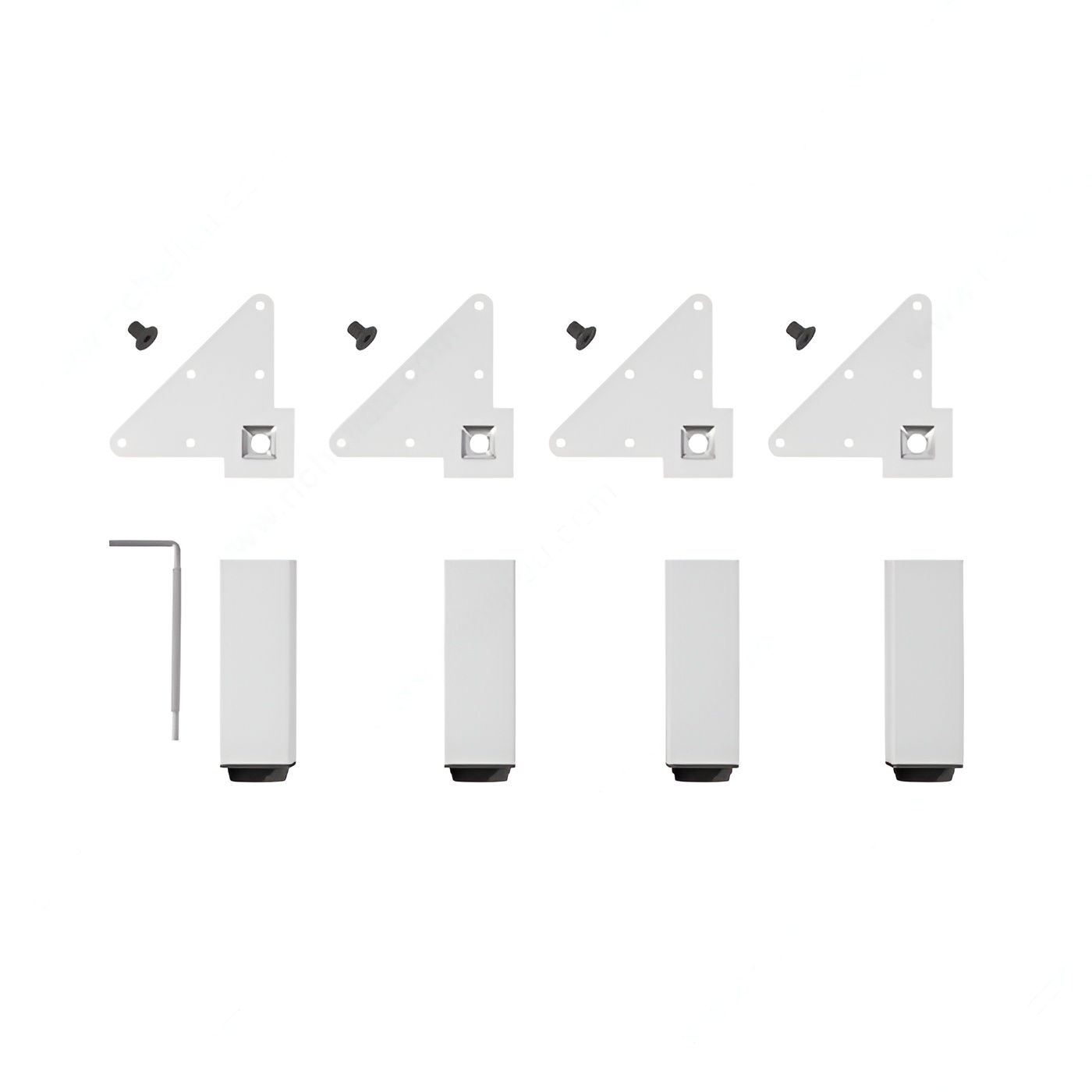 The legs come with levelers that allow you to adjust the legs' height up to 3/4" on uneven floors. Mounting plates, bolts, and an Allen key are included for easy installation.