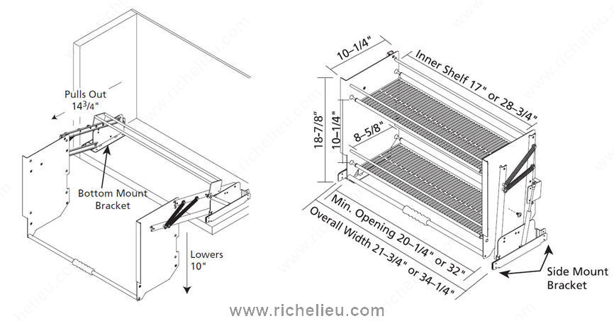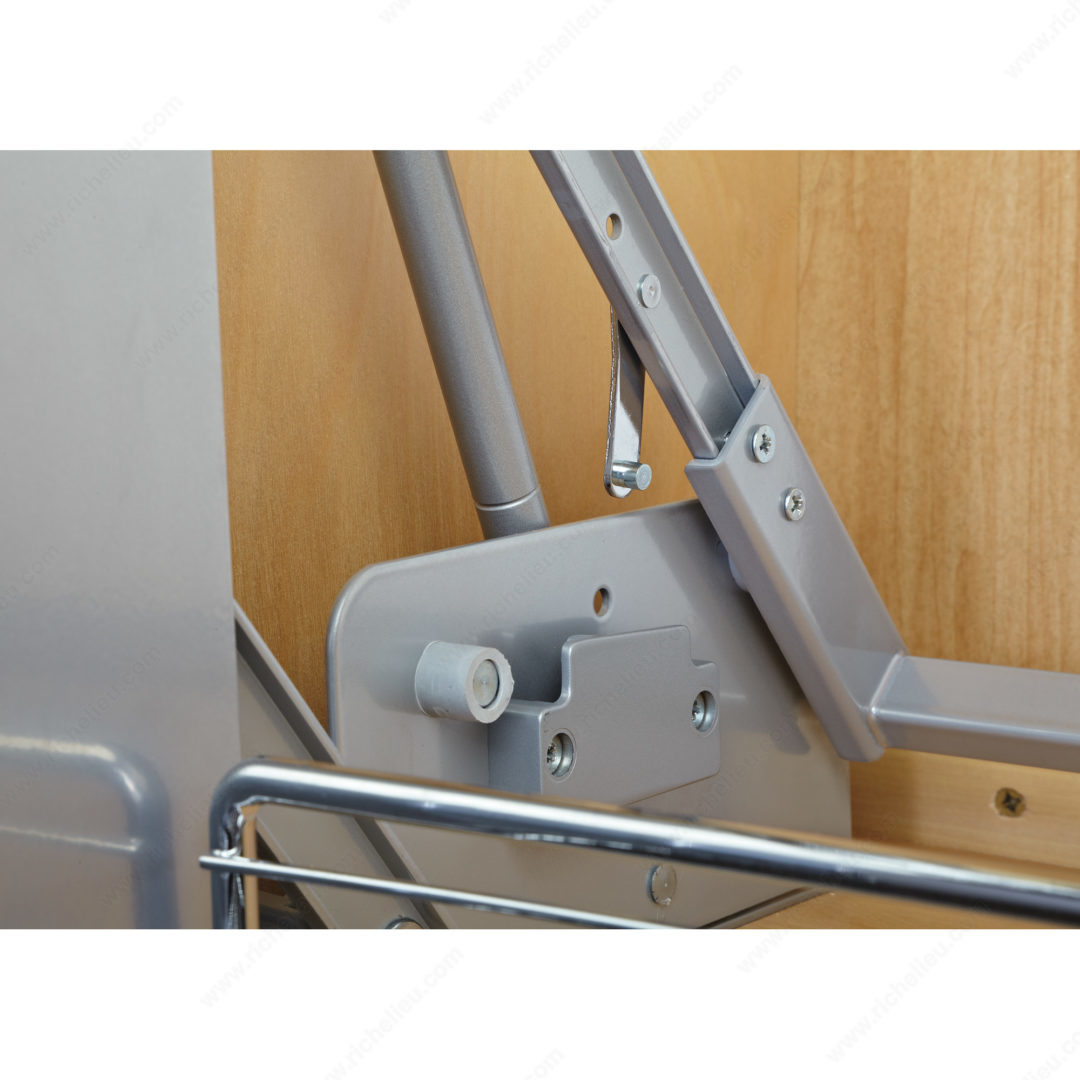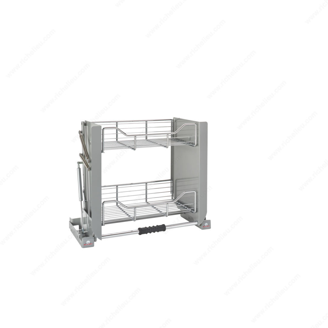 Richelieu 5PD24CRN Rev-A-Shelf pull-Down Shelf offers a revolutionary solution for accessing items in high wall cabinets with ease. This two-tier pull-down shelf system smoothly lowers hard-to-reach items a full 11 1/2 inches (292 mm) and extends out 16 3/4 inches (425 mm), helping to eliminate the need for improvised stepping stools or chairs. Engineered with a gas-assisted lifting and lowering mechanism, it ensures stability and ease of use throughout its range of motion. Constructed from durable steel, the 5PD24CRN accommodates a maximum capacity of 17 pounds, making it perfect for food storage and preparation. It includes both side and bottom mount brackets, allowing for versatile installation in 24-inch (609.6 mm) wide cabinets. The unit's polished chrome finish and gray accents add a touch of modern elegance to your kitchen. To maximize functionality, ensure a minimum opening face frame width of 21 inches and a minimum opening frameless width of 22 1/2 inches. The interior dimensions required include a minimum depth of 10 3/4 inches and a height of 18 5/8 inches. Upgrade your kitchen with the Richelieu 5PD24CRN pull-down shelf and experience convenience at your fingertips.