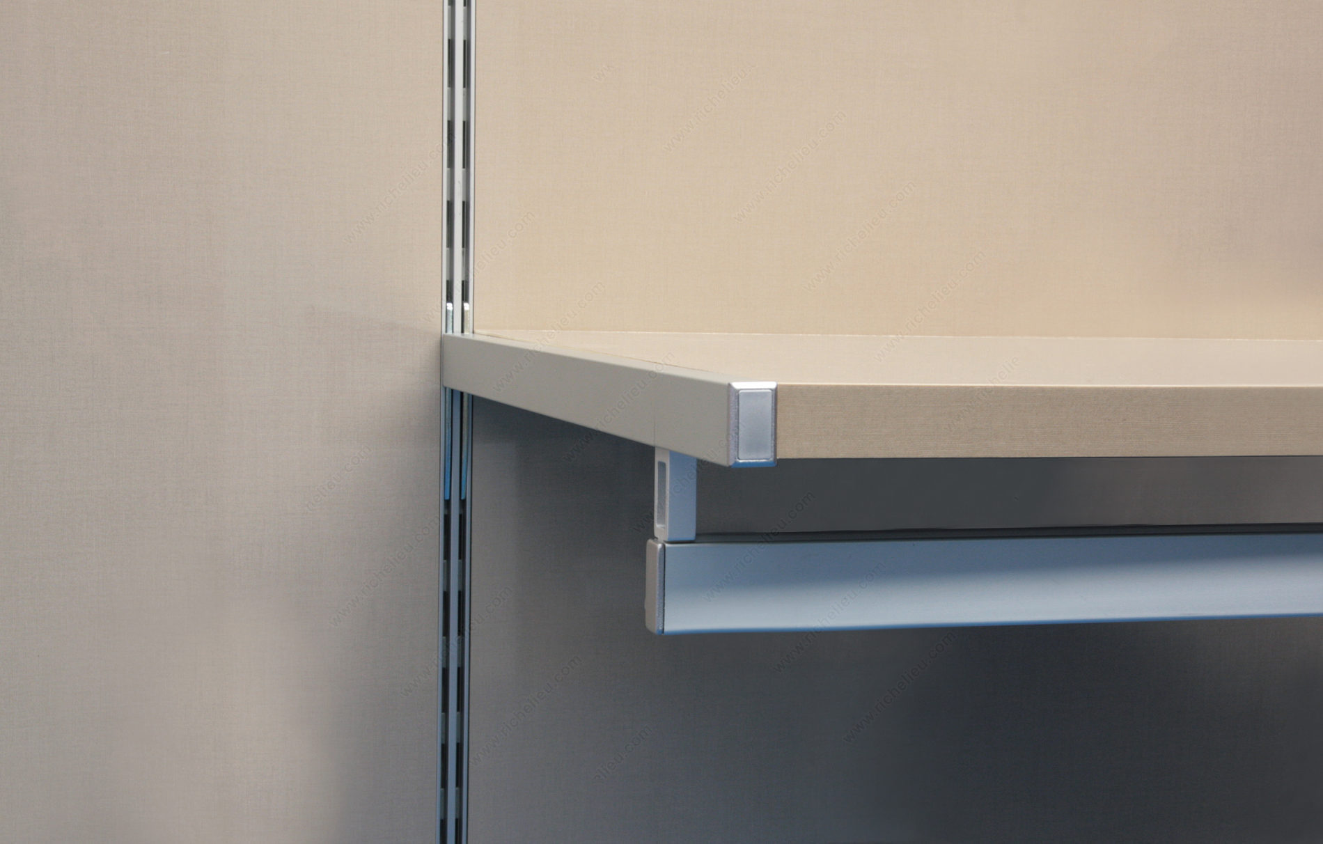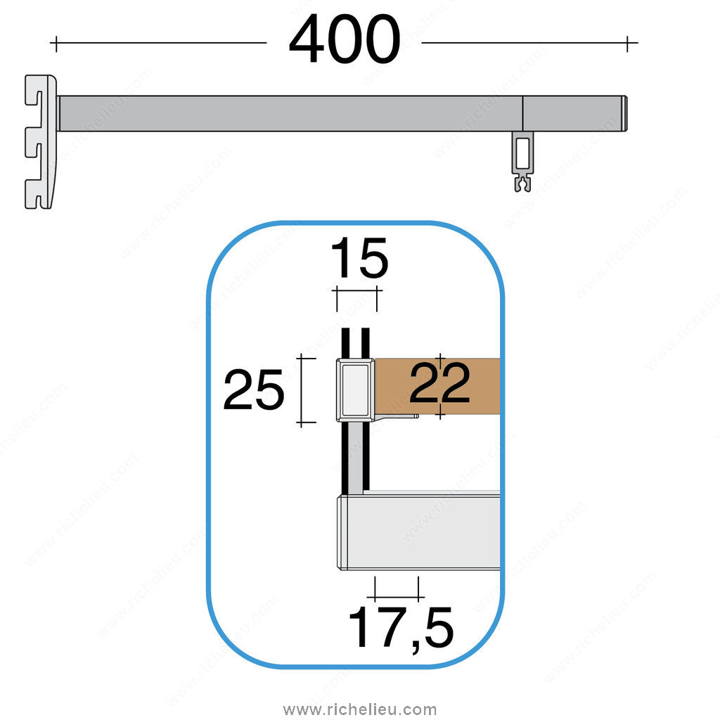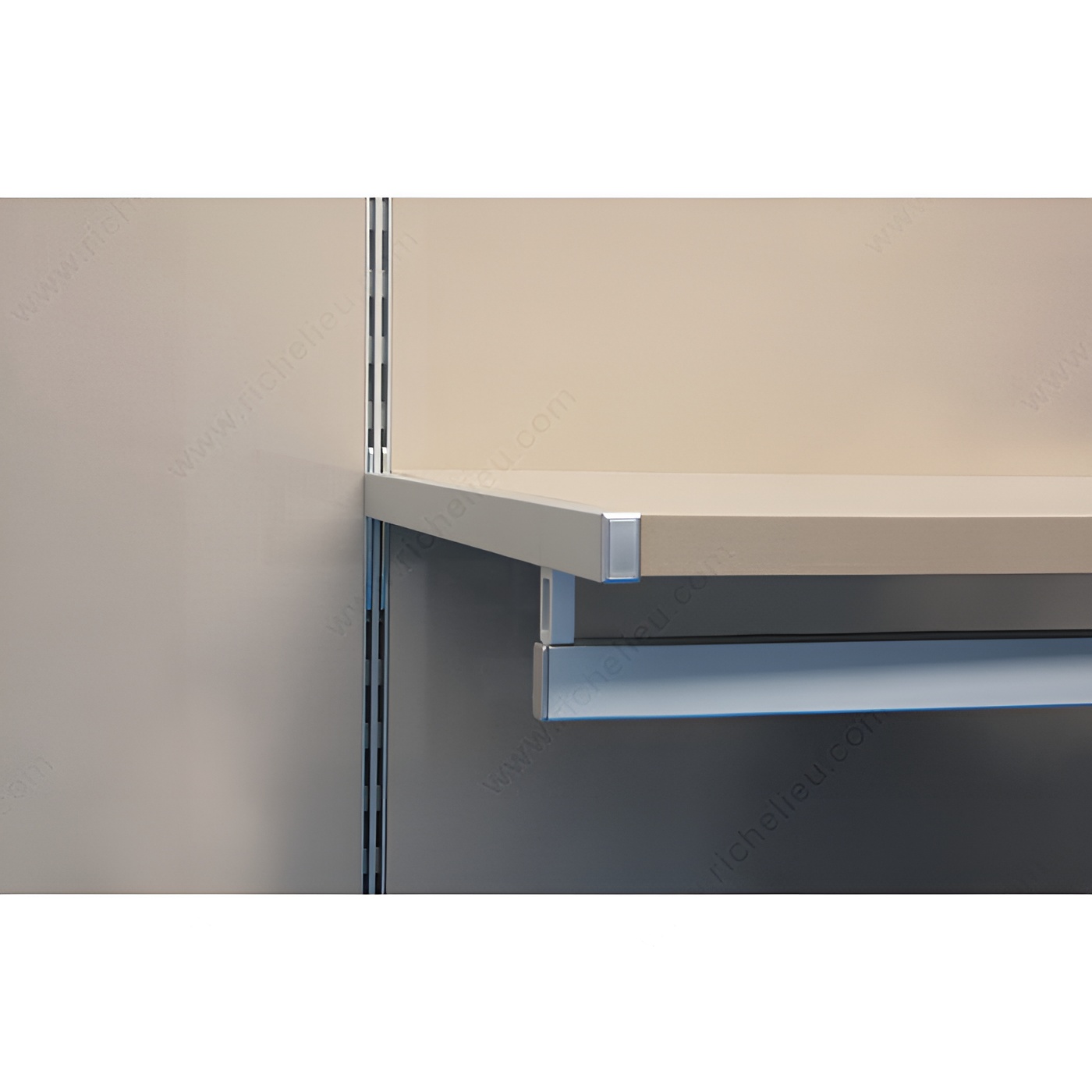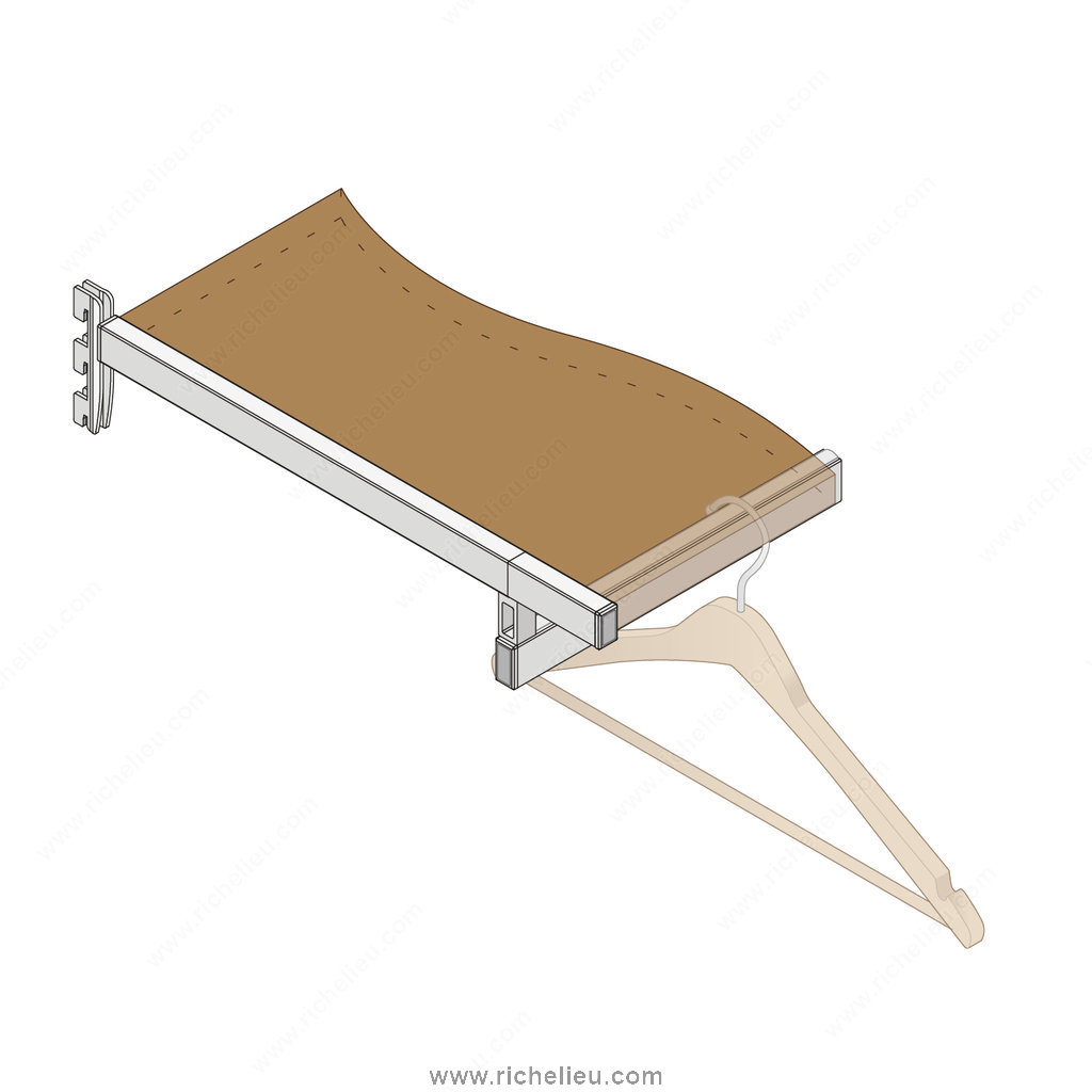 Richelieu 6222DS40A10 Undermount Vertical Double-Insert Shelf Support offers a robust solution for your shelving needs, specially designed for 22 mm thick wood shelves. This rectangular support is engineered for installation on vertical slotted profiles, ensuring a secure and stable fit. The support boasts a satin aluminum finish, enhancing both durability and aesthetics, making it suitable for various environments. With a substantial load capacity of 132 lb, this undermount support is perfect for holding heavy items while maintaining a sleek profile. Crafted from anodized aluminum, it combines strength with a lightweight design, making installation straightforward and efficient. The dimensions include a length of 15 3/4 inches and a panel thickness of 7/8 inches, making it versatile enough for different applications. Designed specifically for the left side of your shelving system, the Richelieu 6222DS40A10 is ideal for use with hang rails, offering a specialty feature that enhances its functionality. It ships conveniently via UPS, ensuring that you receive your products in a timely manner. Whether you are a building professional or a knowledgeable homeowner, this shelf support is an excellent choice for maximizing your storage solutions with style and strength.