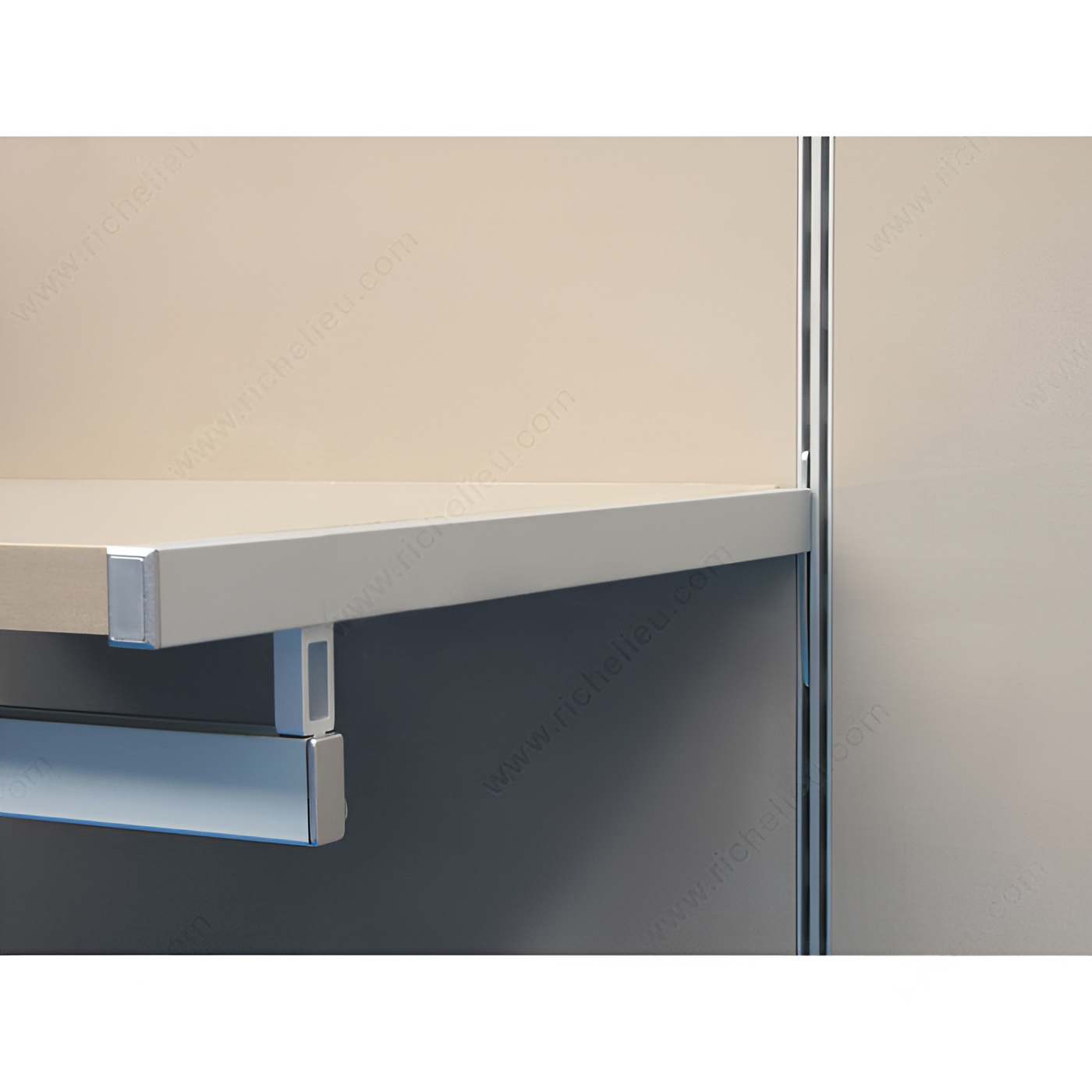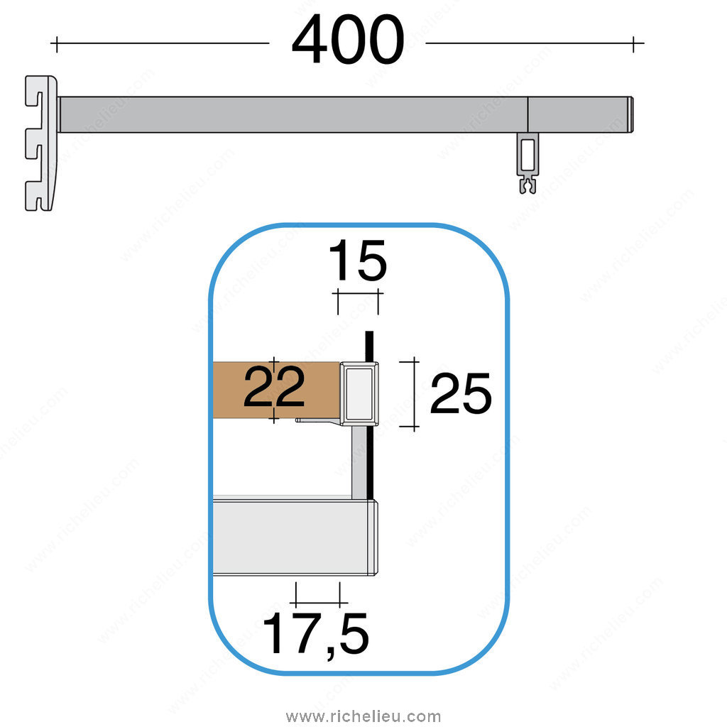 Richelieu 6222LD40A10 Undermount Vertical Single-Insert Shelf Support is designed to provide reliable support for your shelving needs. Crafted from durable anodized aluminum, this shelf support features a sleek satin finish that enhances any interior aesthetic. With a length of 15 3/4 inches and a load capacity of 66.1 pounds, it can accommodate a variety of shelving applications while ensuring stability and strength. This vertical configuration is specifically designed for right-side installation, making it an excellent choice for spaces where maximizing vertical storage is essential. The slotted function allows for easy adjustments and flexibility in shelf placement, catering to dynamic storage requirements. It is suitable for panels with a thickness of 7/8 inch, ensuring compatibility with a range of shelving materials. Perfect for use with hang rails, the Richelieu 6222LD40A10 is an ideal solution for both professional and residential settings. Whether you are organizing a kitchen, office, or workshop, this shelf support will meet your needs with style and functionality. Plus, it ships conveniently via UPS, making it easy to incorporate into your next project. Choose Richelieu for quality and reliability in your architectural metal needs.