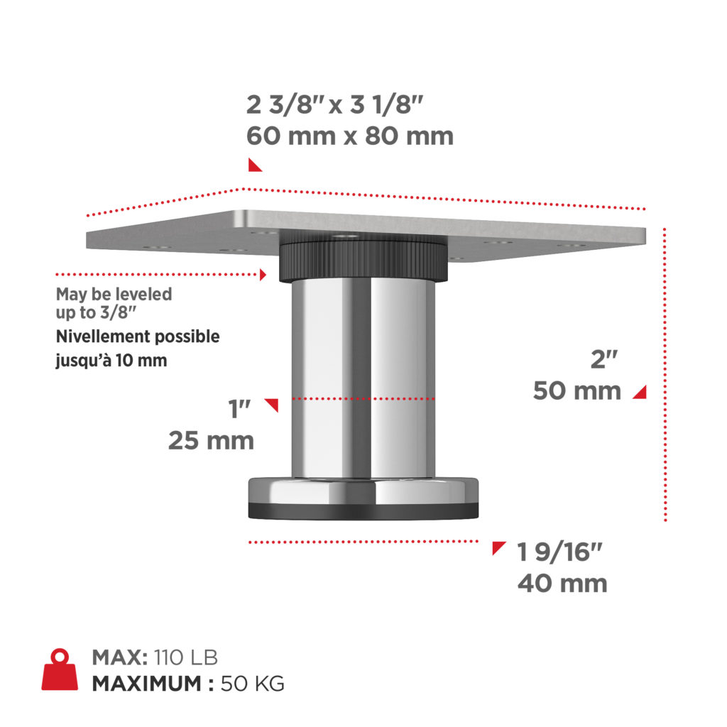 Richelieu BORSA - Adjustable Furniture Leg 64217050140 offers a versatile solution for enhancing the aesthetics and functionality of your furniture. Crafted with a sleek industrial design, these sturdy legs are ideal for use in bedrooms, living rooms, and bathrooms, seamlessly complementing a variety of decor styles. The round shape of the BORSA legs adds a contemporary touch to dressers, bathroom vanities, nightstands, and TV stands, ensuring a cohesive look throughout your space. Available in a polished chrome finish, these legs not only deliver style but also durability, thanks to their construction from high-quality Stainless Steel 201. Each leg can support up to 110 lbs, making them a reliable choice for various furniture pieces. The adjustable height feature allows you to level the legs on uneven surfaces, providing an adjustment range of up to 3/8". With a base diameter of 1 9/16 inches and a height of 1 31/32 inches, the BORSA legs are designed for easy installation, ensuring a hassle-free upgrade for your home. Their plate dimensions of 80 mm x 60 mm provide added stability, making them an excellent choice for both professional builders and discerning homeowners seeking quality and style in their furniture solutions.
